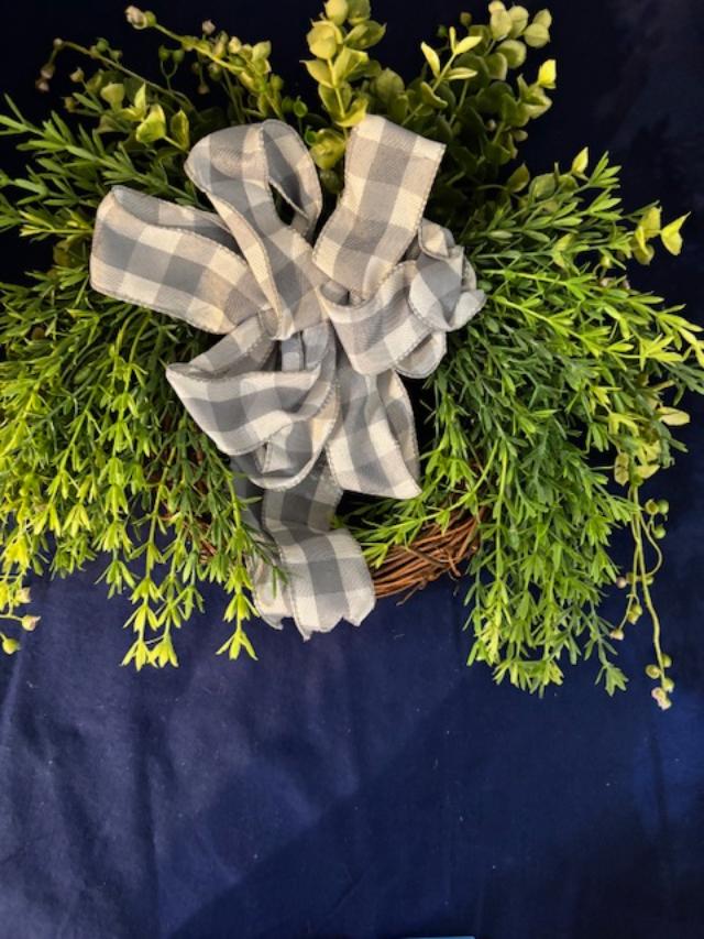 Wreath made of willow twig with plastic greenery and a grey and white checked bow