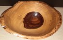 Wooden bowl, light wood with a darker center. It measures 7" by 6" and is 2.5" tall