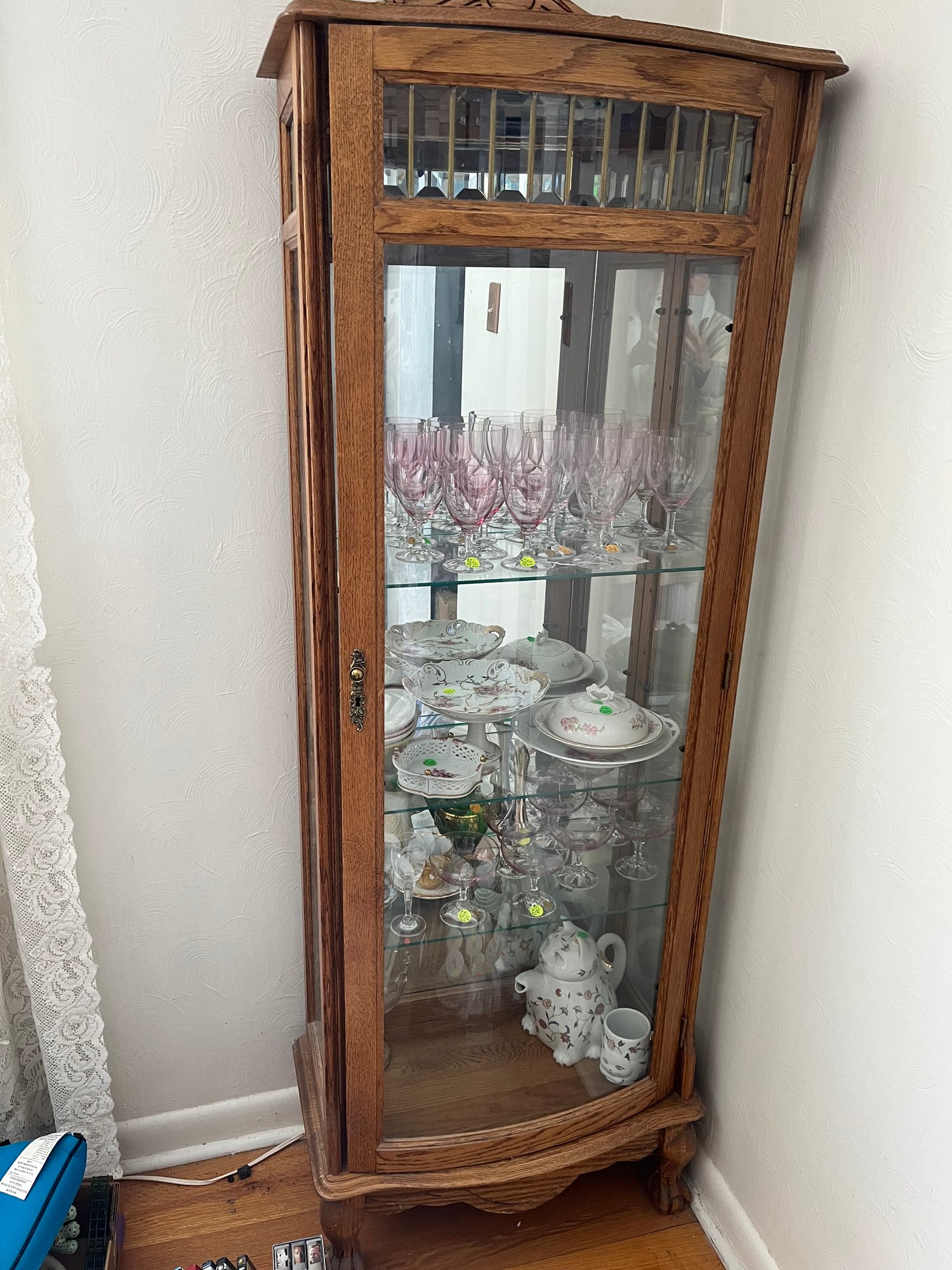 Carved solid oak curio with glass on both sides and curved glass door front. Removable glass shelves. Lighted.