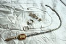 A Sterling silver and cubic zirconium ring size 6, a 925 silver mother daughter necklace 20" long, 2 pairs of cubic zirconium studs, and a vintage cameo pendant, 23" long.