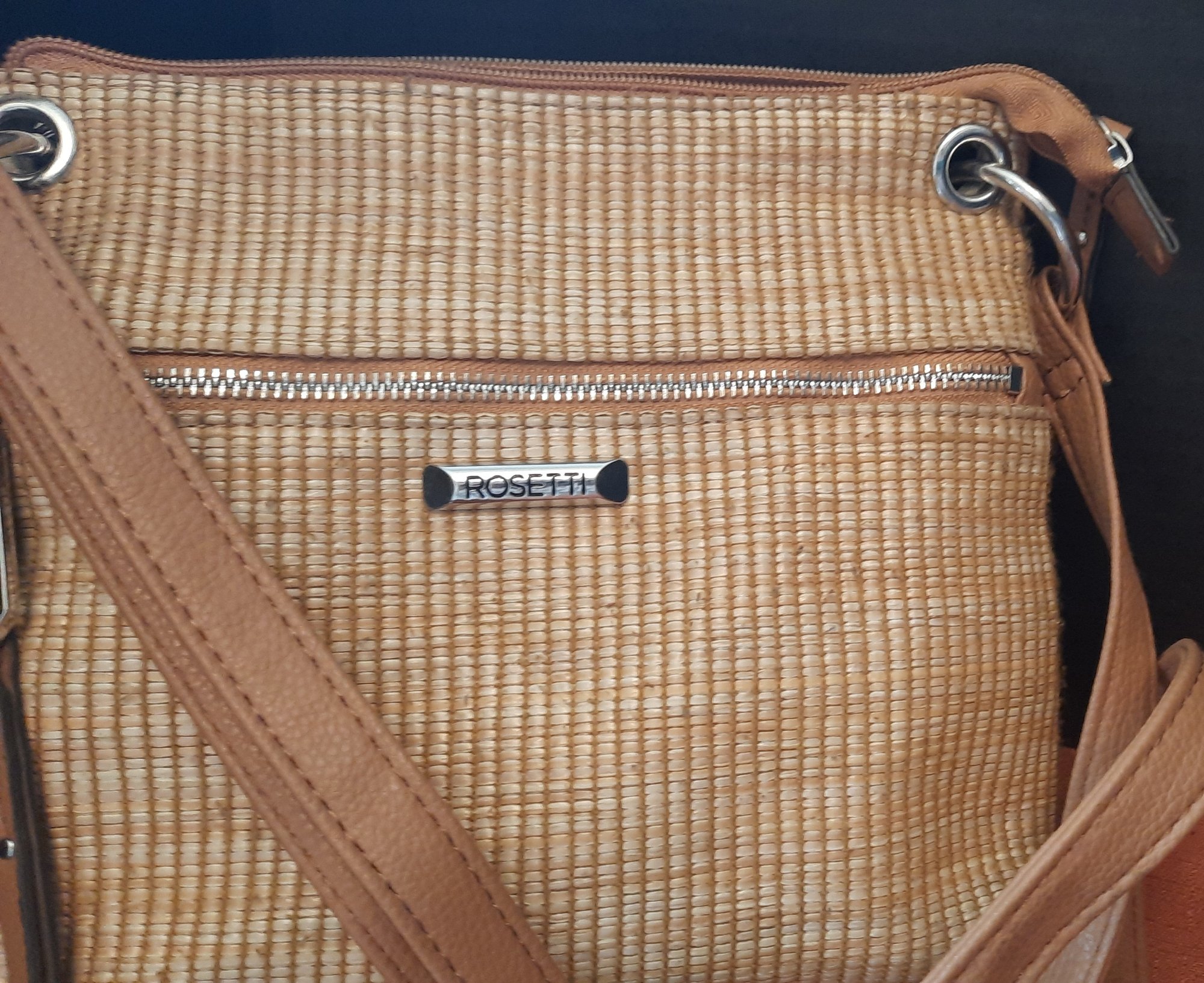 Great handbag by Rosetti. Two outside pockets with an additional three pockets inside.t This handbag has a long adjustable strap. It measures 9 "long and 10" across