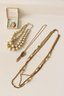 A classic jewelry lot with 3 necklaces and 1 brooch. The broach is a hand carved shell marcasite brooch feathering The Graces, made in Italy, can double as a pendent and is stamped 800 silver. A chunky double chain faux pearl necklace, 17", an elegant gold toned and rhinestone loop necklace, 16.5", and a long Tri-robe gold toned and faux pearl draping necklace, 29". These items can be shipped.