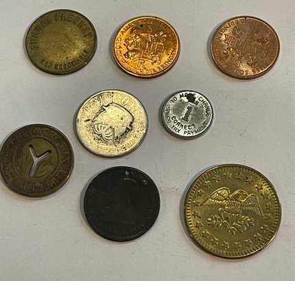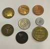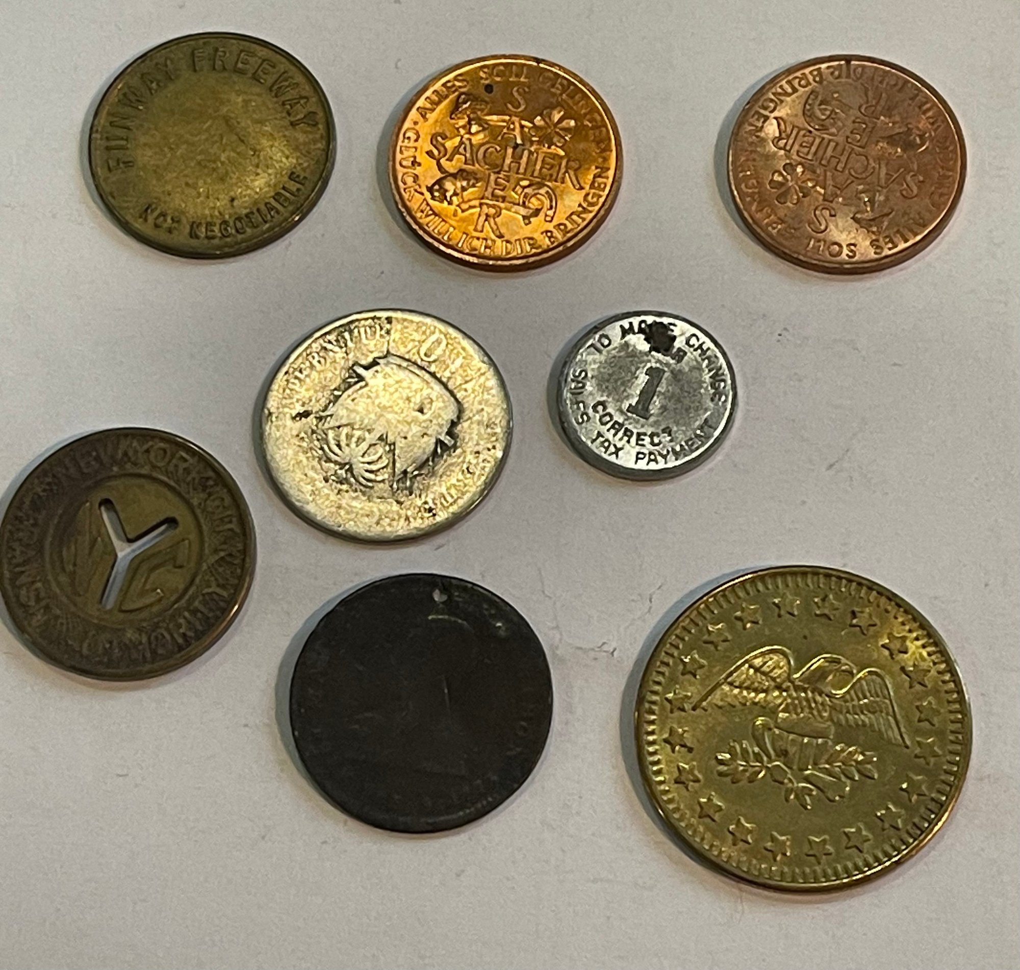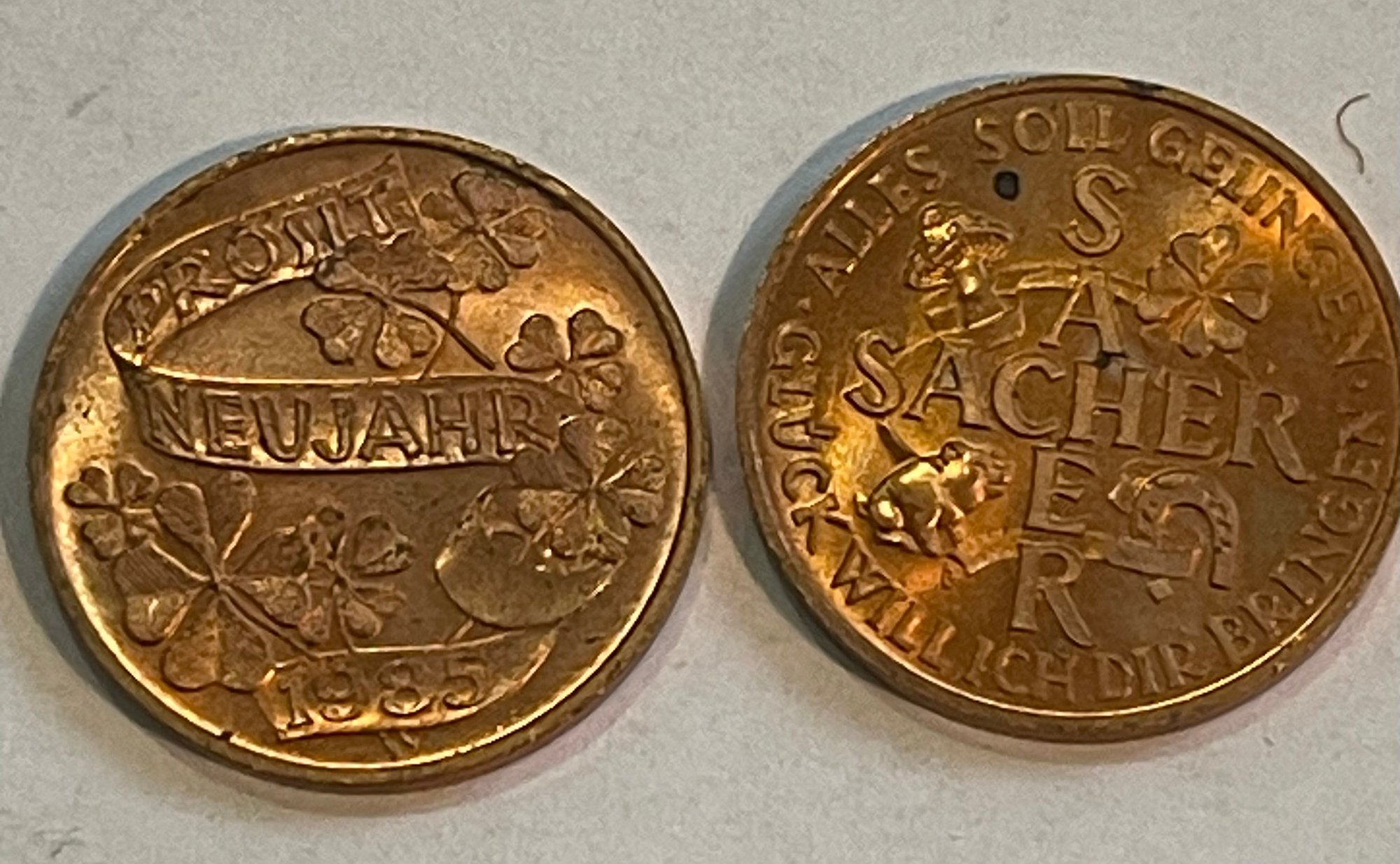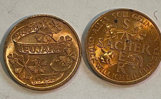 2 German New Year’s “Goid Luck “ coins, tokens, and very worn coins.