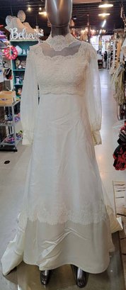 Off-white wedding gown with elegant details, including tiny buttons up the back and a train. Appears to be a size 8. Bust= 34 inches, waist is loose, 28 inches. Satin, lace trim.