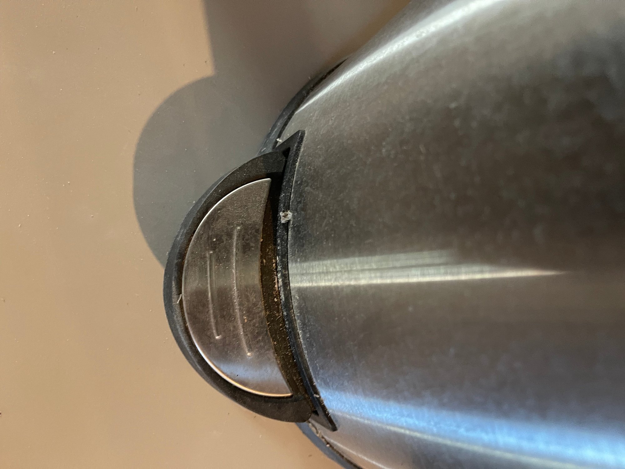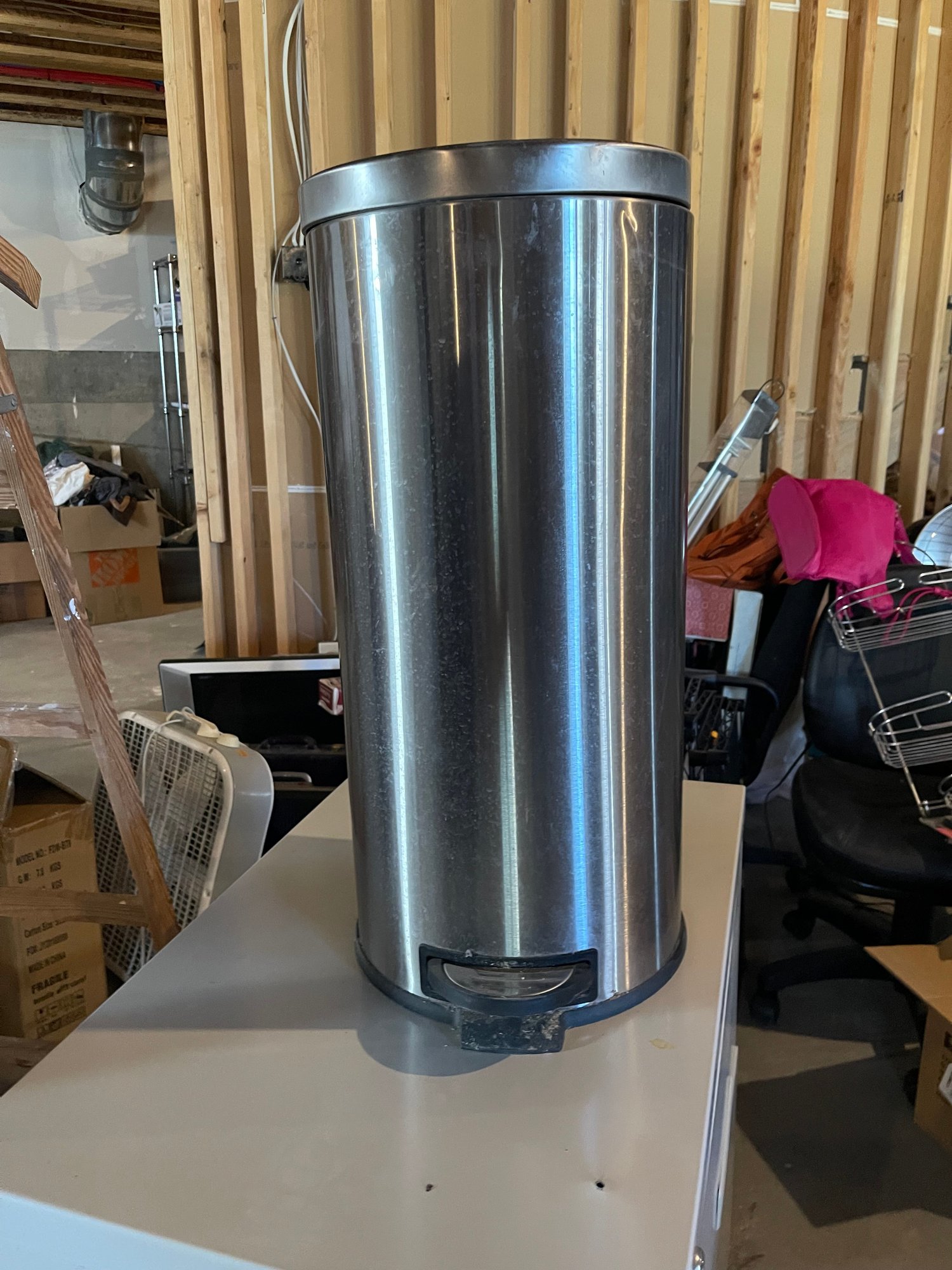 foot pedal to open, brushed steel, 11.5 diameter 24.5 inch high