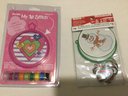 2 small no count cross stitch kits suitable for kids 5 or 6. Kits come with design base, plastic needle, design sheet, and cotton thread. Excellent start for learning how to needle craft. Both Projects are 3 inches. One is hearts and the other is a snowman. Excellent stocking stuffers.