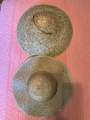 To straw hats in good condition. Both measure 16 inches across and have chin straps. Straw weave intact no holes. Good to block sun, or for your scarecrow creation!