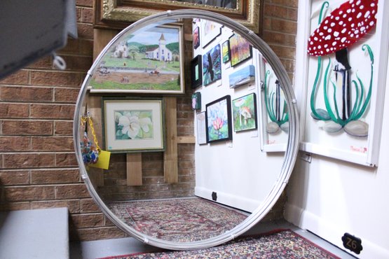 A gorgeous Uttermost Ohmer 40" round contemporary wire framed large wall mirror. This is a well made, weighty and large piece bringing a sophisticated rustic elegance, with its neat wire frame, to any space it is hung. This item is not eligible for shipping.