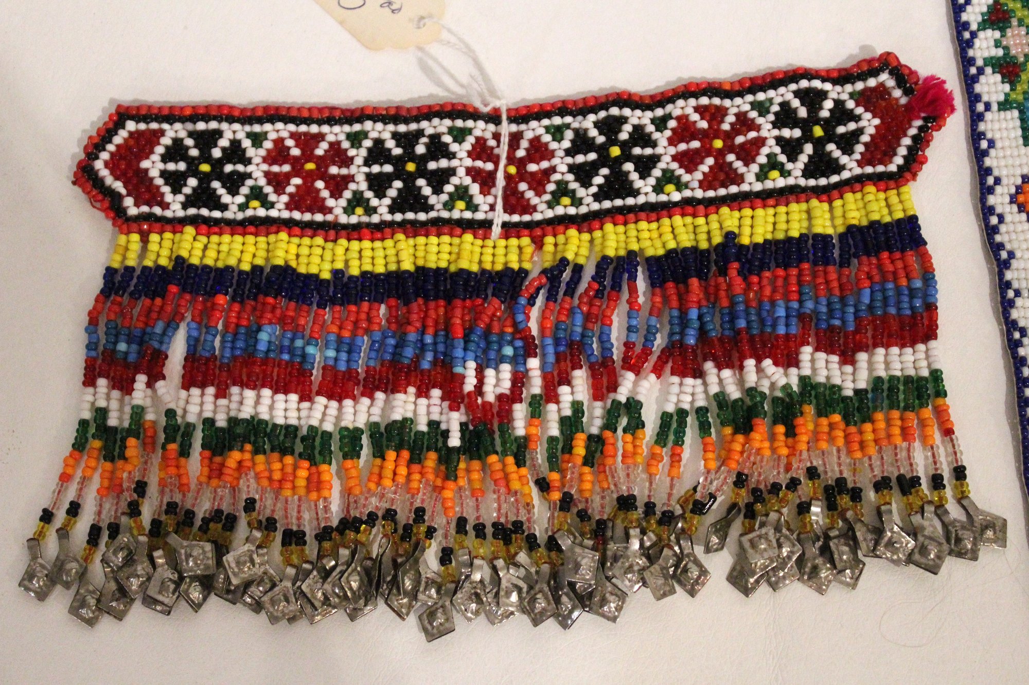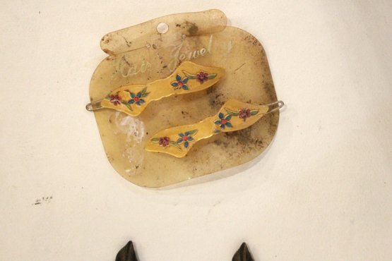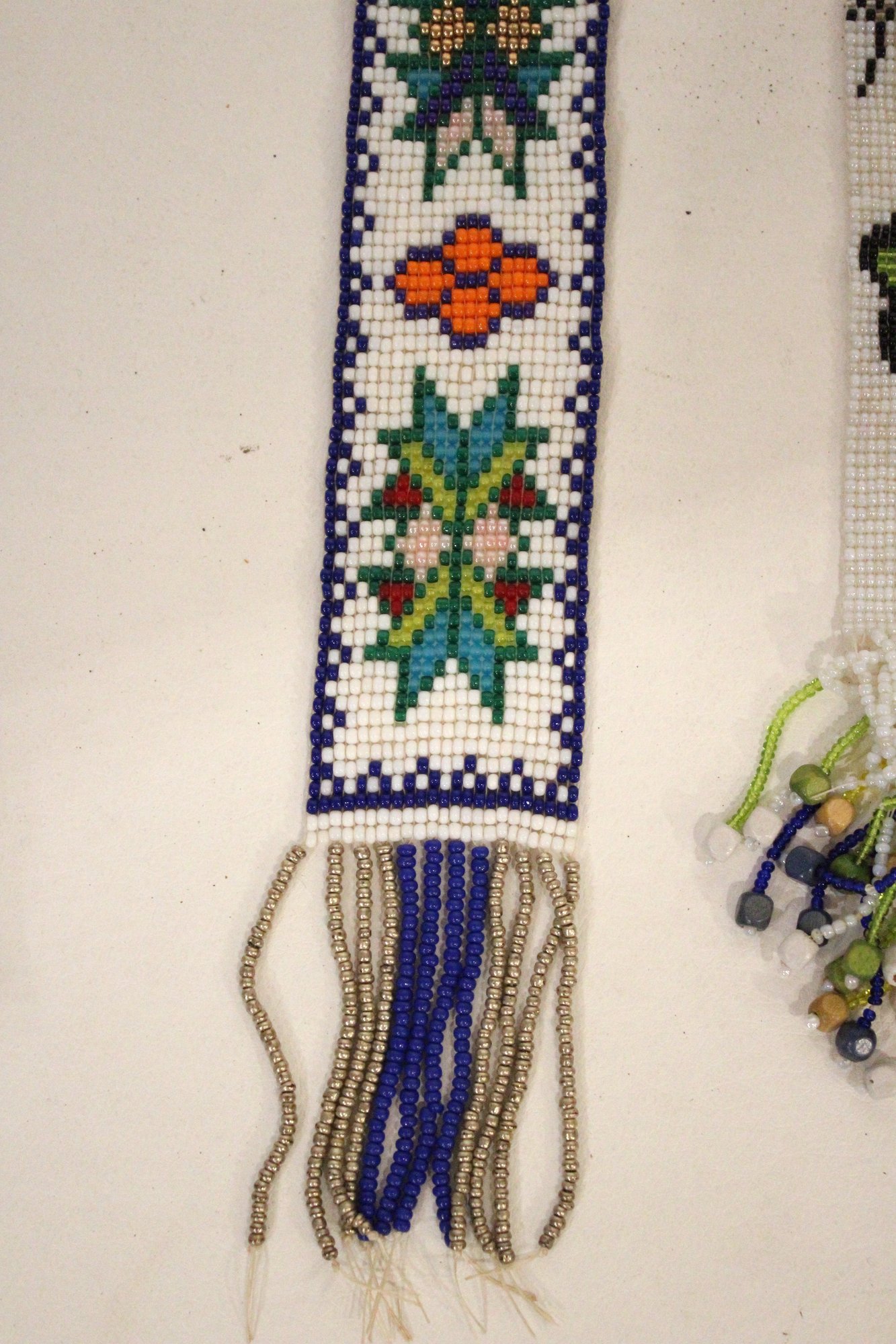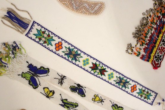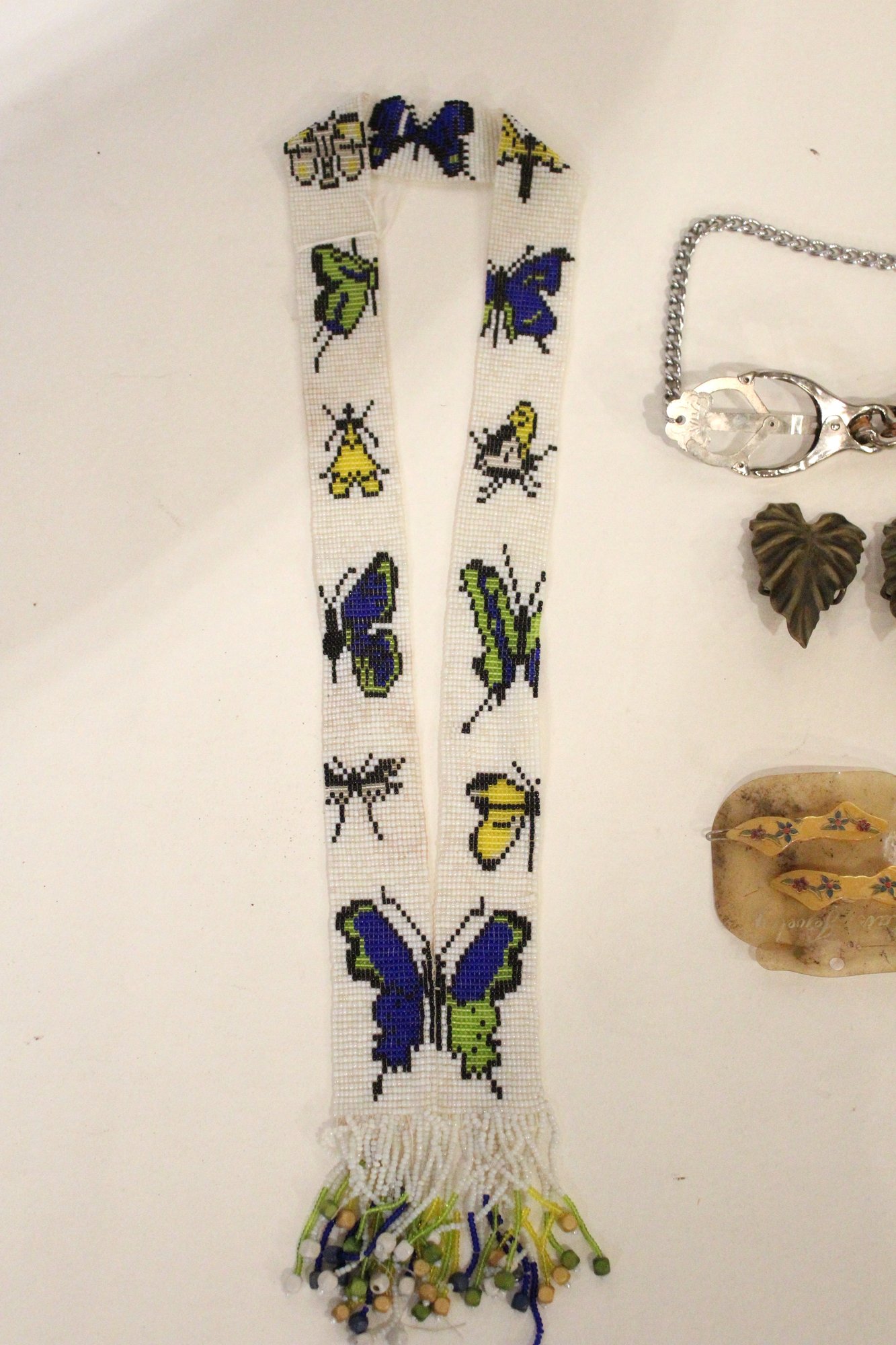 a beaded board 19", a beaded lanyard 17" (one side), 2 clips on a chain, 19" and leaf buckles 3" , 2 hair pins 3". These items can be shipped.