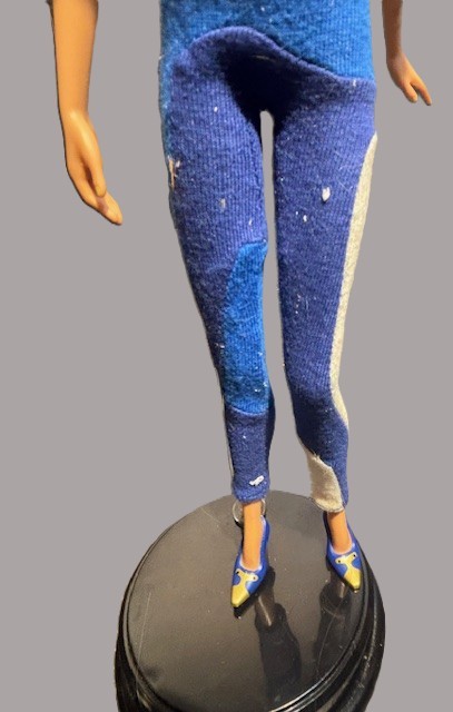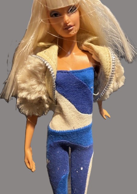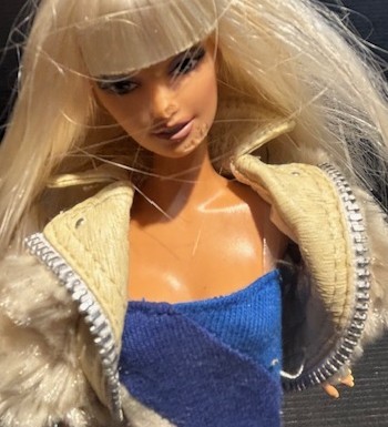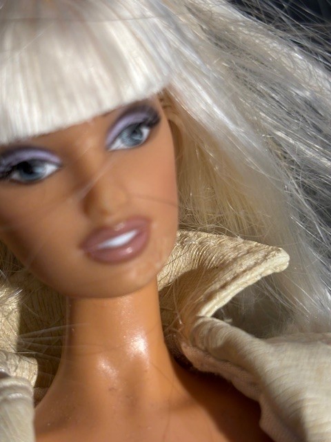 Versus Barbie Versace by Donatella Gold Label 2004. In 1989 Gianni Versace unvield Versus Barbie doll, with more designer clothing. This doll has her original garment on with short fake mink jacket and shoes. Doll has some infractions on her face as shown in pictures. There is no box, doll comes with stand. This item will ship