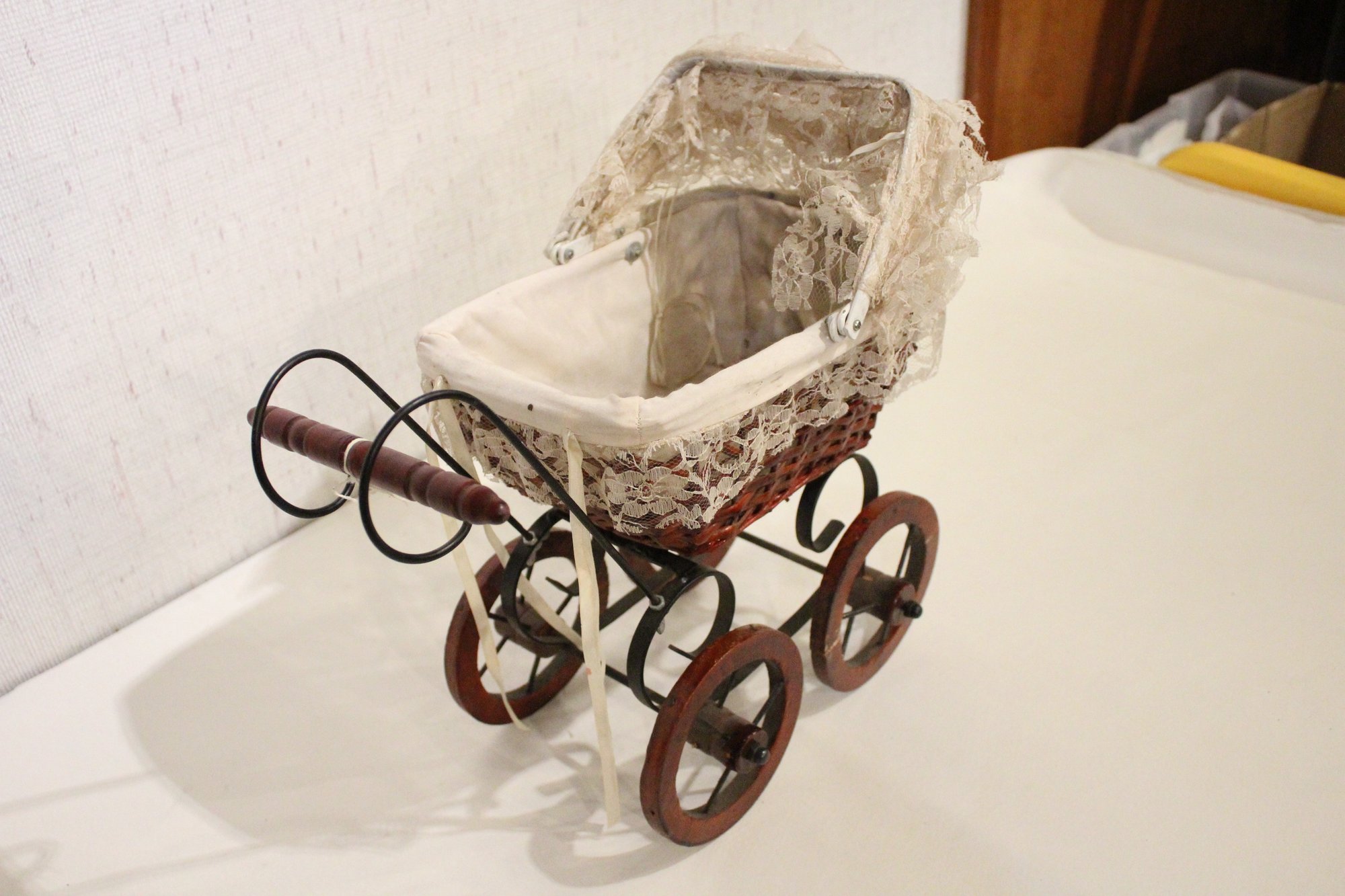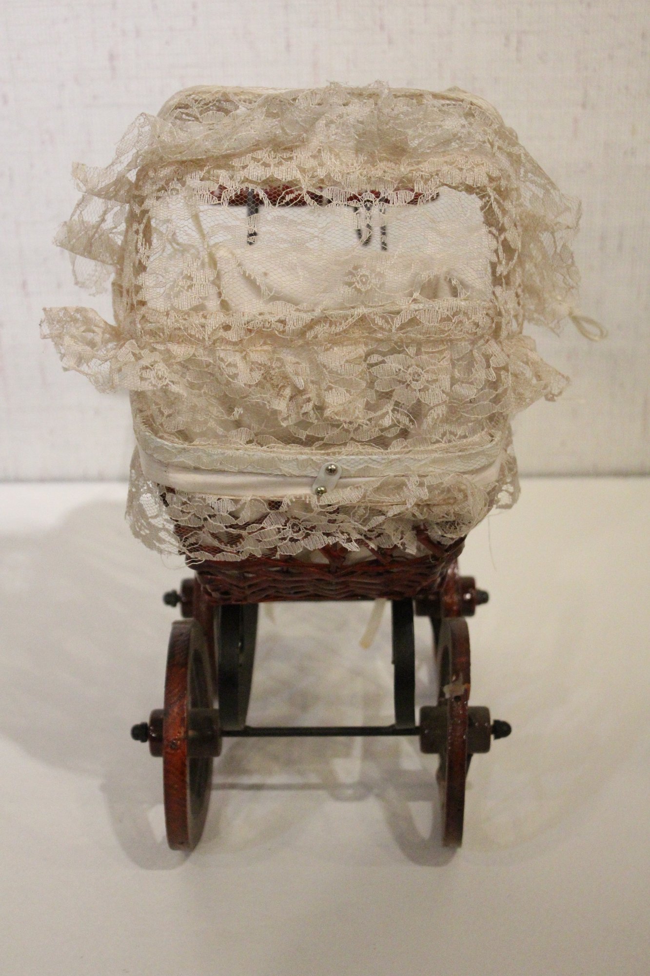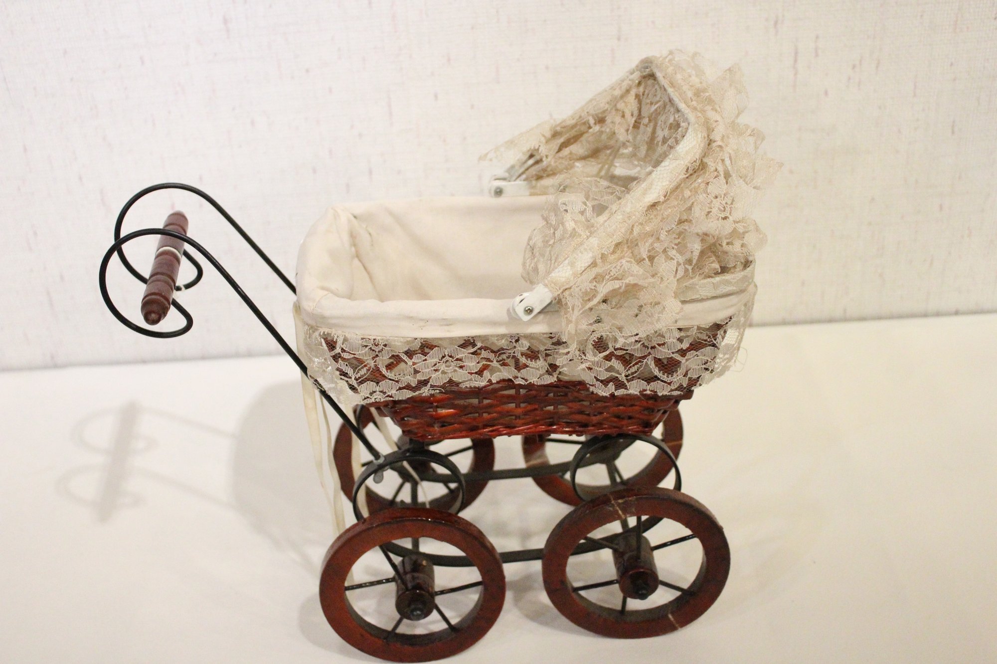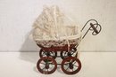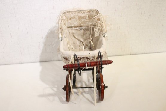 A vintage Victorian style baby doll carriage, 15" x 13" x 9". This item can be shipped