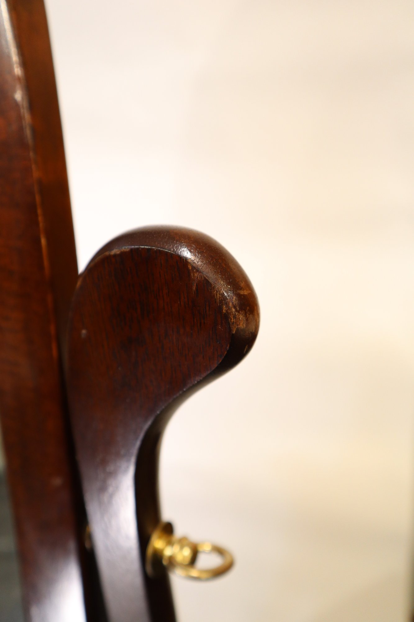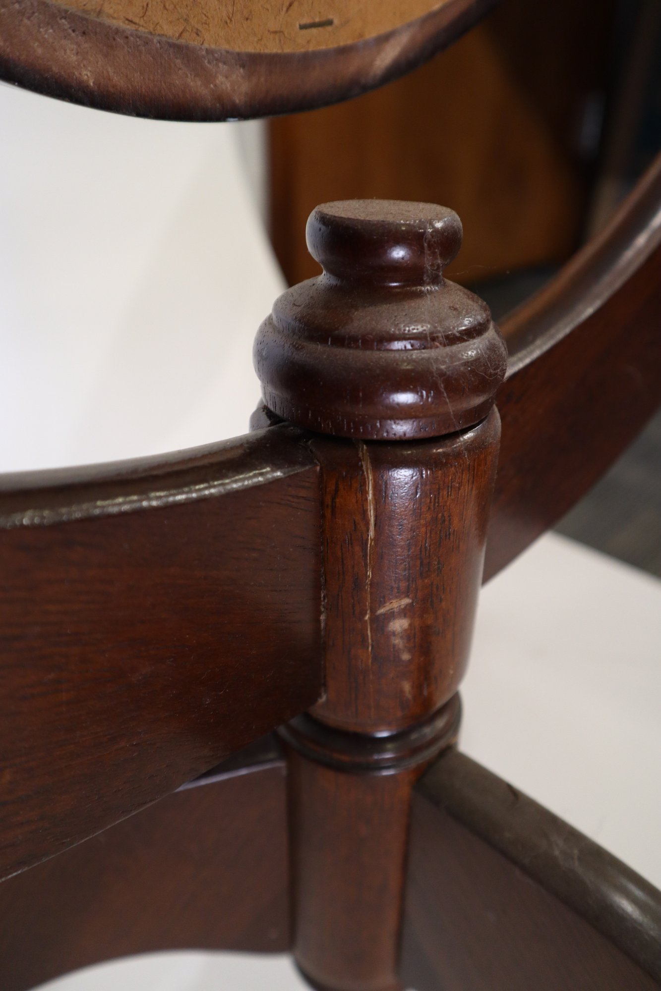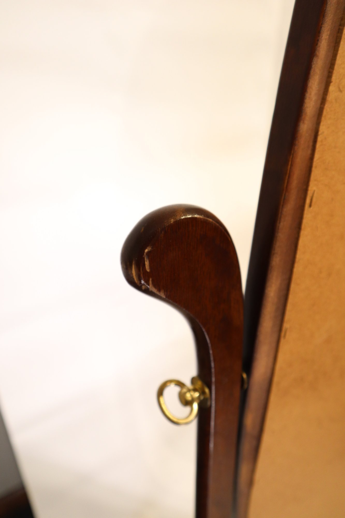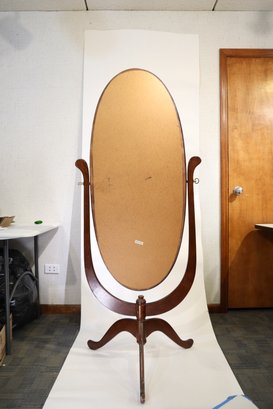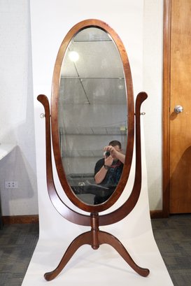An oval shaped cheval mirror, built in a simplified Victorian style. Minor damage to the varnish around edge of the mirror oval and slight signs of wear around feet and mirror supports. The right support is loose, and there is a large crack where it connects to the base, it still supports the weight of the mirror but might require repair before daily use.