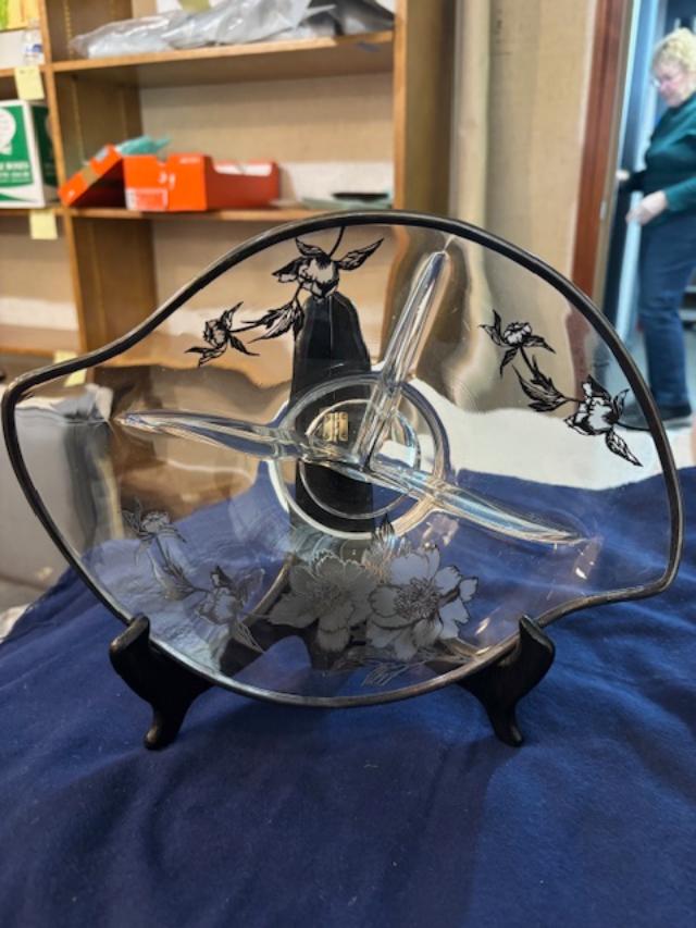 Viking Glass epic oblong bon bon relish dish with three sections and gold like floral flowers.