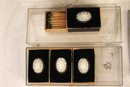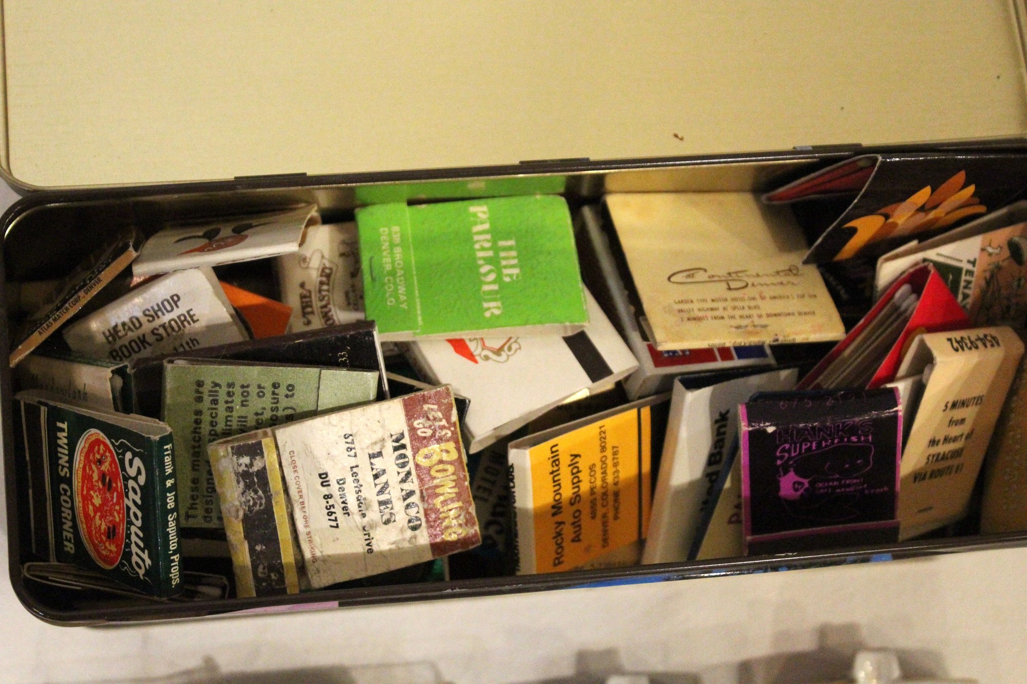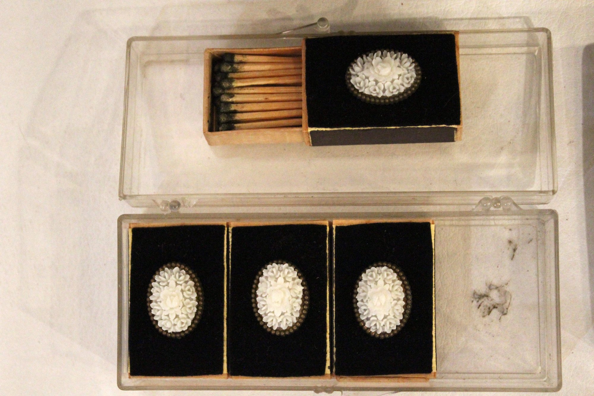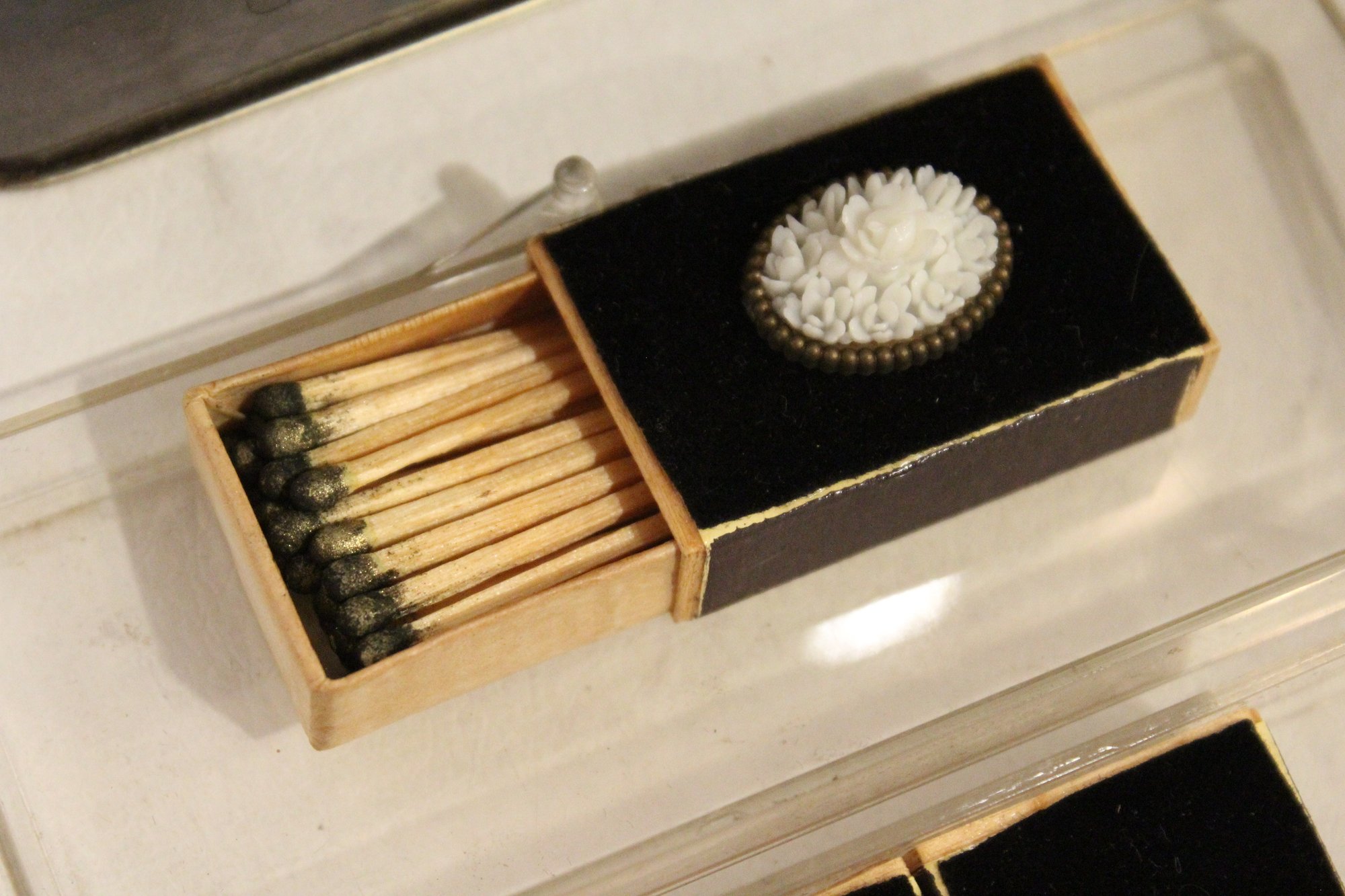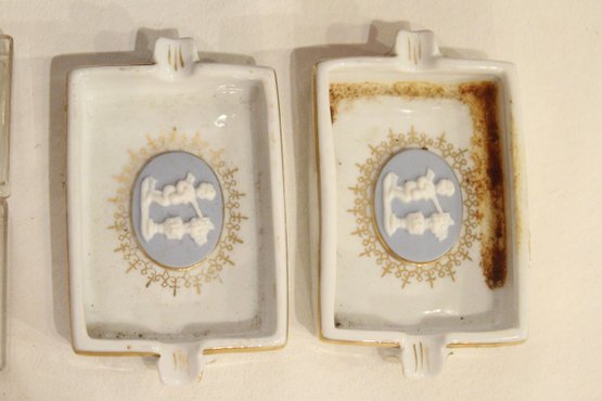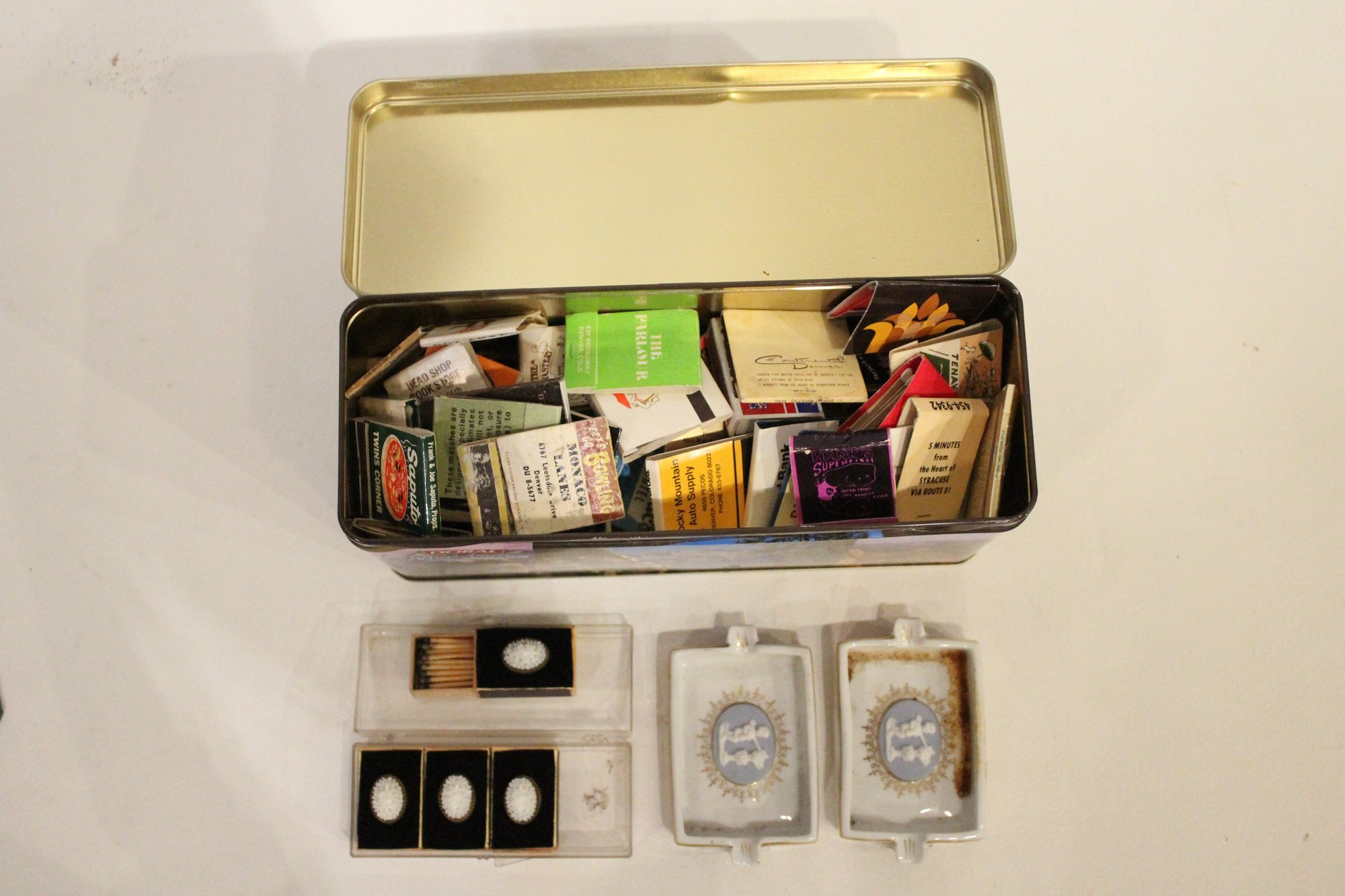 A tin 10" x 4" x 5" full of vintage matches, a case of 4 decorative matchboxes featuring a 3D floral motif 4.5" x 2" x 1.5", and 2 Vintage Porcelain Ashtray / Trinket Tray Pair, Andrea By Sadek, Cherub Cameo, 3.5" x 2.5" x .5". These items can be shipped.