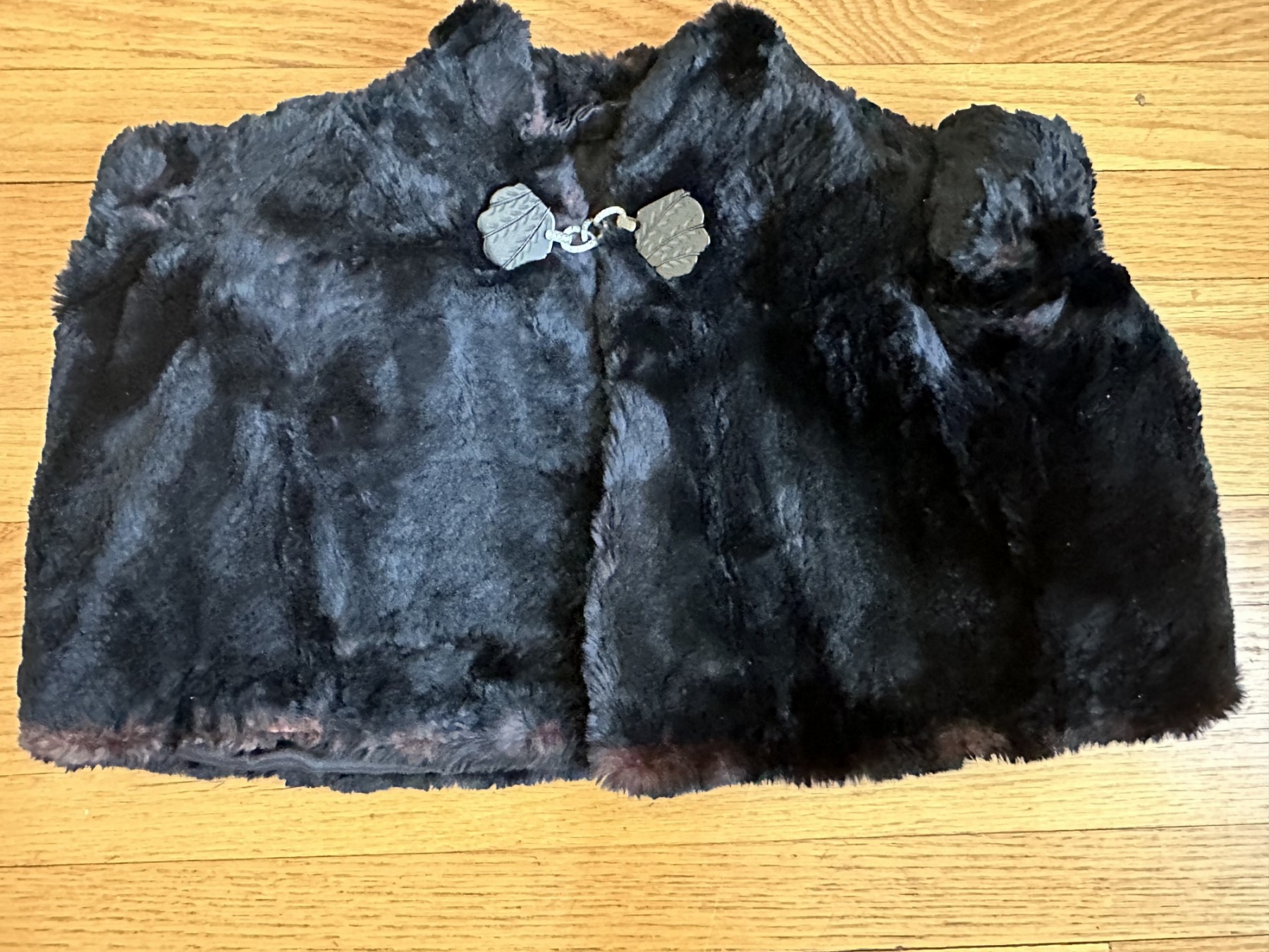 This is a handmade cape, assumed to be made of Rabbit fur with a clasp that is a statement piece in and of itself.