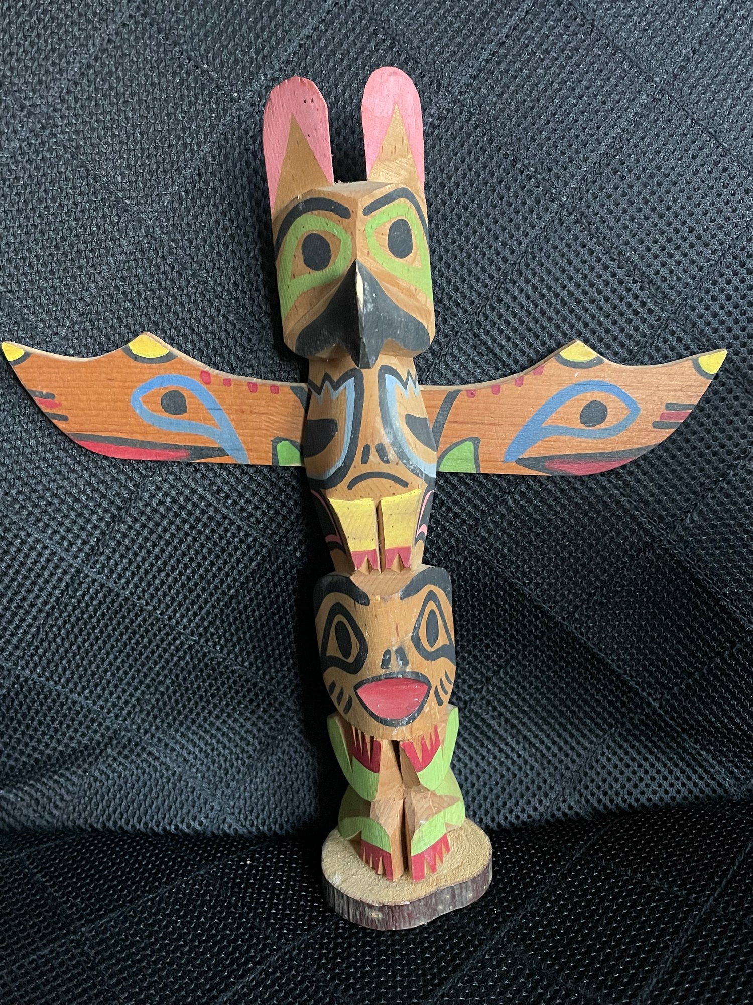 10 1/2” totem with stamp on back that says “Genuine Indian Carved”. It is hand painted.