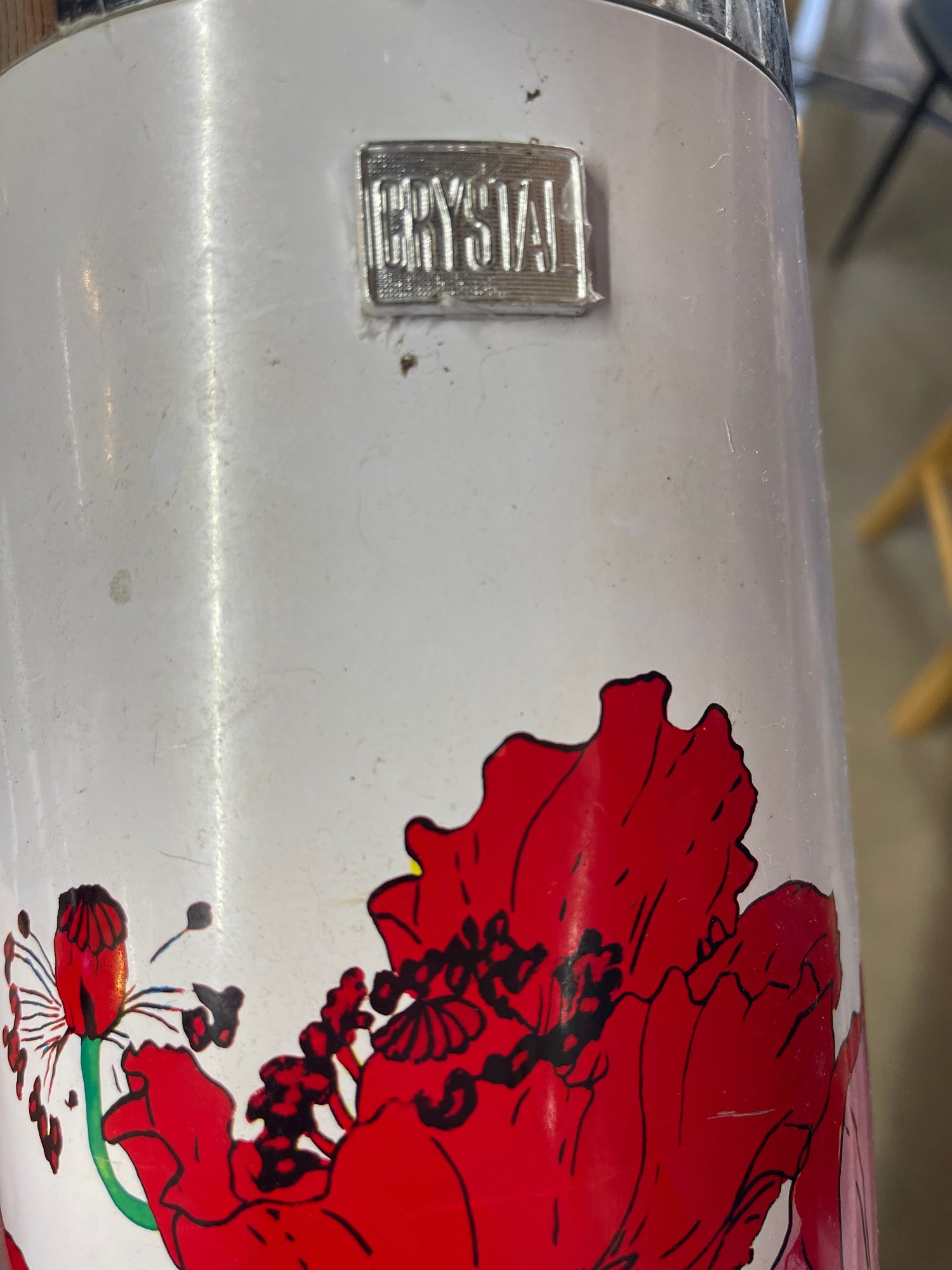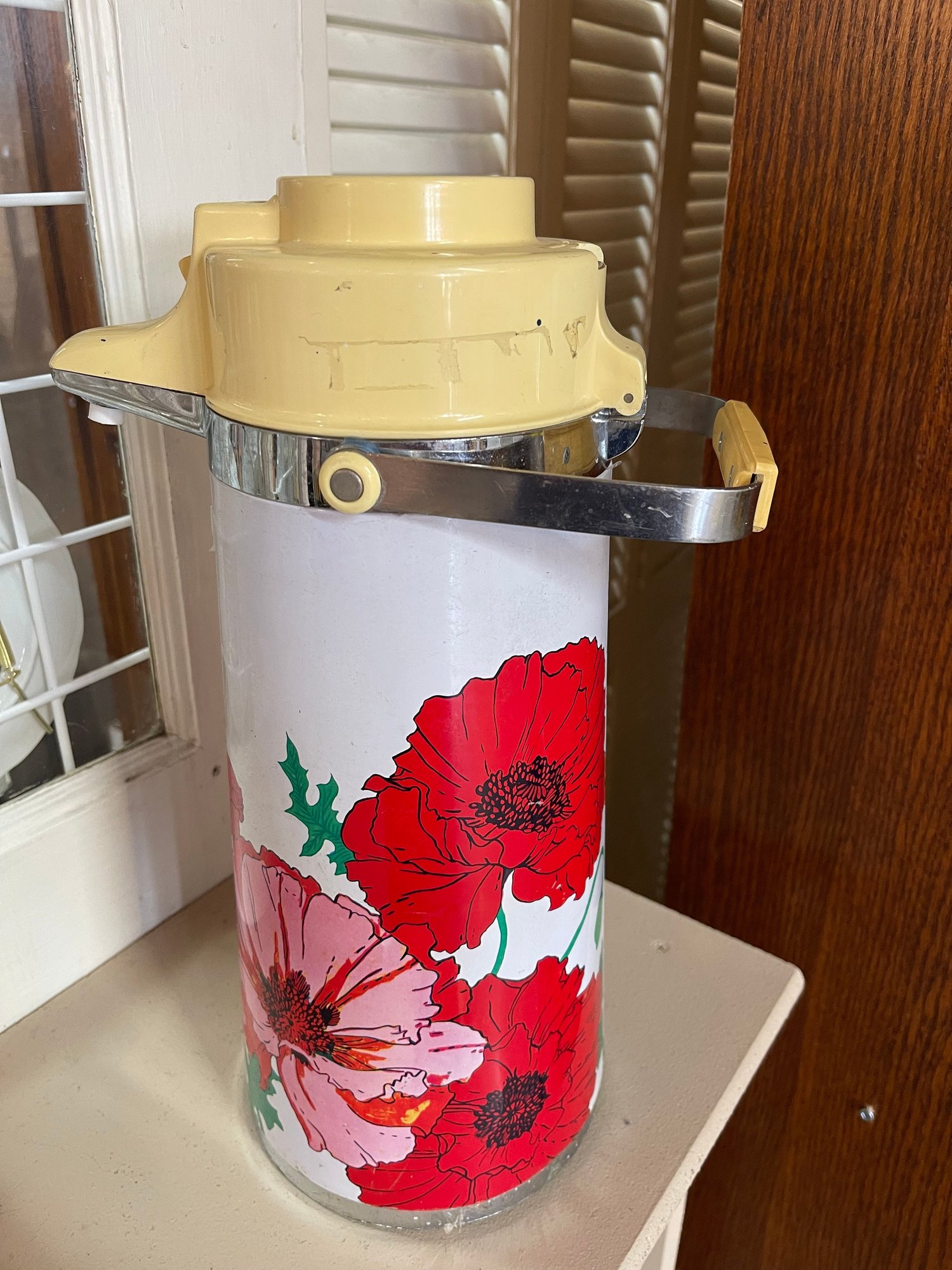 15 inch tall vintage metal thermos, all parts are present. Red poppies design