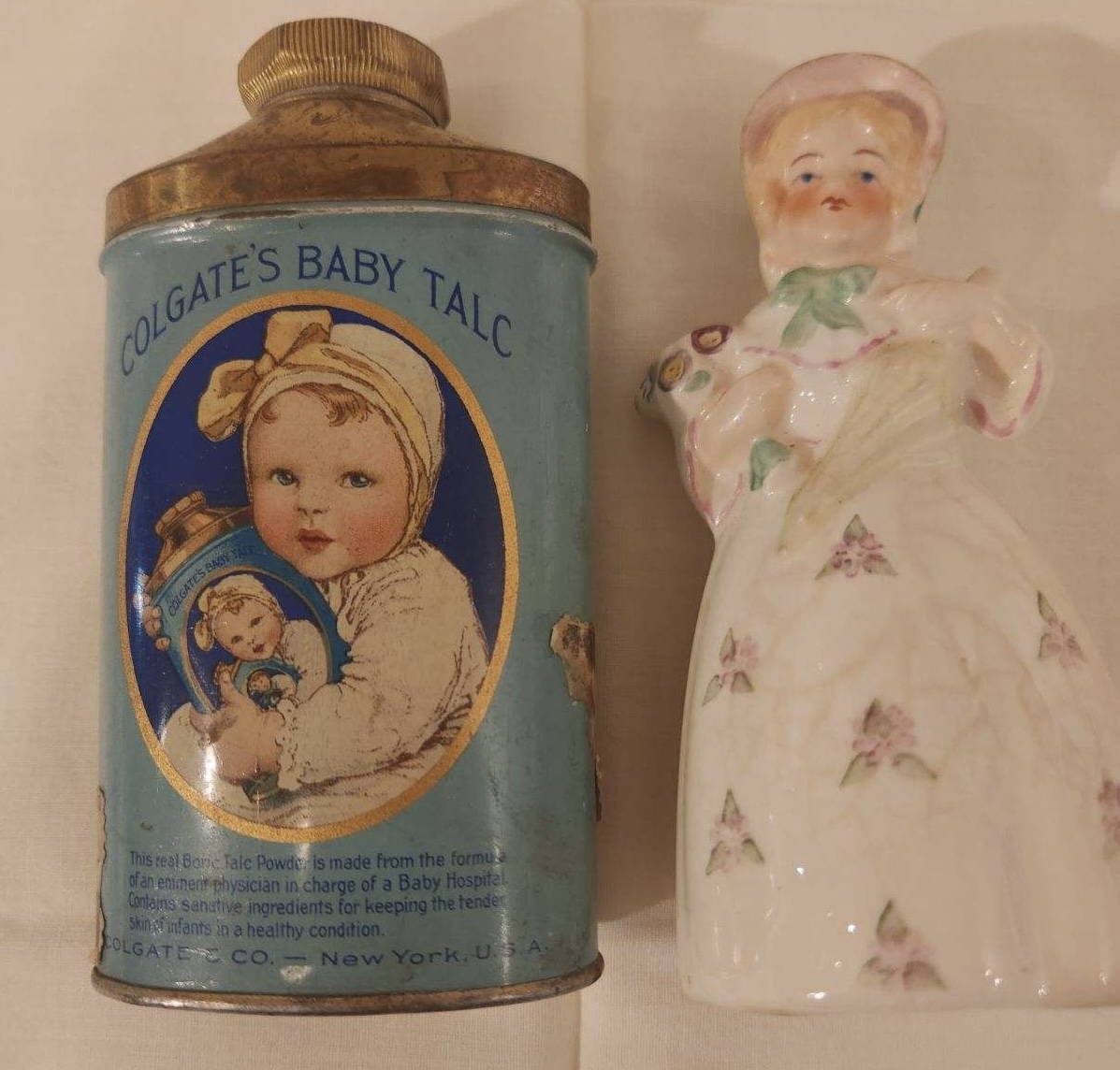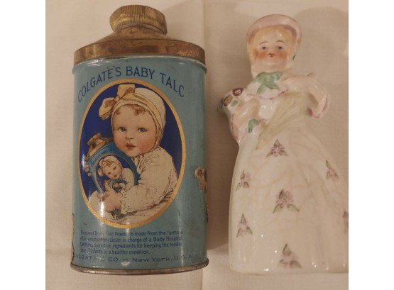 Colgate baby talc canister and ceramic bell in shape of a young girl with a floral bouquet, in good condition