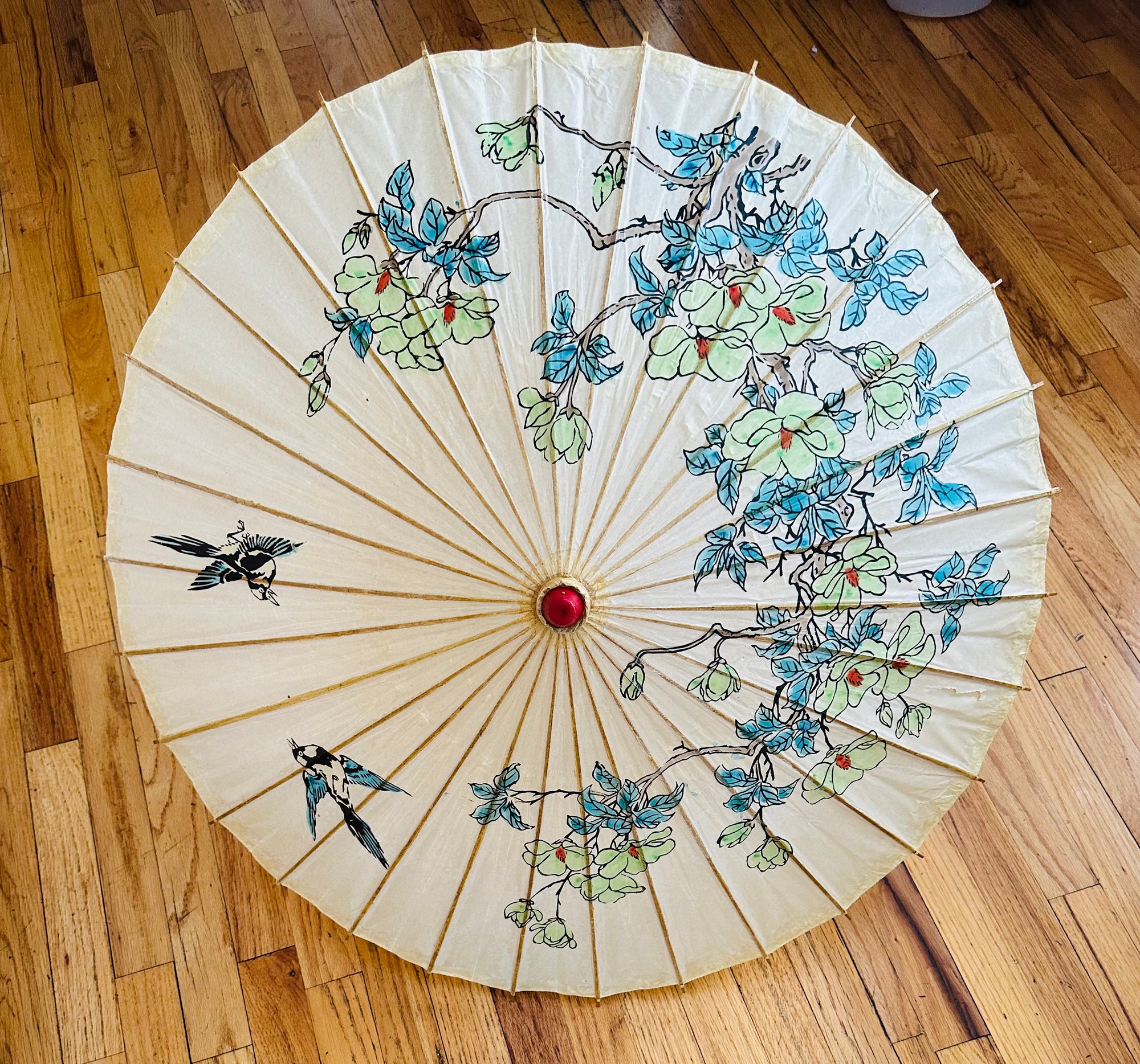 Vintage Bamboo and Rice Paper Parcel with a beautiful hand painted floral and bird design.