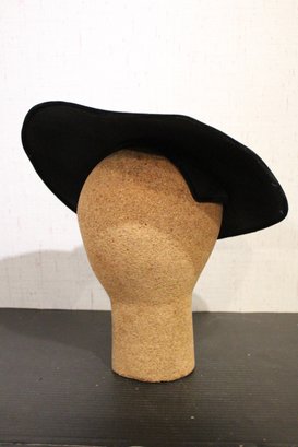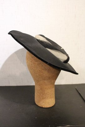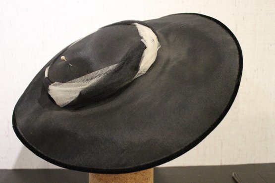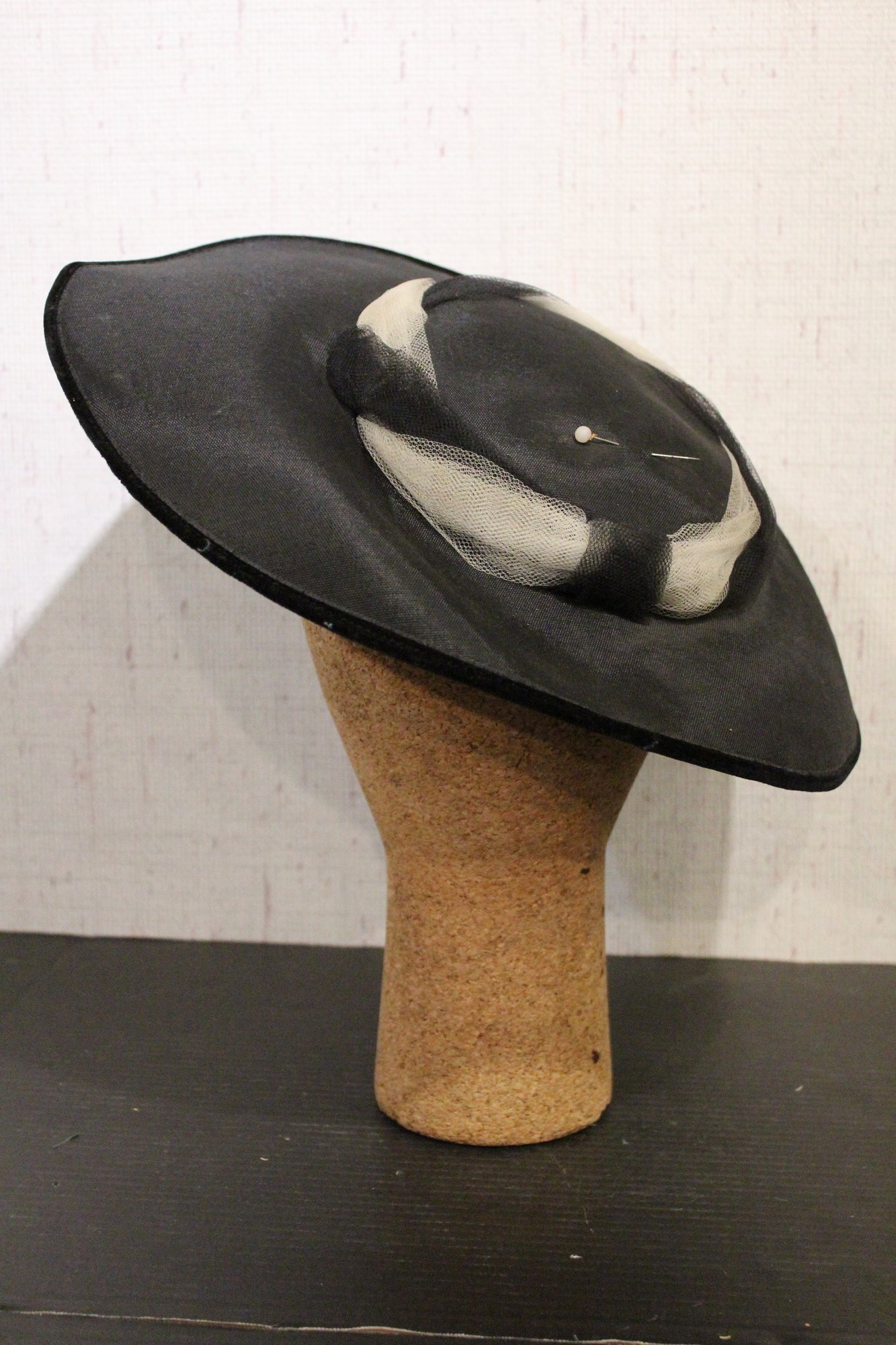 A vintage black boater hat with a netting accent, 15" brim to brim, 2" tall. This item can be shipped.