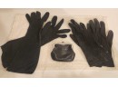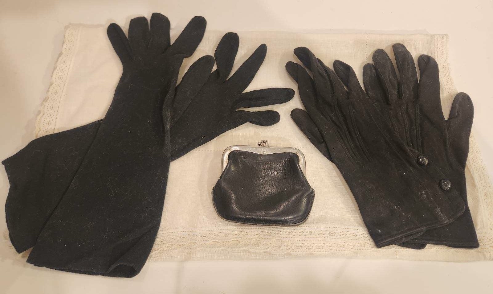 medium and long length black winter gloves and a cute black coin purse with multiple sections.