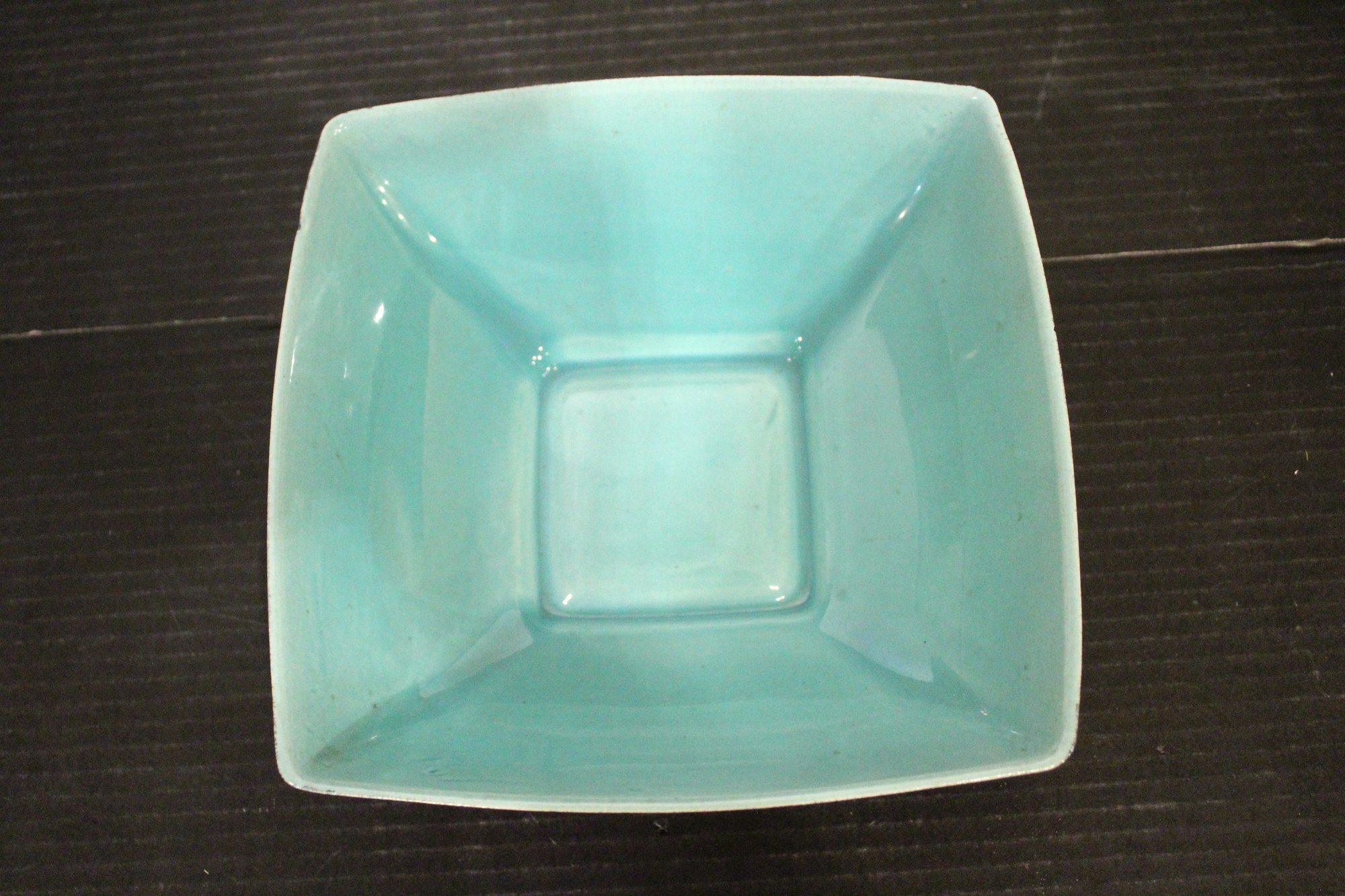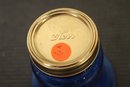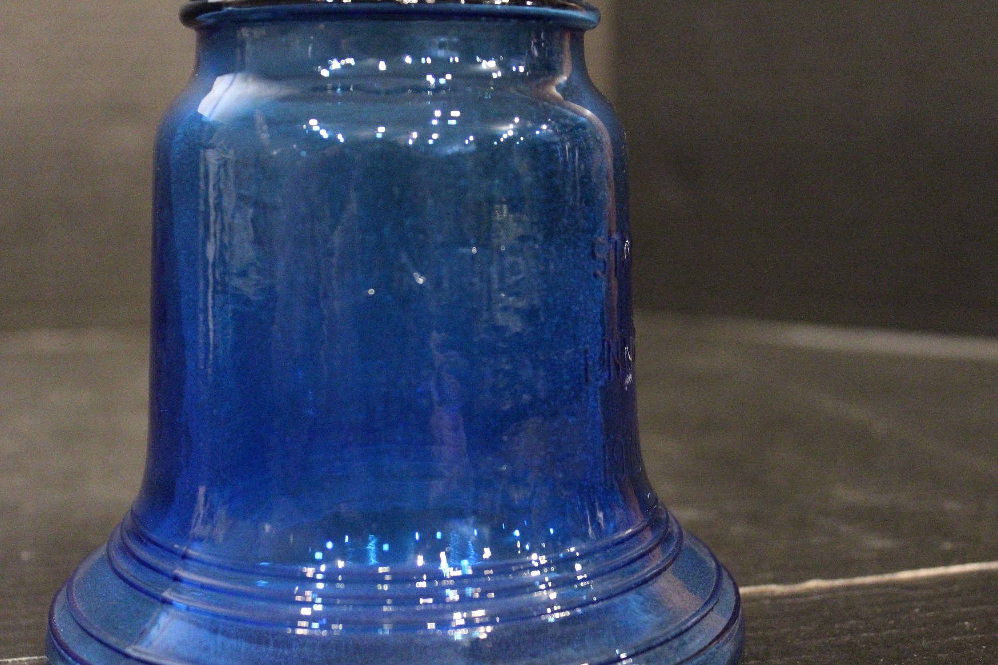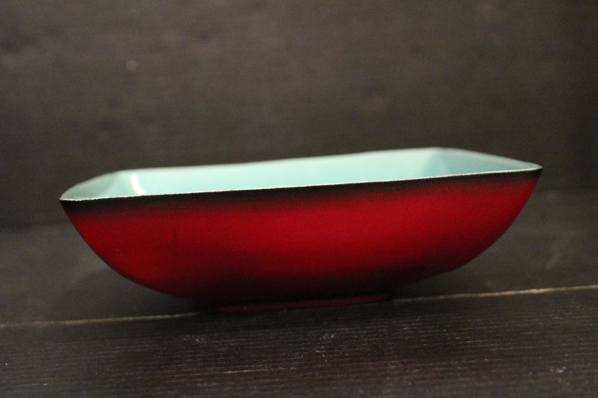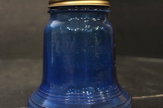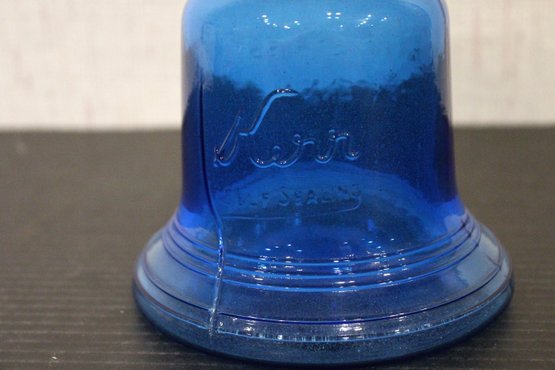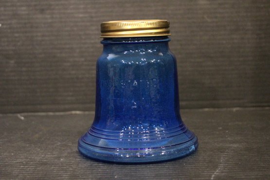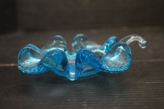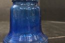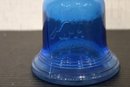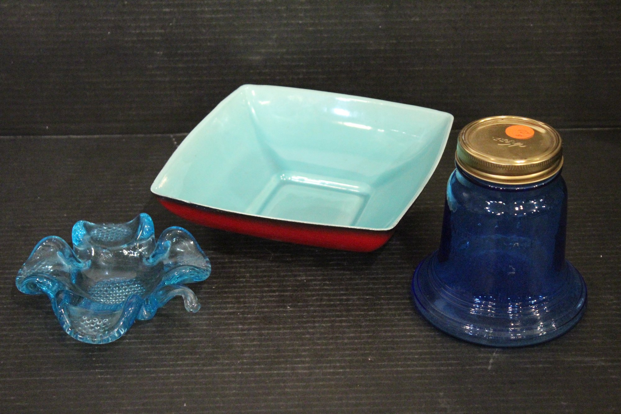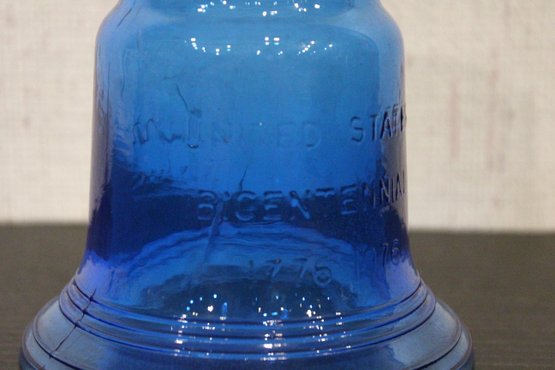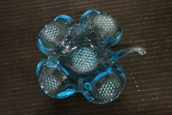 vintage blue glass four-leaf clover or shamrock trinket dish, which can also be used as an ashtray, 6" x 1.5", An MCM blue and red plastic dish 8" x 2", vintage Wheaton NJ blue glass Liberty Bell bottle, a collectible reproduction, 6" x 5".