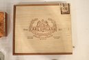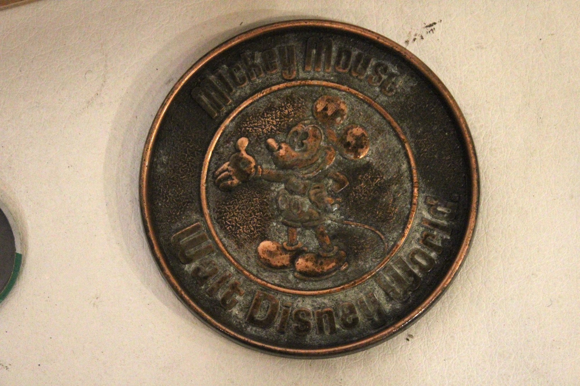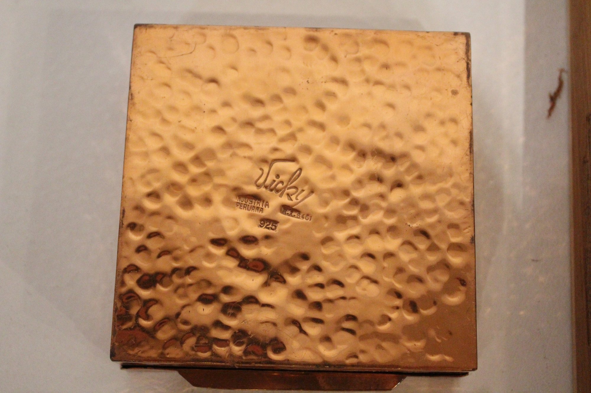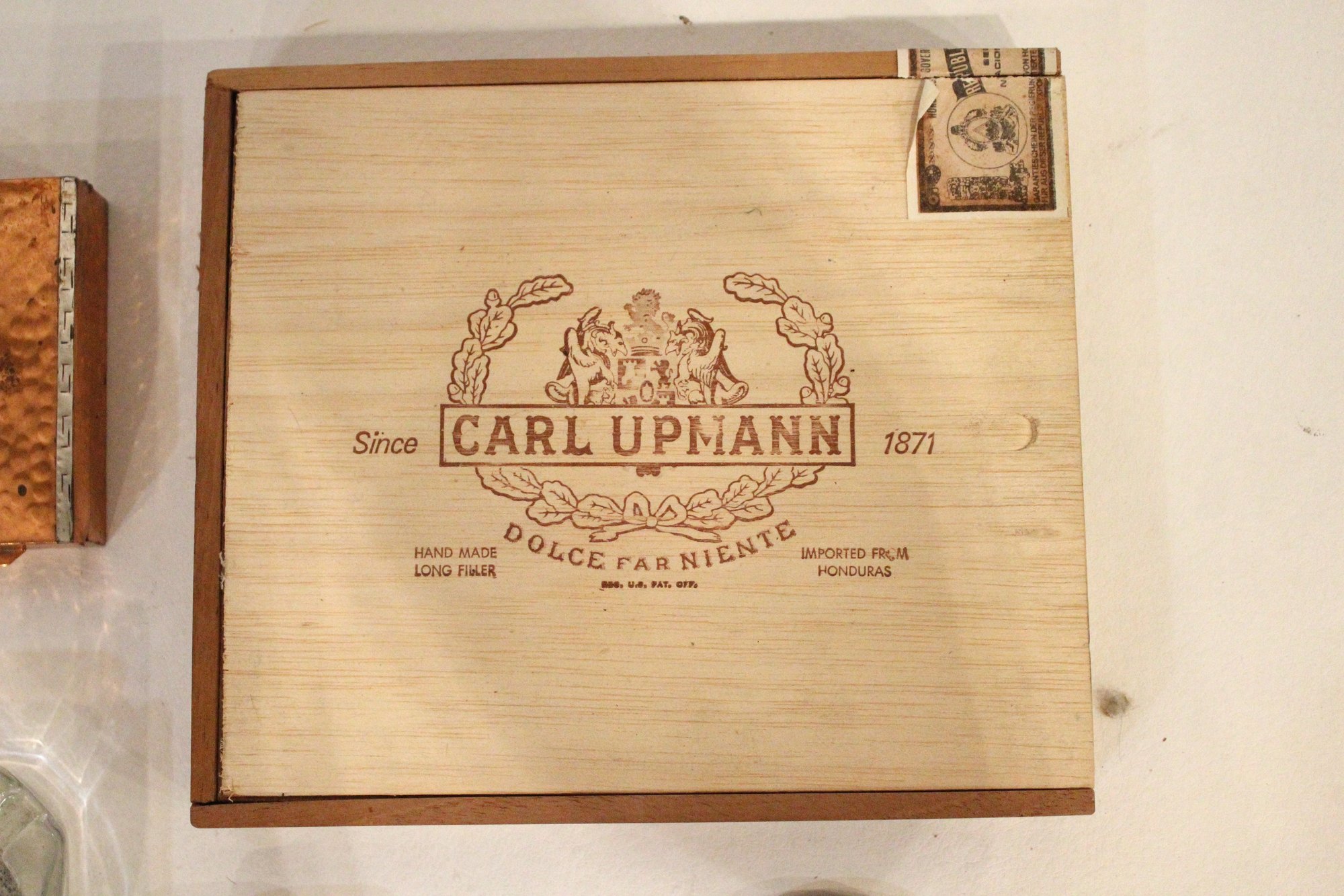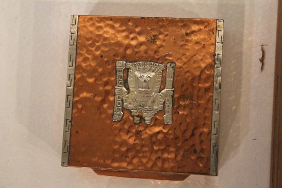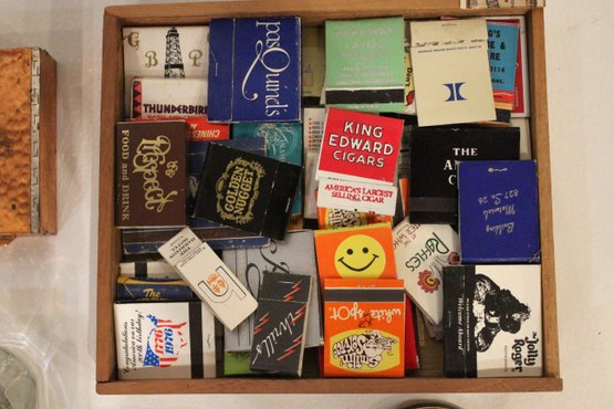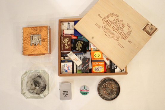 A cigar box 9" x 8" x 1.5" full of vintage matches, Vintage Aztec/Mayan Bronze/Copper & 925 Silver box 4" x 4" x 1", glass ash tray 3.5" x 3.5" x 1", a vintage Mickey Mouse metal souvenir coaster 3", a lighter and a pin. These items can be shipped.