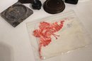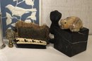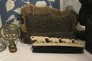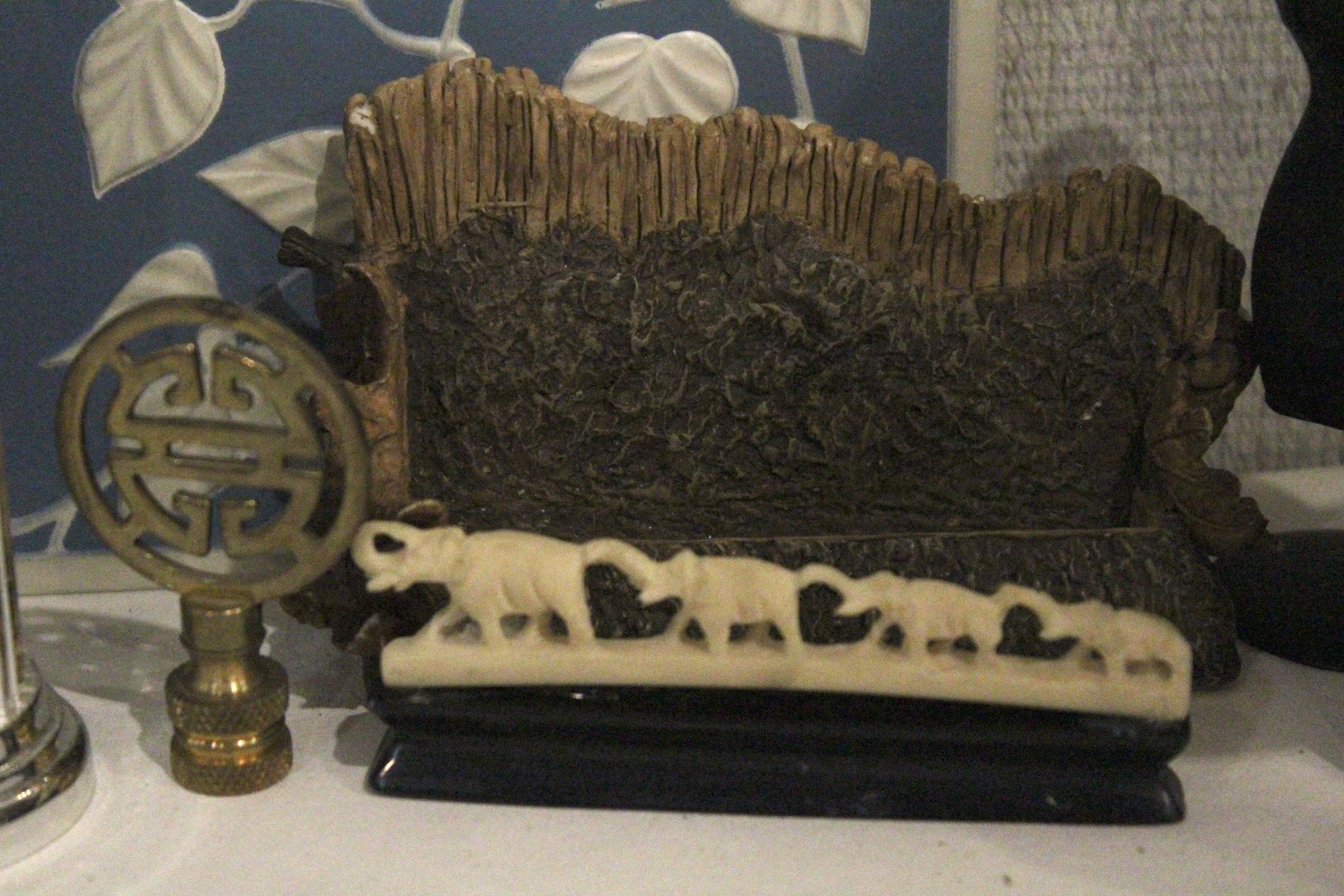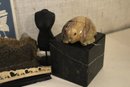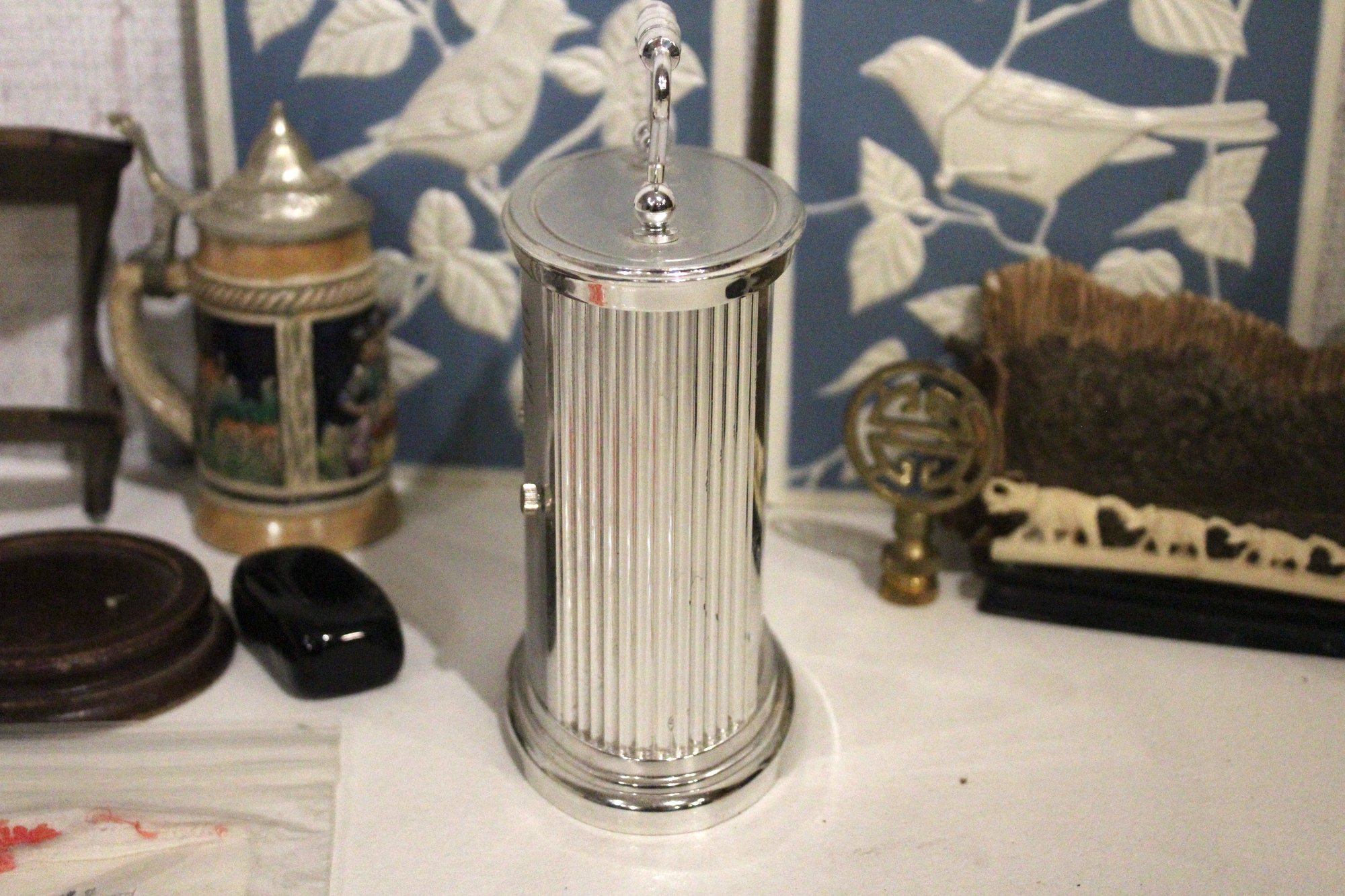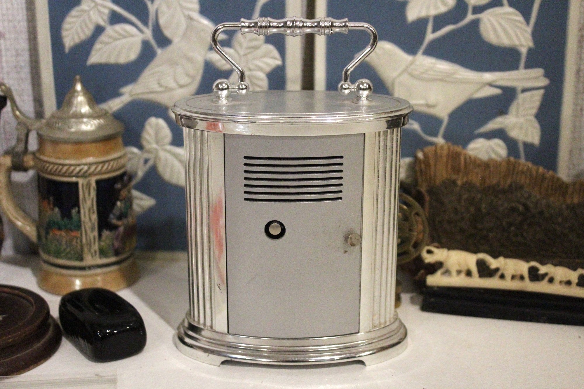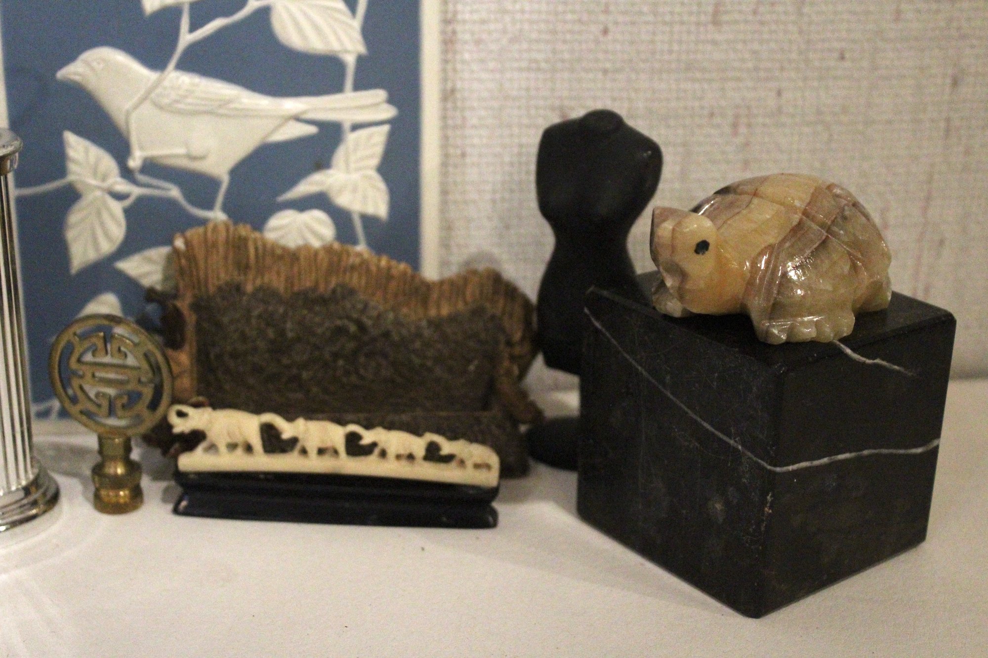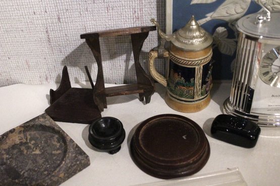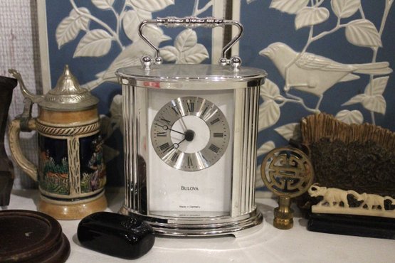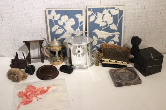 A vintage Bulova quartz carriage clock, along with several other sophisticated trinkets. An embroidered handkerchief 4" x 4", a 2 tier tiny shelf 3.5", and a 1 tier shelf 2", a rock turtle 4", a tiny black pot 1", a small black stone 1" x 2", a mini stein 5", a vintage Bulova quartz carriage clock 6" x 4", an Asian style bottle cap 2.5", a decorative stand 5" x 3", a row of elephants 4" x 1", a mini sewing model 5", a small stone coaster 4.5" x 1", a rock cube 3" x 3", 2 blue and white decorative bird signs 8.5" x 5.5". These items can be shipped