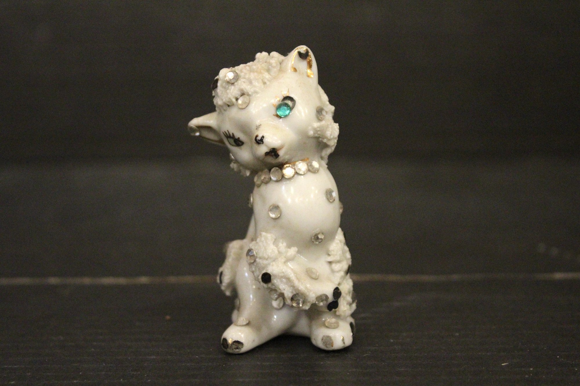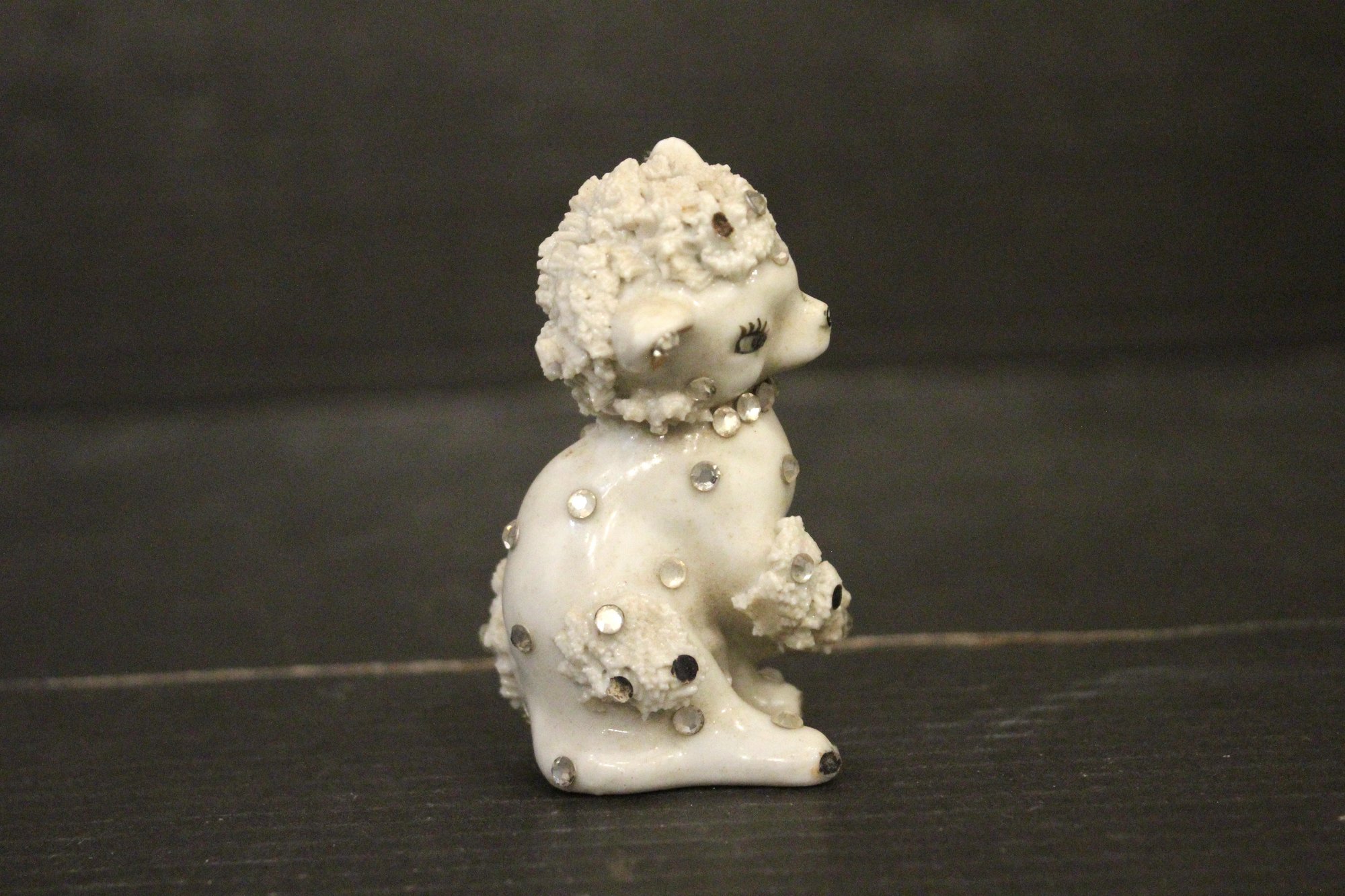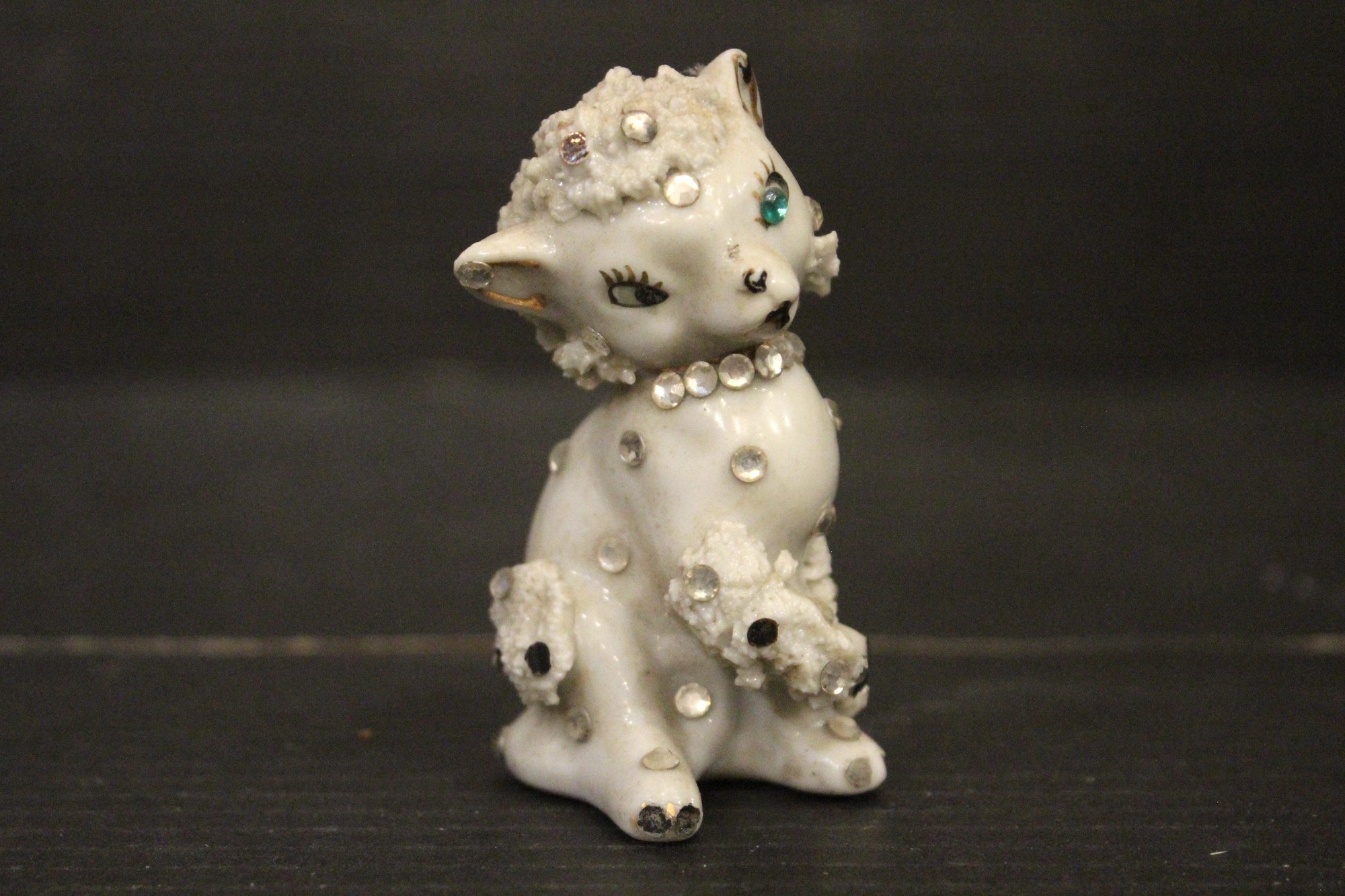 vintage 1950s "spaghetti" ceramic poodle figurine adorned with rhinestones, made in Japan, 3.25”