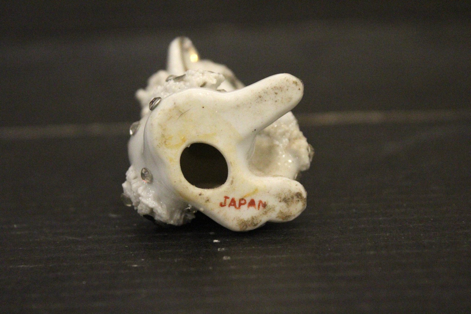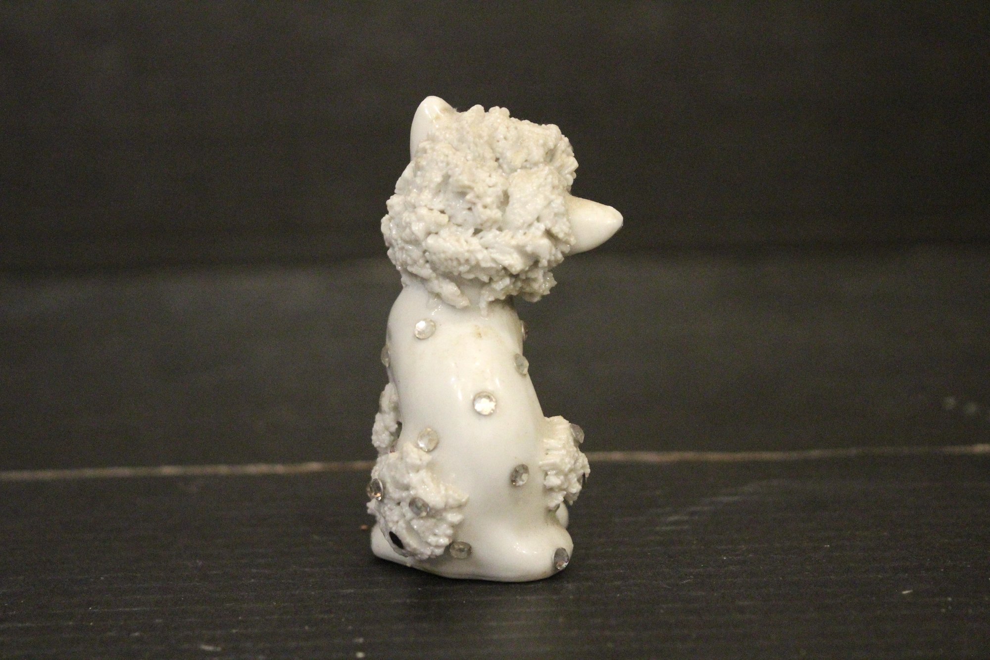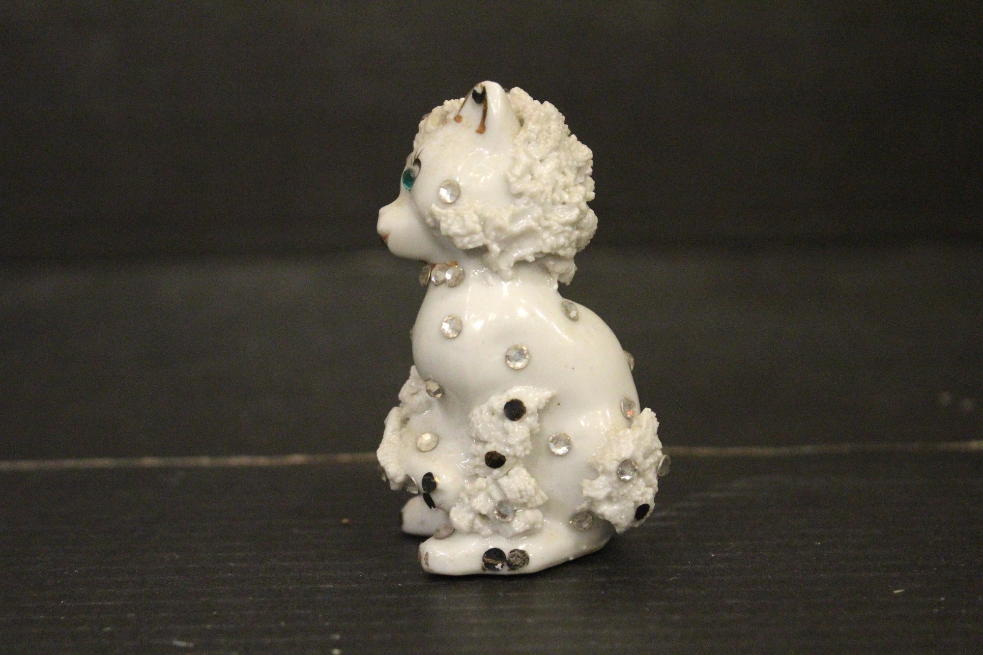 vintage 1950s "spaghetti" ceramic poodle figurine adorned with rhinestones, made in Japan, 3.25”