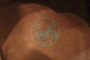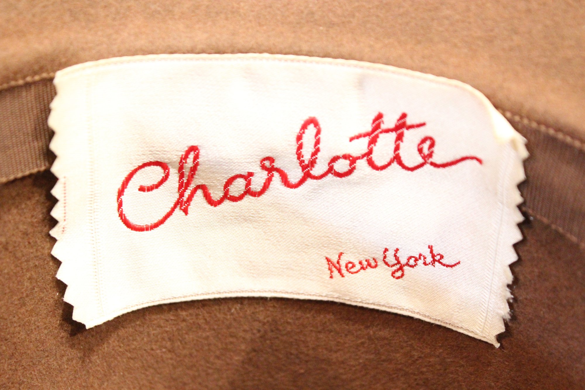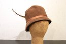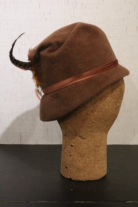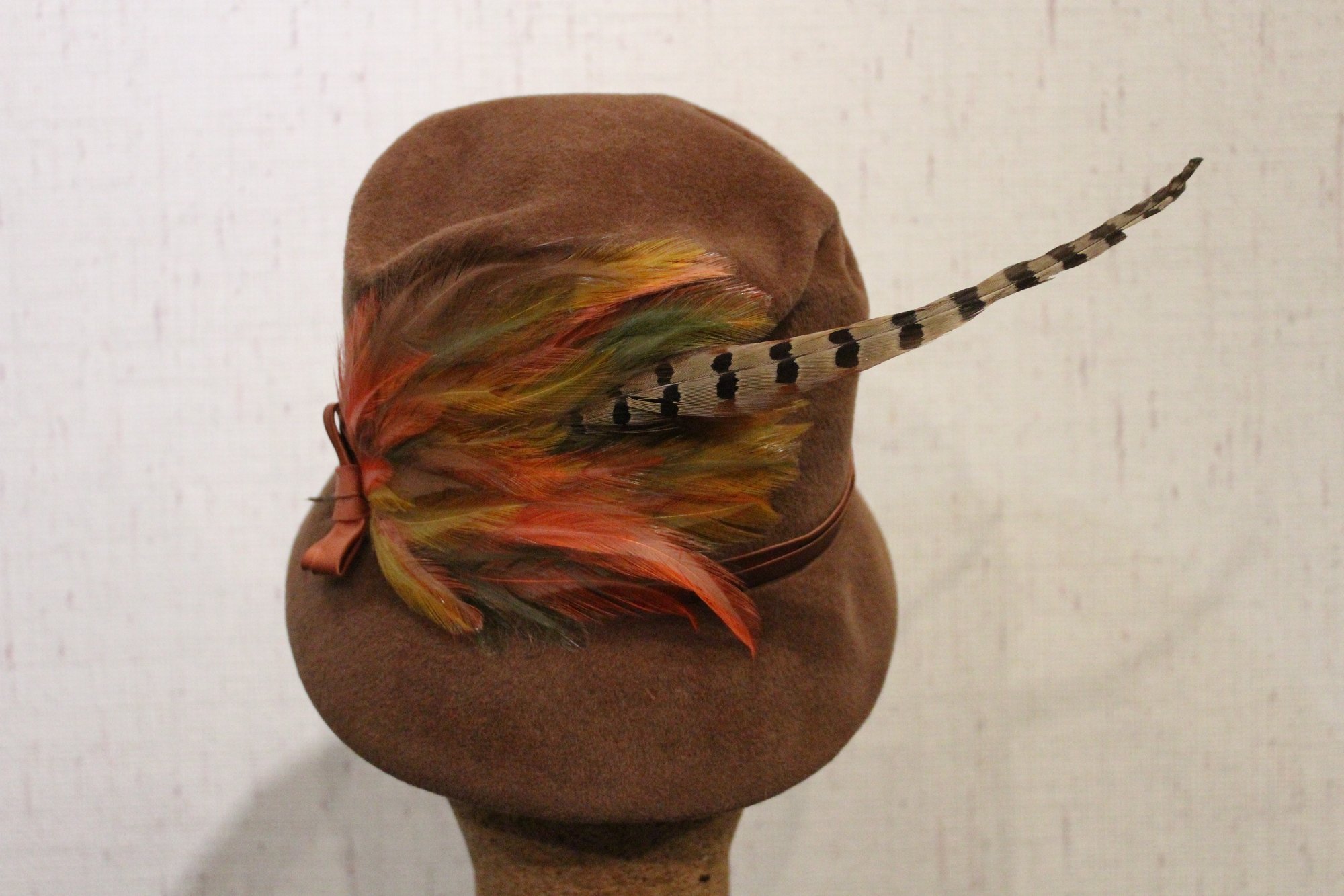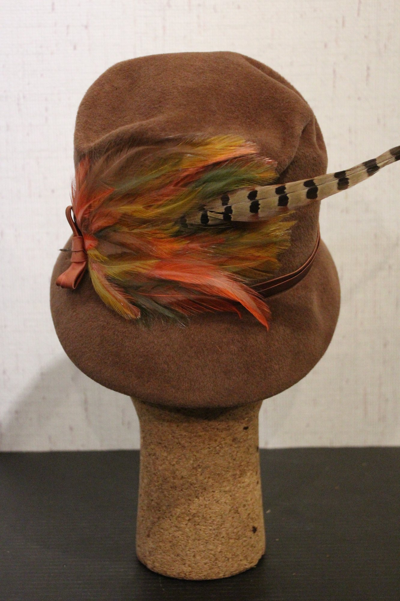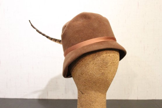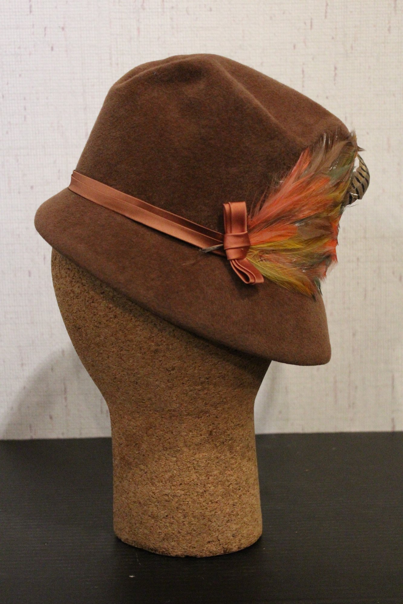 A vintage Charlotte New York brown felt cloche hat with a ribbon and feather accent, 10" brim to brim, 7" tall. This item can be shipped.