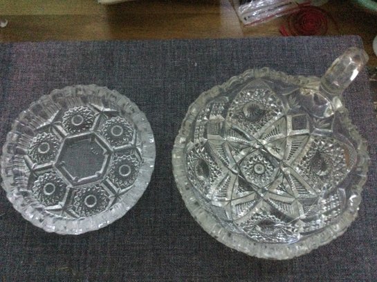 Heavy cut Glass dish with handle (5” diameter, 61/2 with handle) and cut glass ashtray with Italy stamped in the glass on the back (4 1/2 diameter)