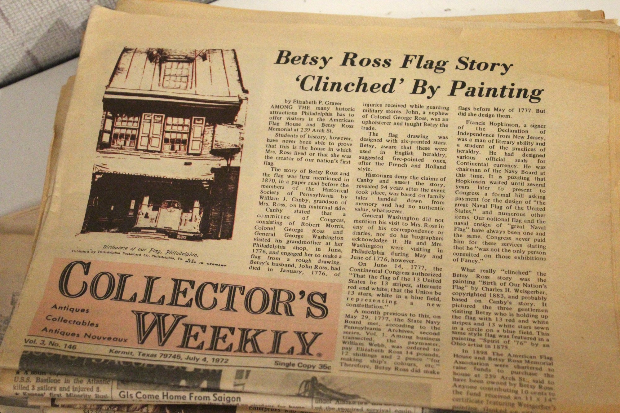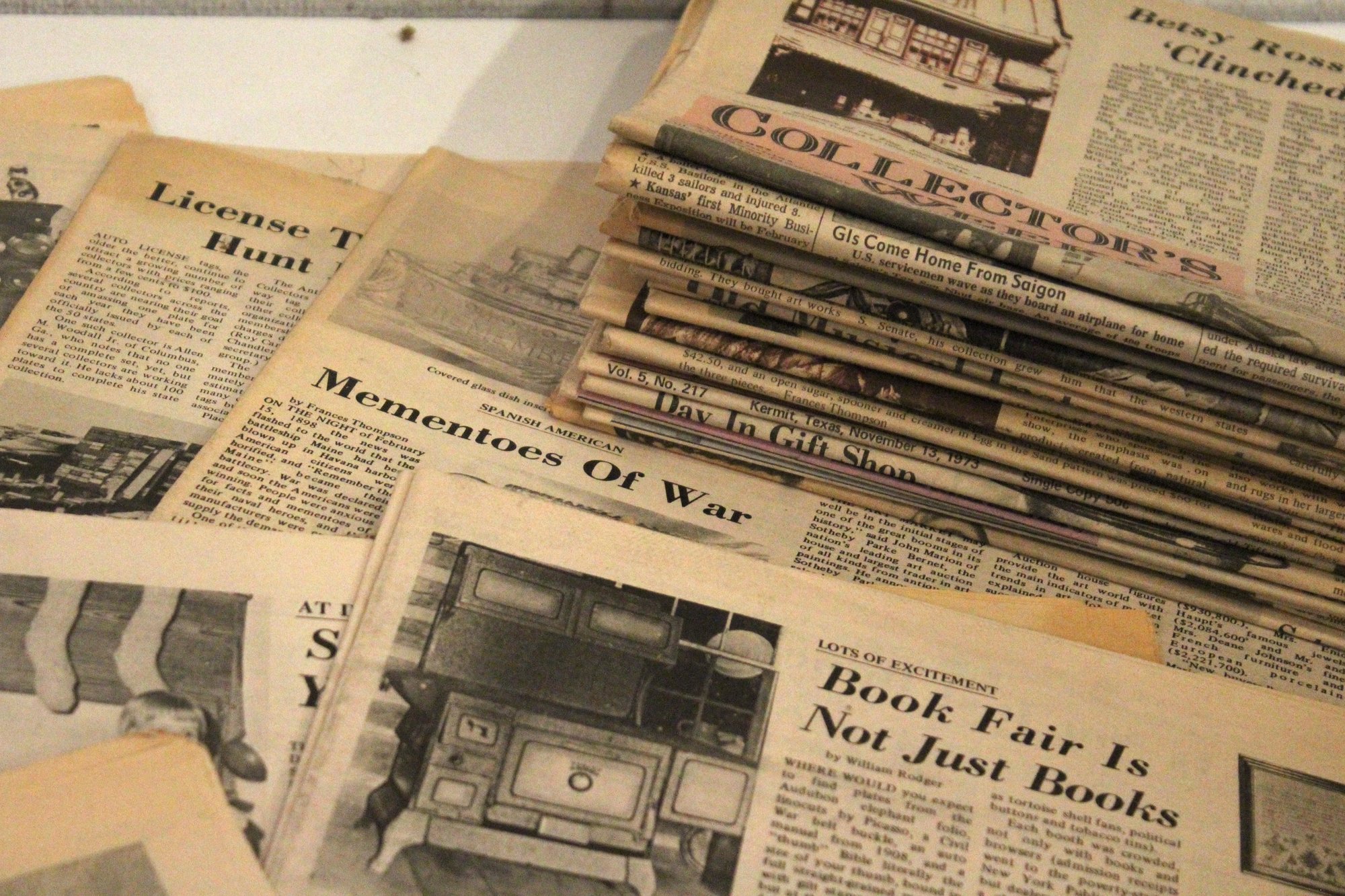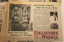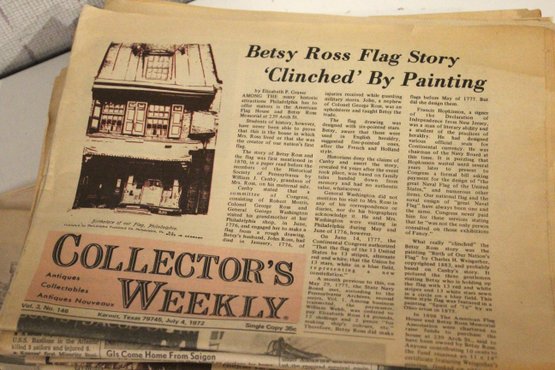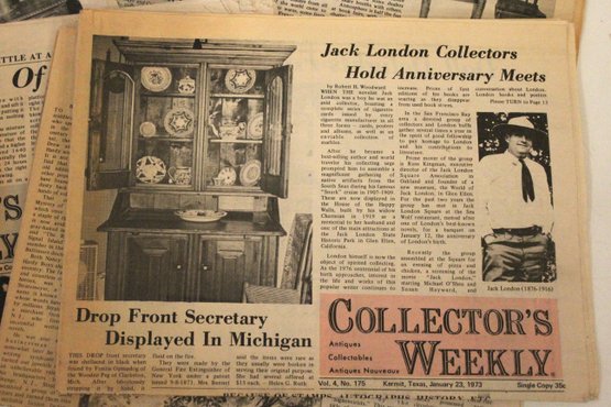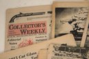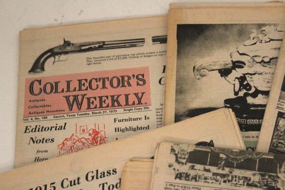 A large stack of vintage Collectors Weekly newspapers featuring many interesting items showcasing parts of American culture and history at that time and place. These items can be shipped.