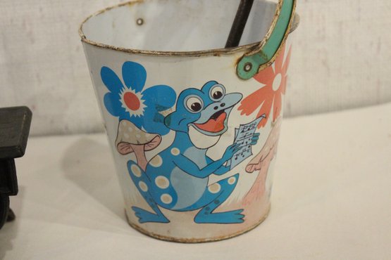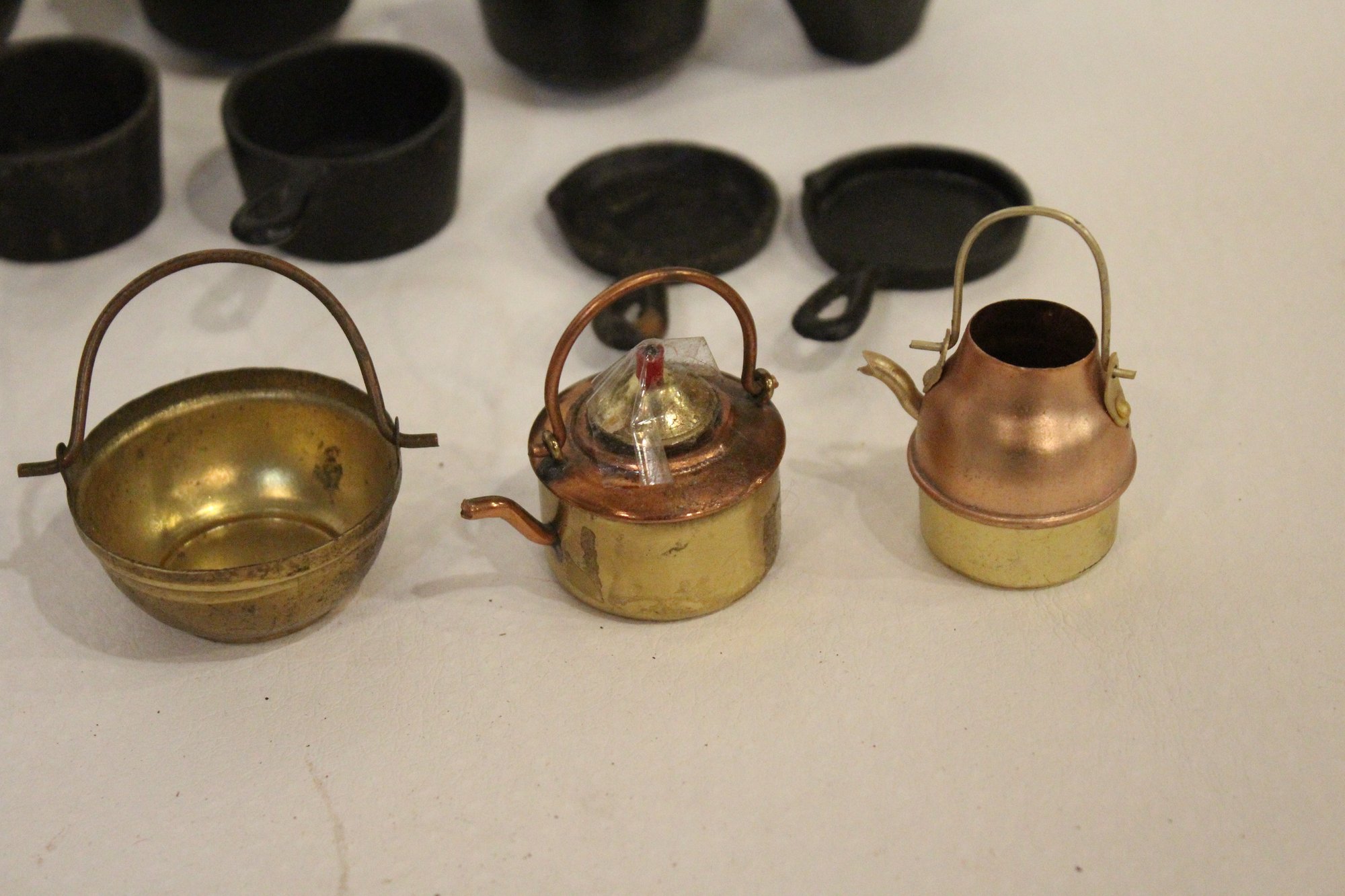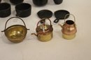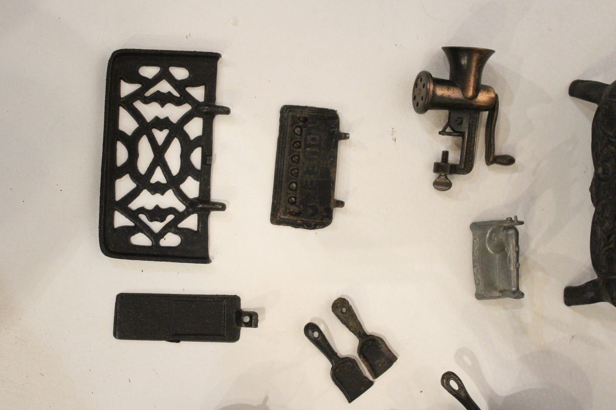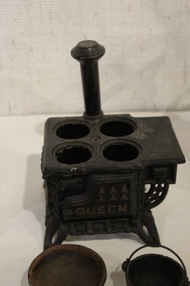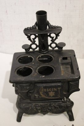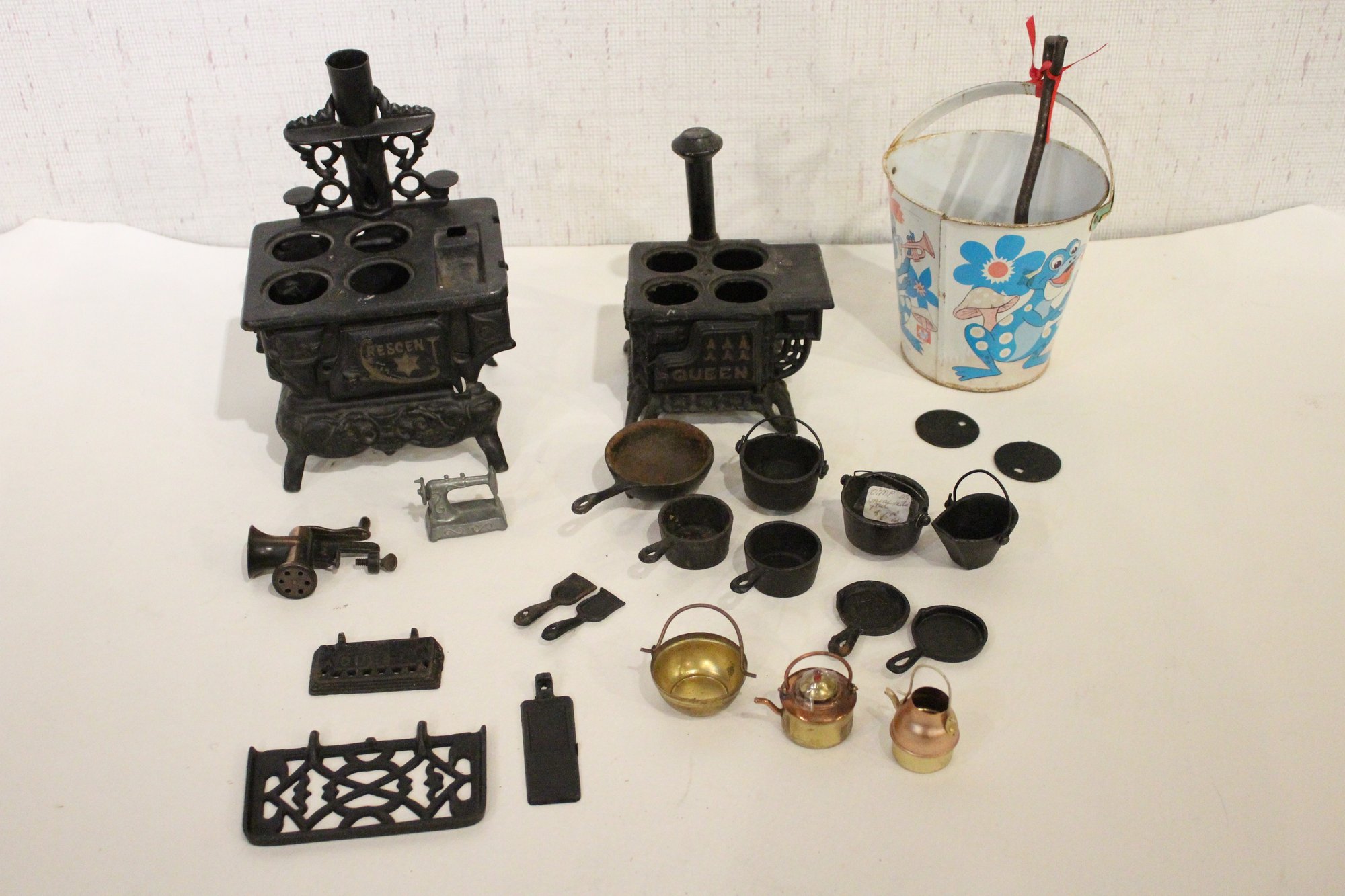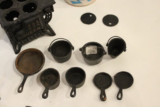 Vintage Crescent cast iron salesman sample stove 4.5" x 5.5", miniature cast iron toy stove 4" x 3.5". A small bucket 6" with a cast iron shovel, 5 miscellaneous accessories, 8 pots and pans, 2 stove top covers, and 3 copper toned pots. These items can be shipped.