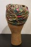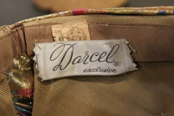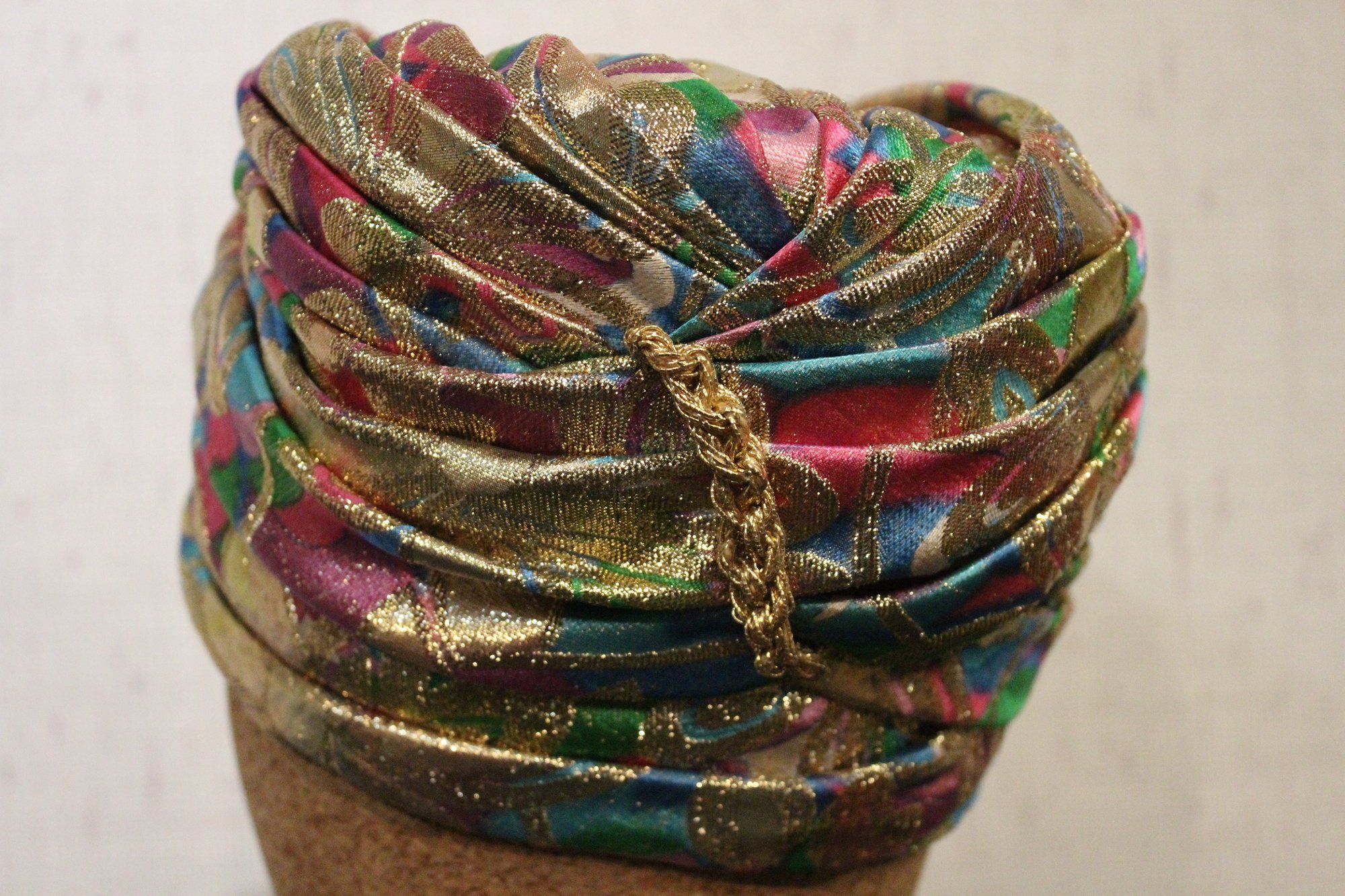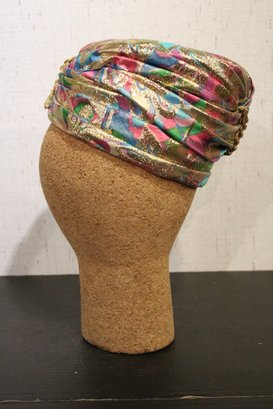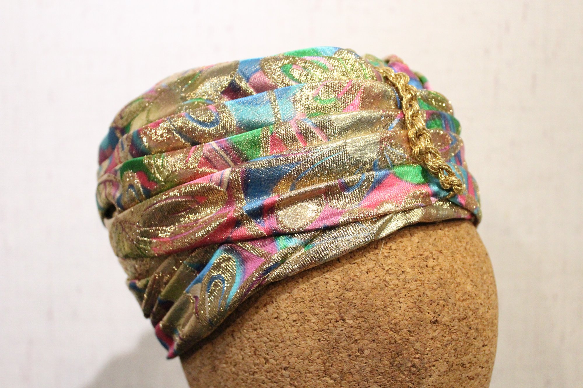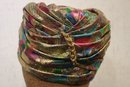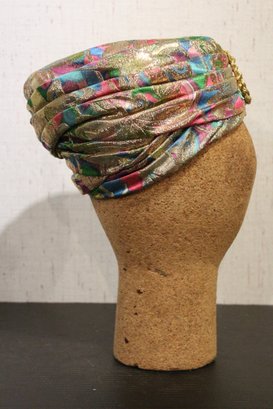 A vintage Darcel exclusive metallic patterned turban hat, 6" tall. This item can be shipped.