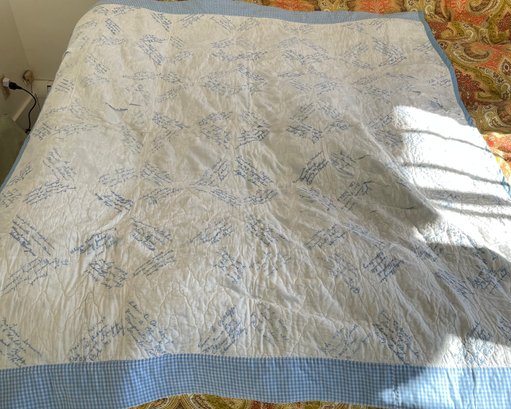 This quilt was embroidered with the names of members of a church, before 1940. The fabric has torn in some areas.