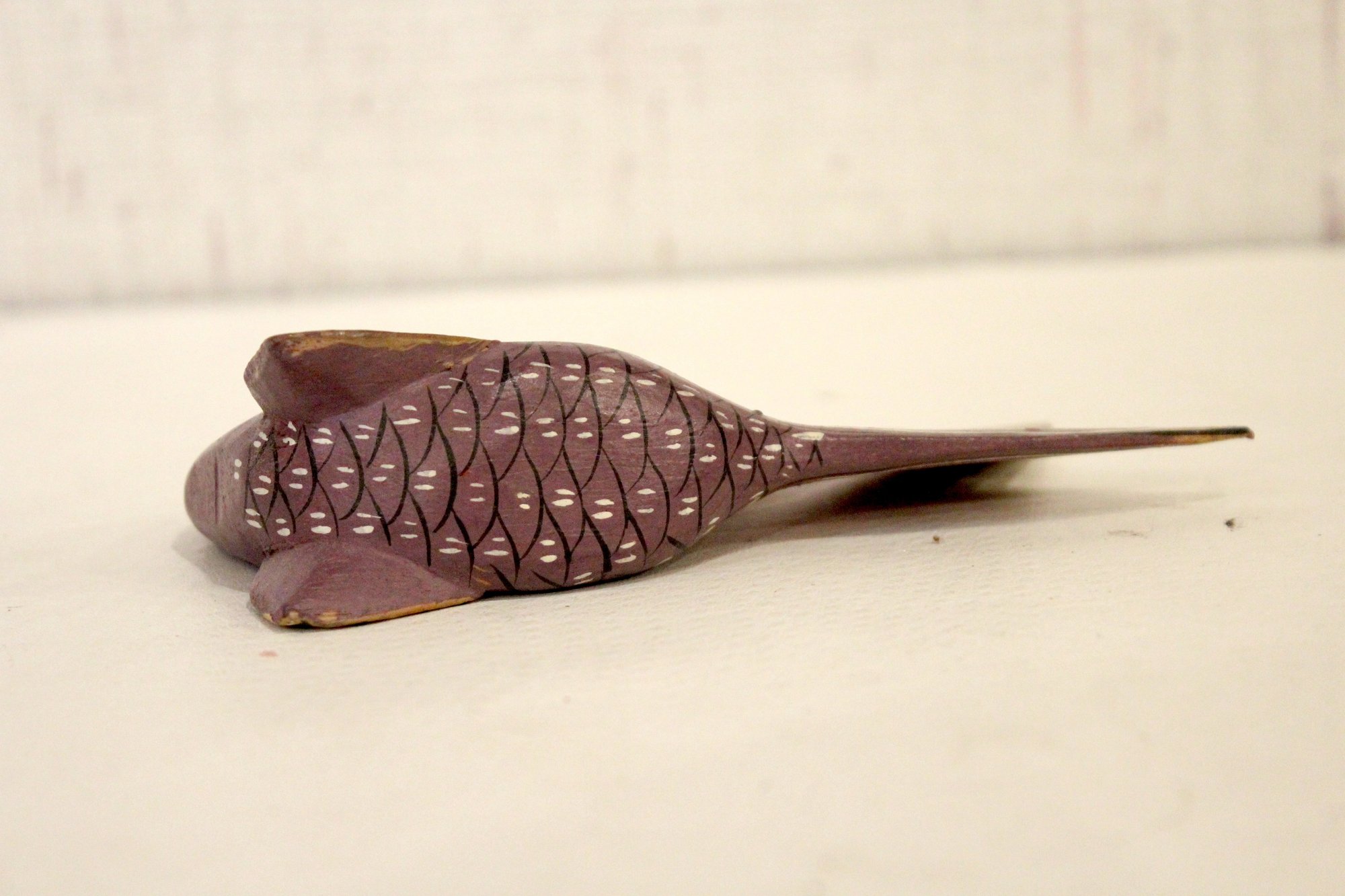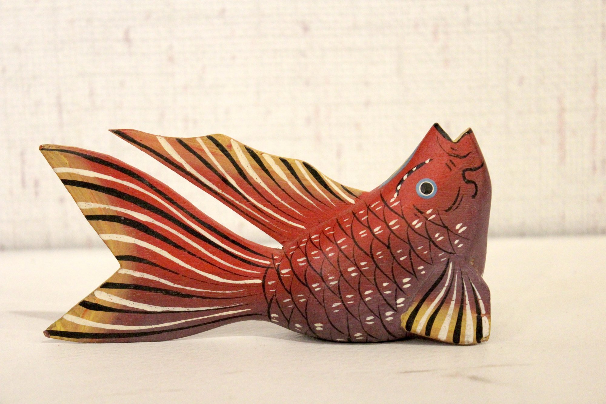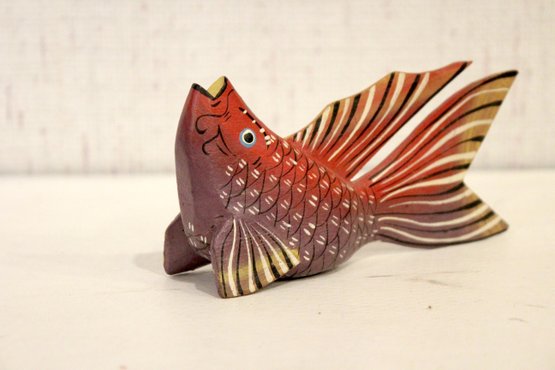 a hand-carved, hand-painted wooden fish figurine, 6" x 3"