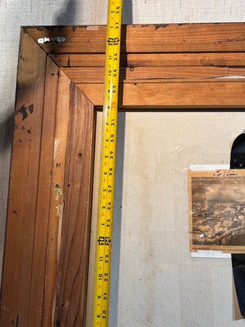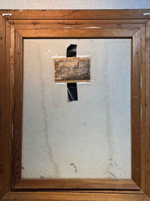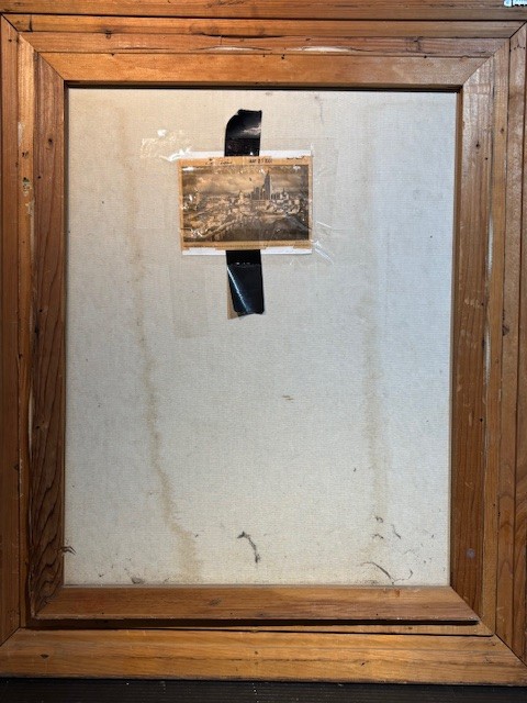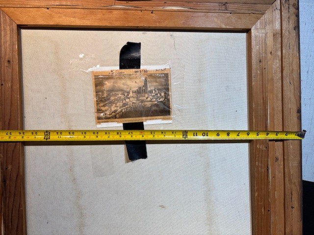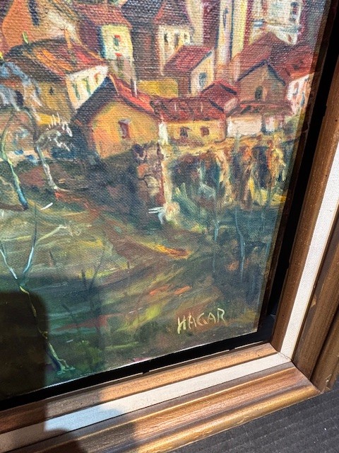 Vintage framed Oil Painting of Segovia Spain signed by Artist Hagar. Painted with vibrant colors. The Frame is wood with copper tint with a textured matting. The painting is large but not heavy 28" wide 37" tall. The painting is separating from the frame in the lower right-hand corner. This item will not ship