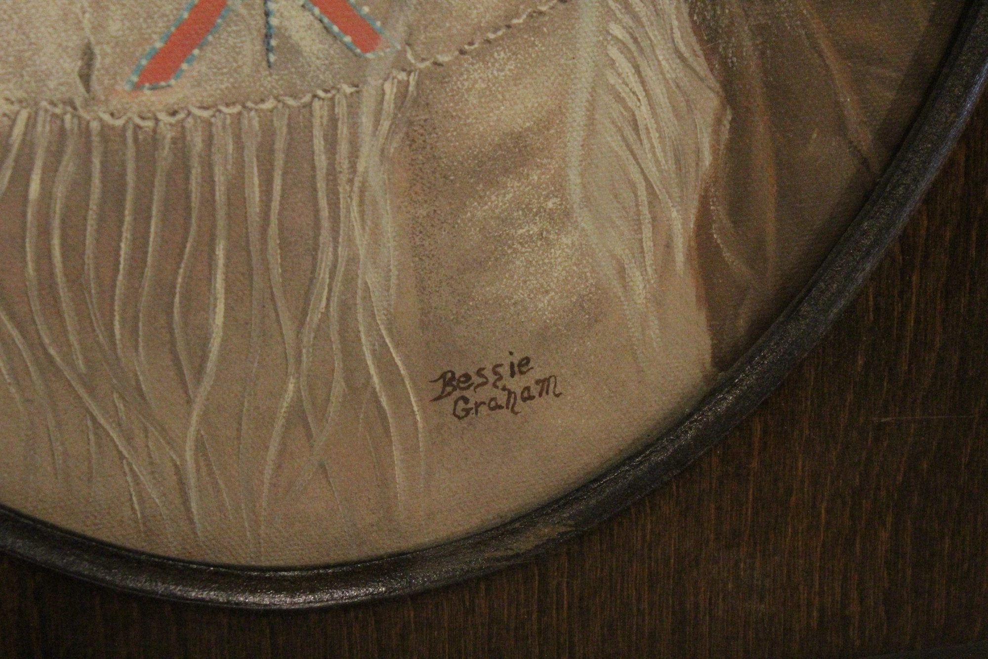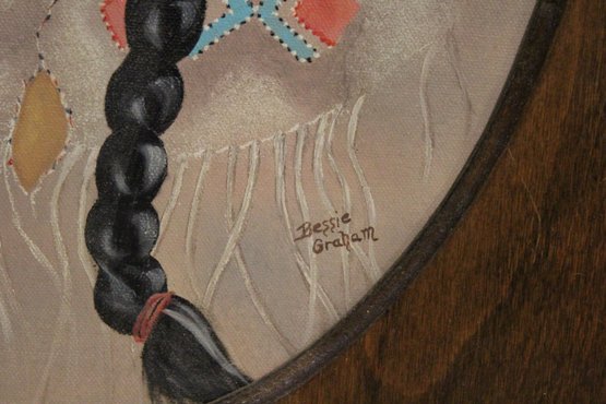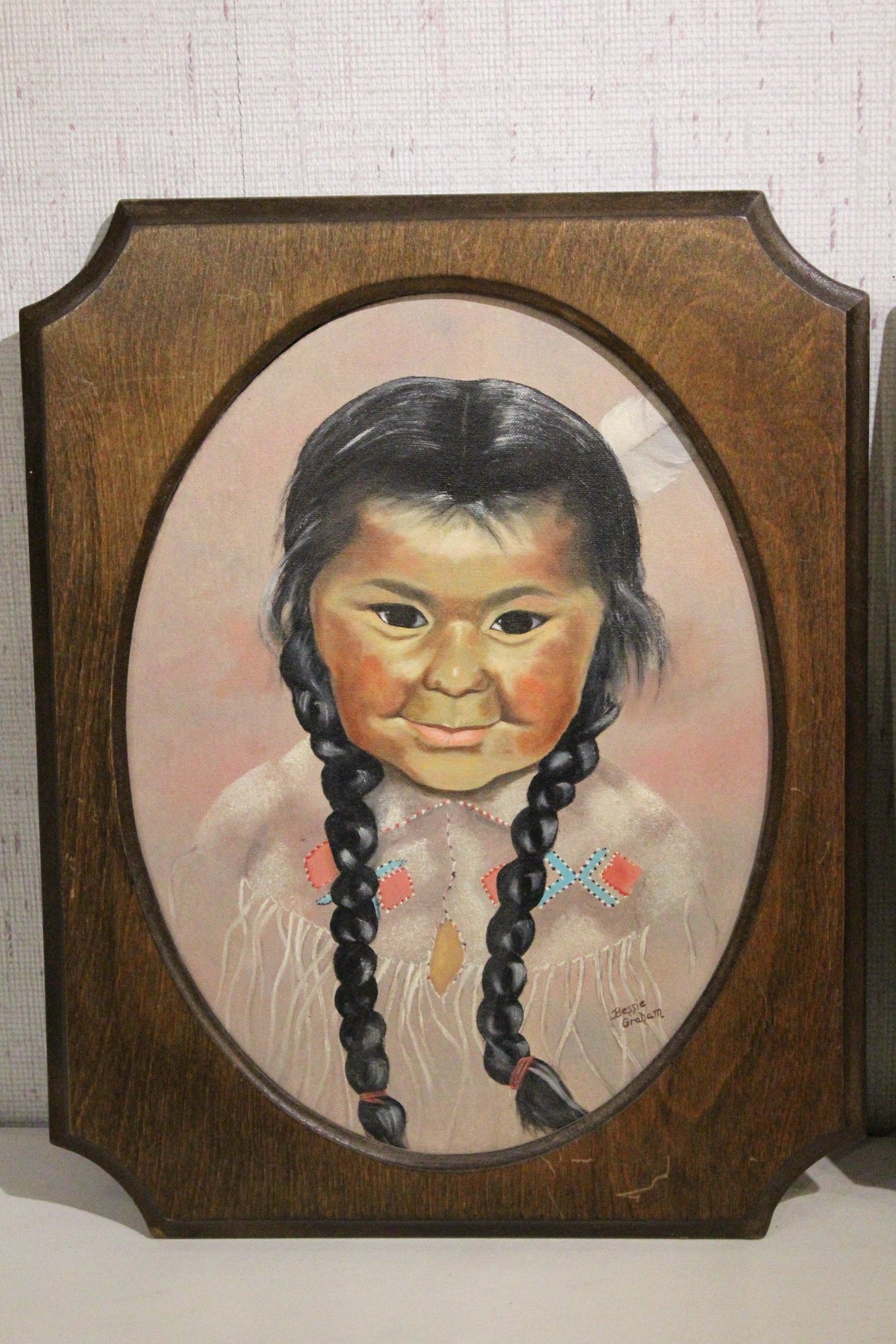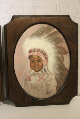 2 signed vintage framed acrylic paintings of Native American children by Bessie Graham, in the style of Canadian artist Dorothy Oxborough, 19" x 15". These items can be shipped.