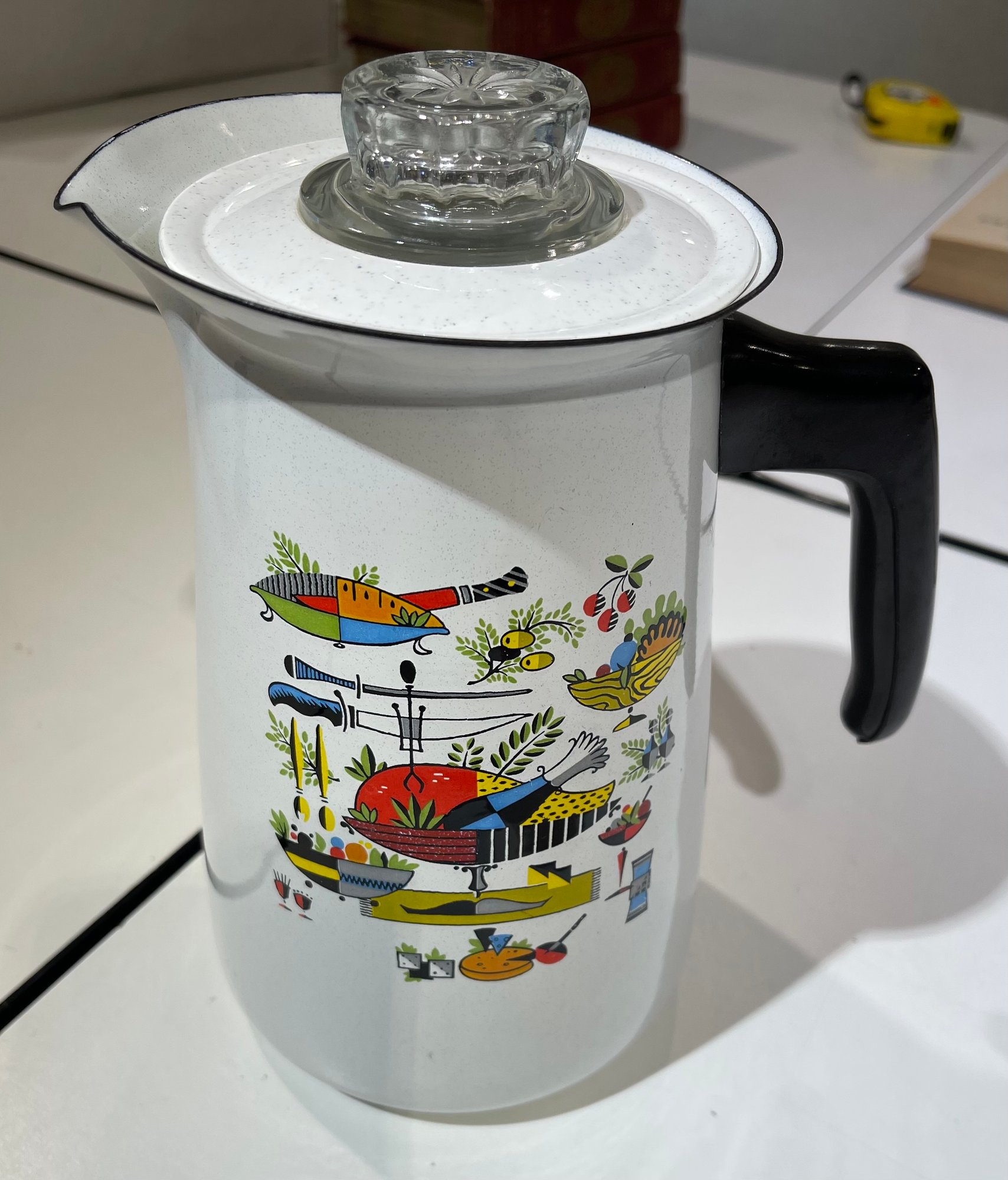 1.5 quart enamelware stovetop coffee pot with all components. Slight wear on the bottom, otherwise this is in pristine condition. Made by Berggren of Sweden in the 1950s/60, the “turkey” pattern is attributed to the designer Georges Briand.