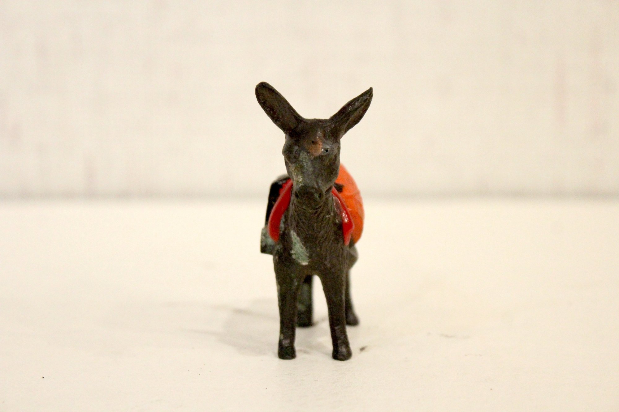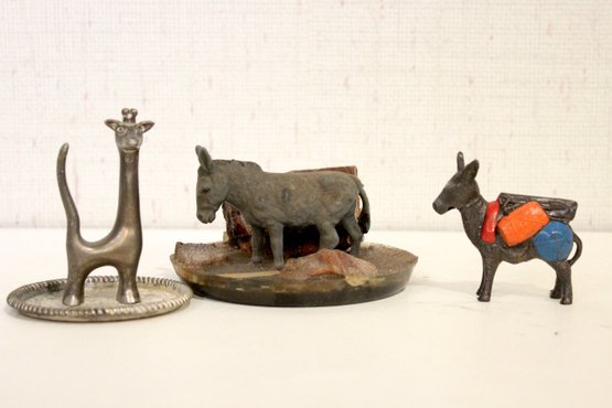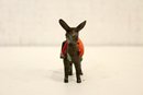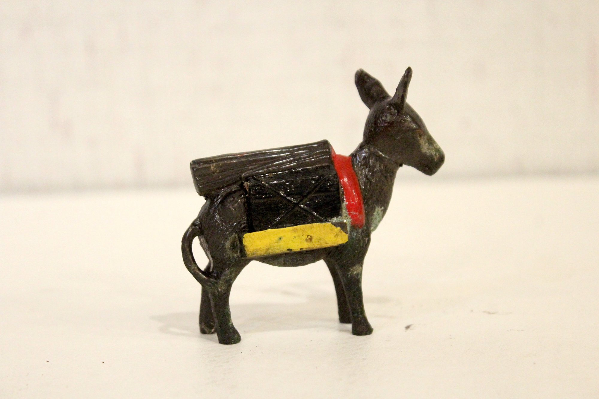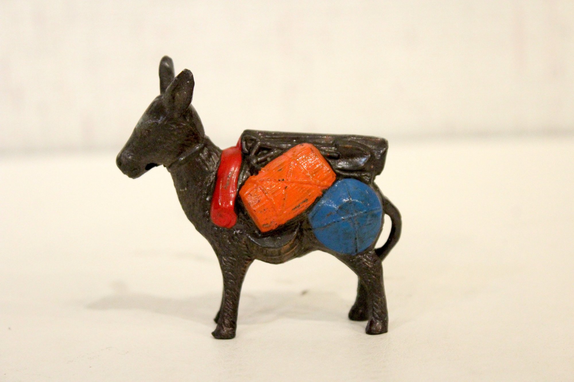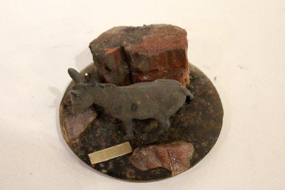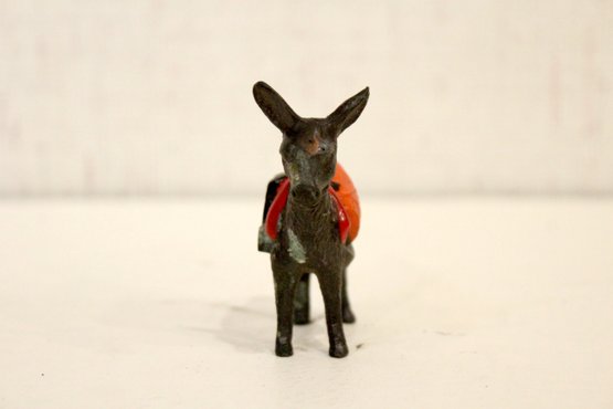 A vintage cast metal pack mule or burro figurine, often a souvenir item, 3" x 3"