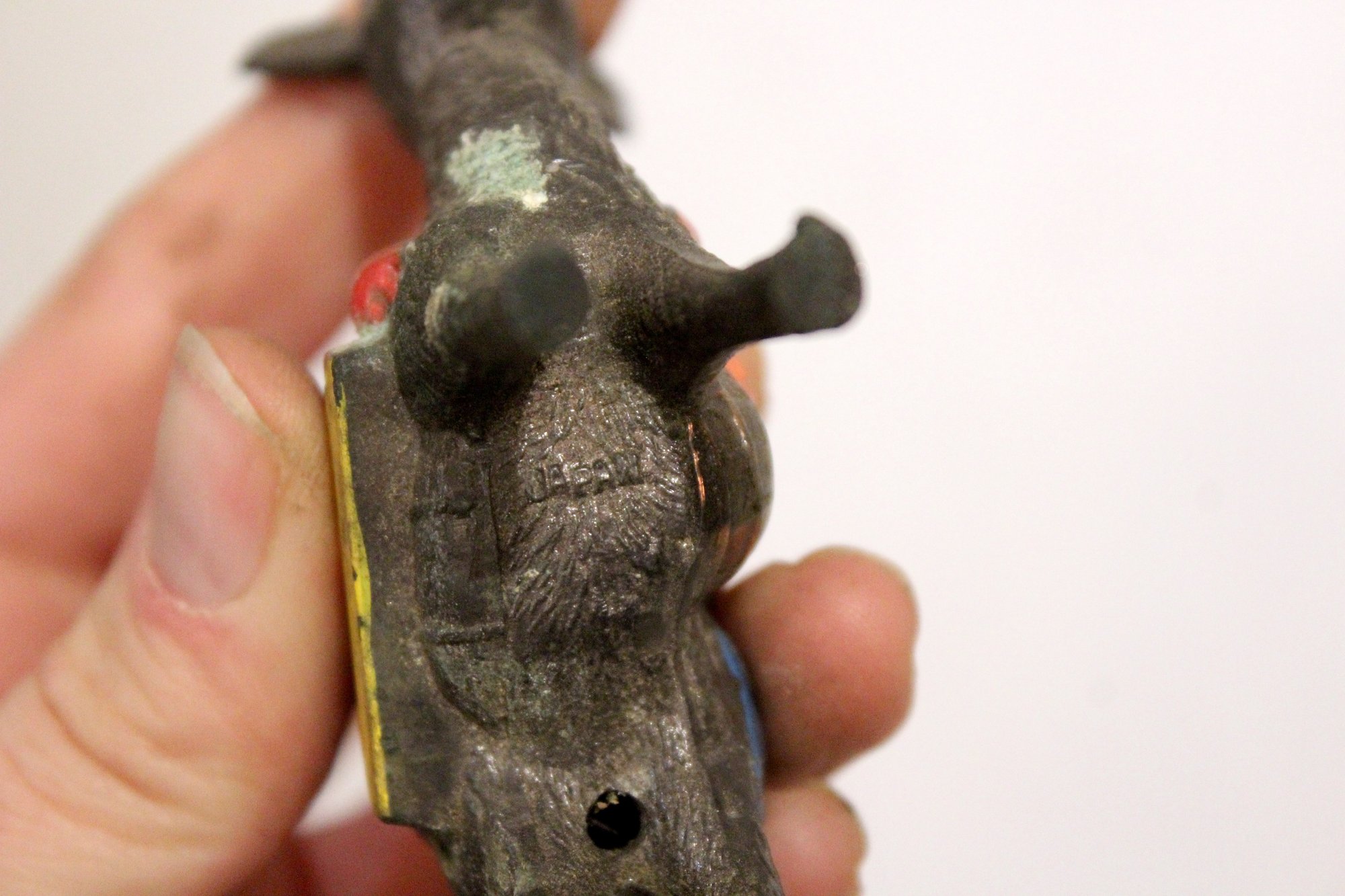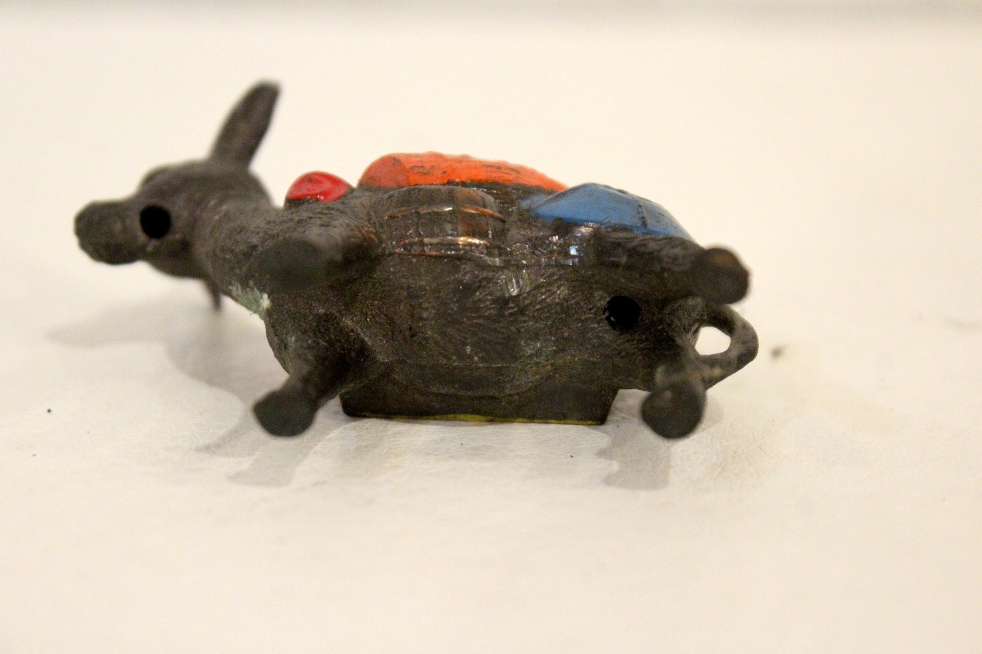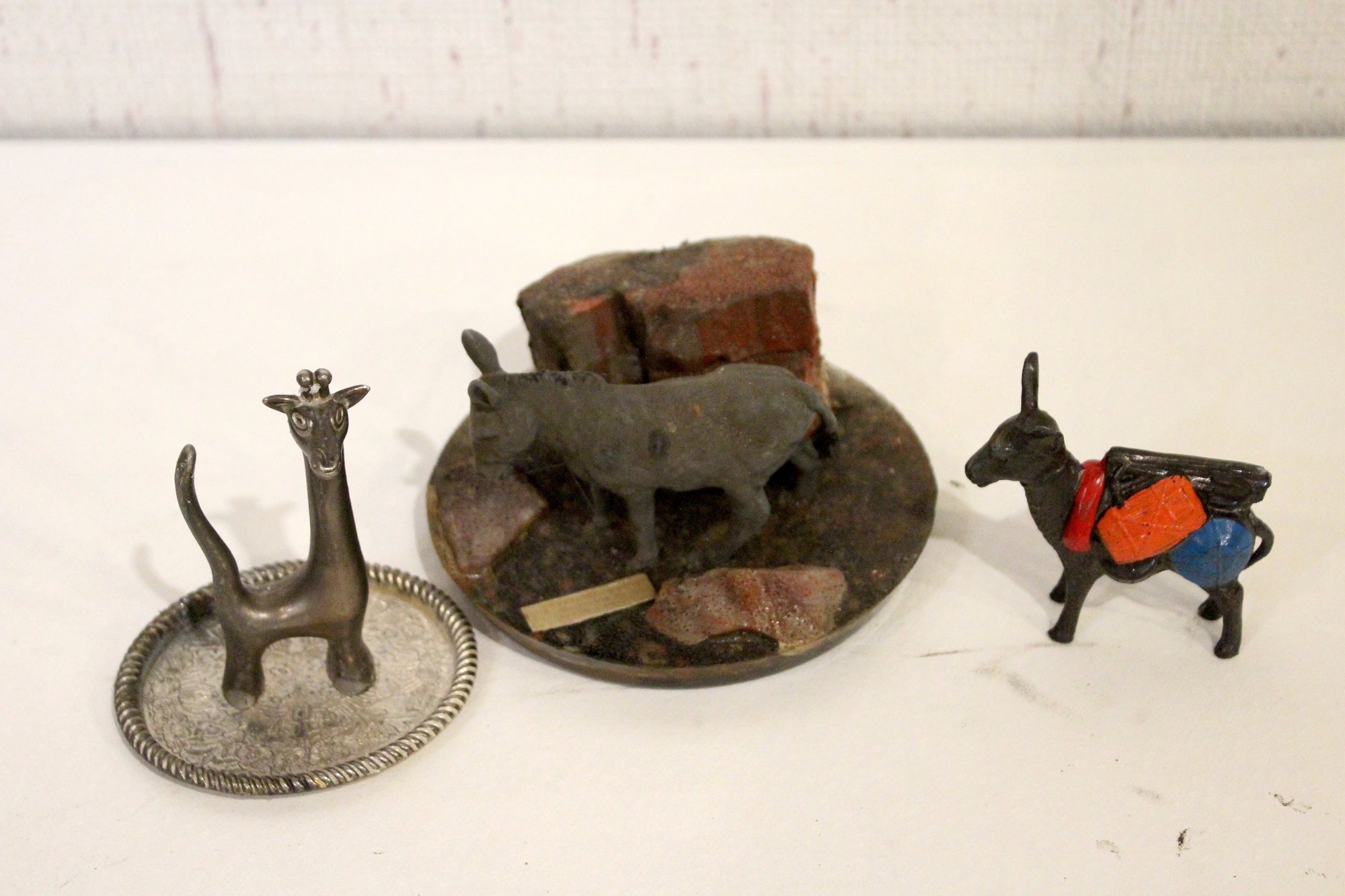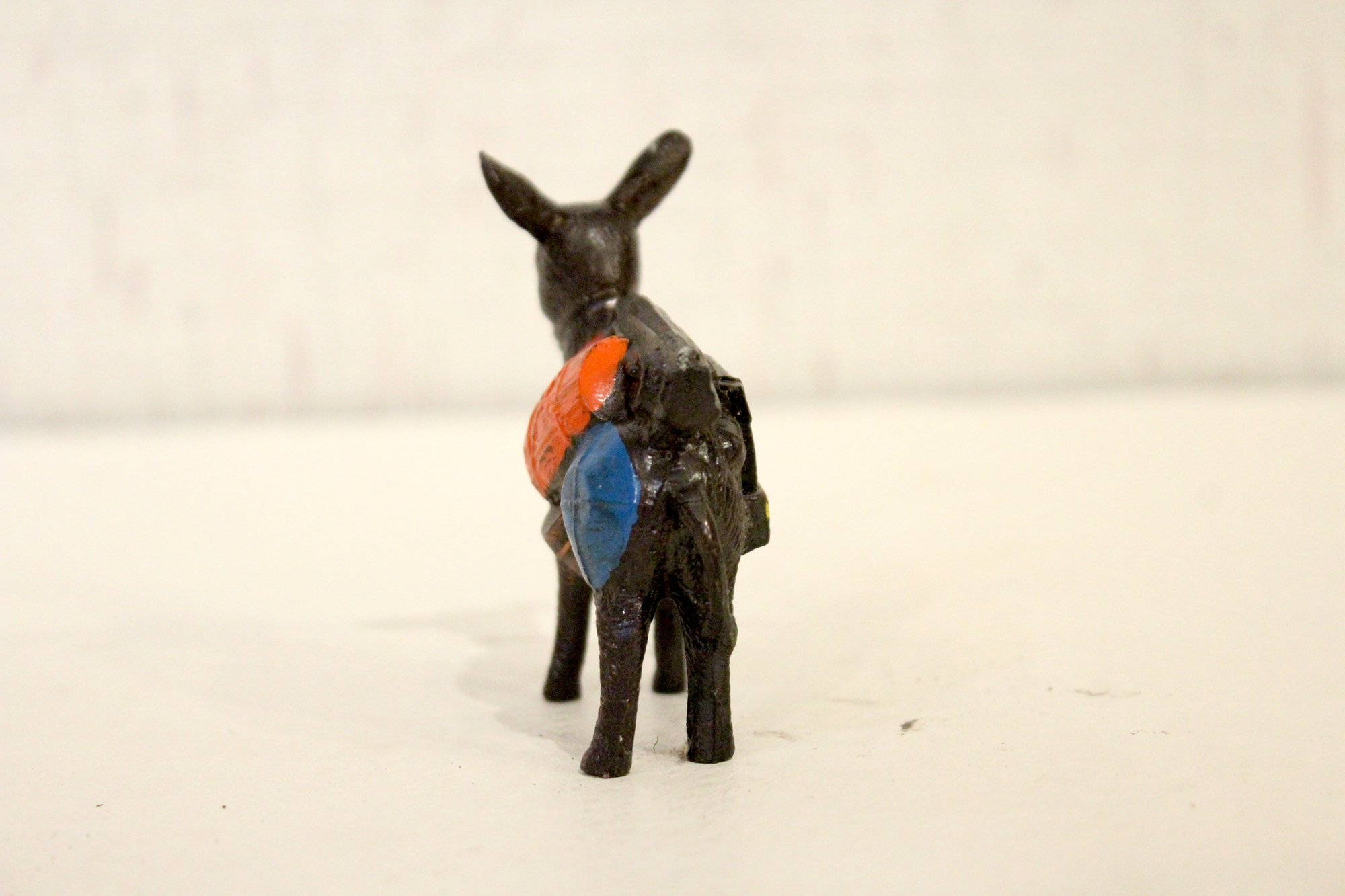 A vintage cast metal pack mule or burro figurine, often a souvenir item, 3" x 3"