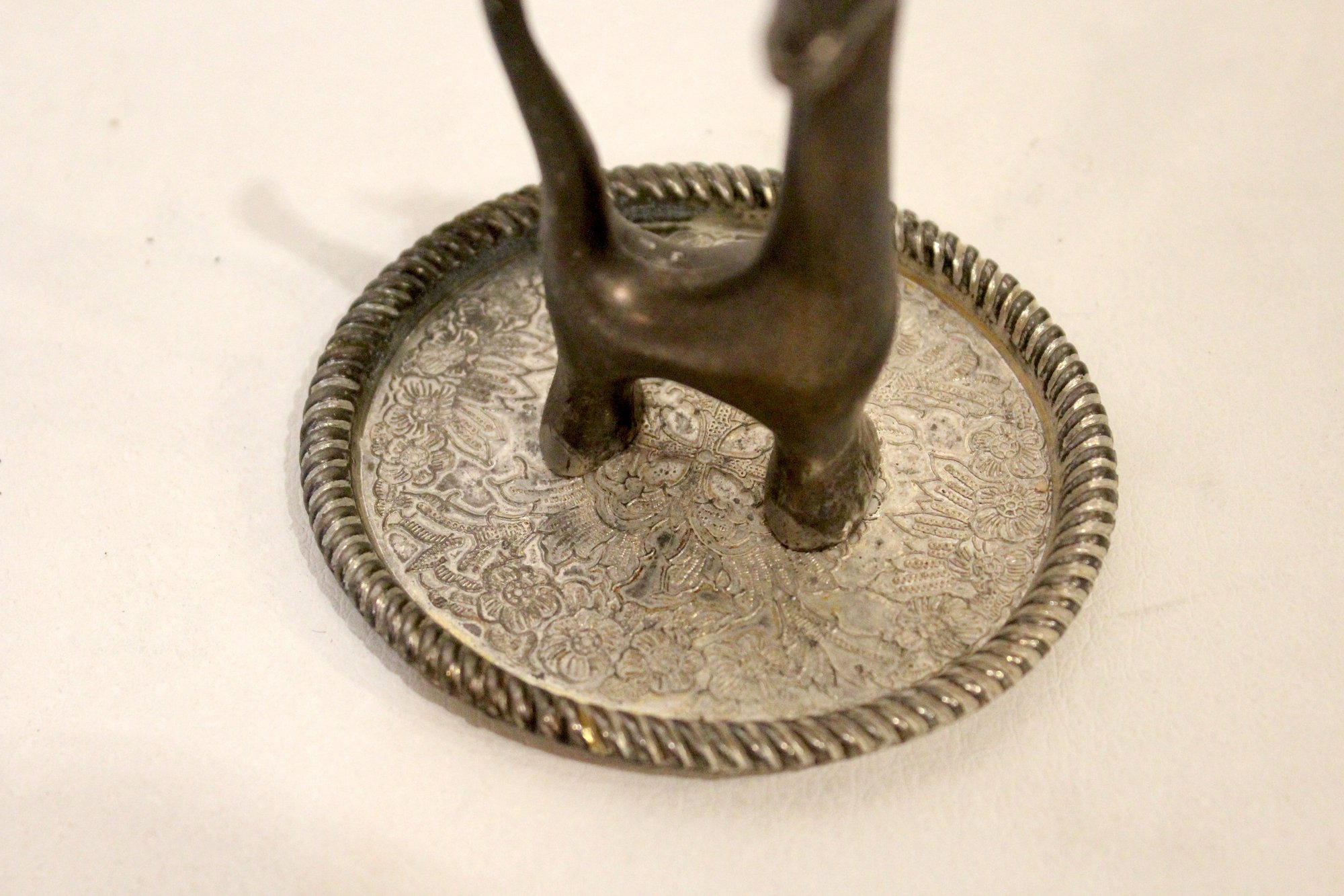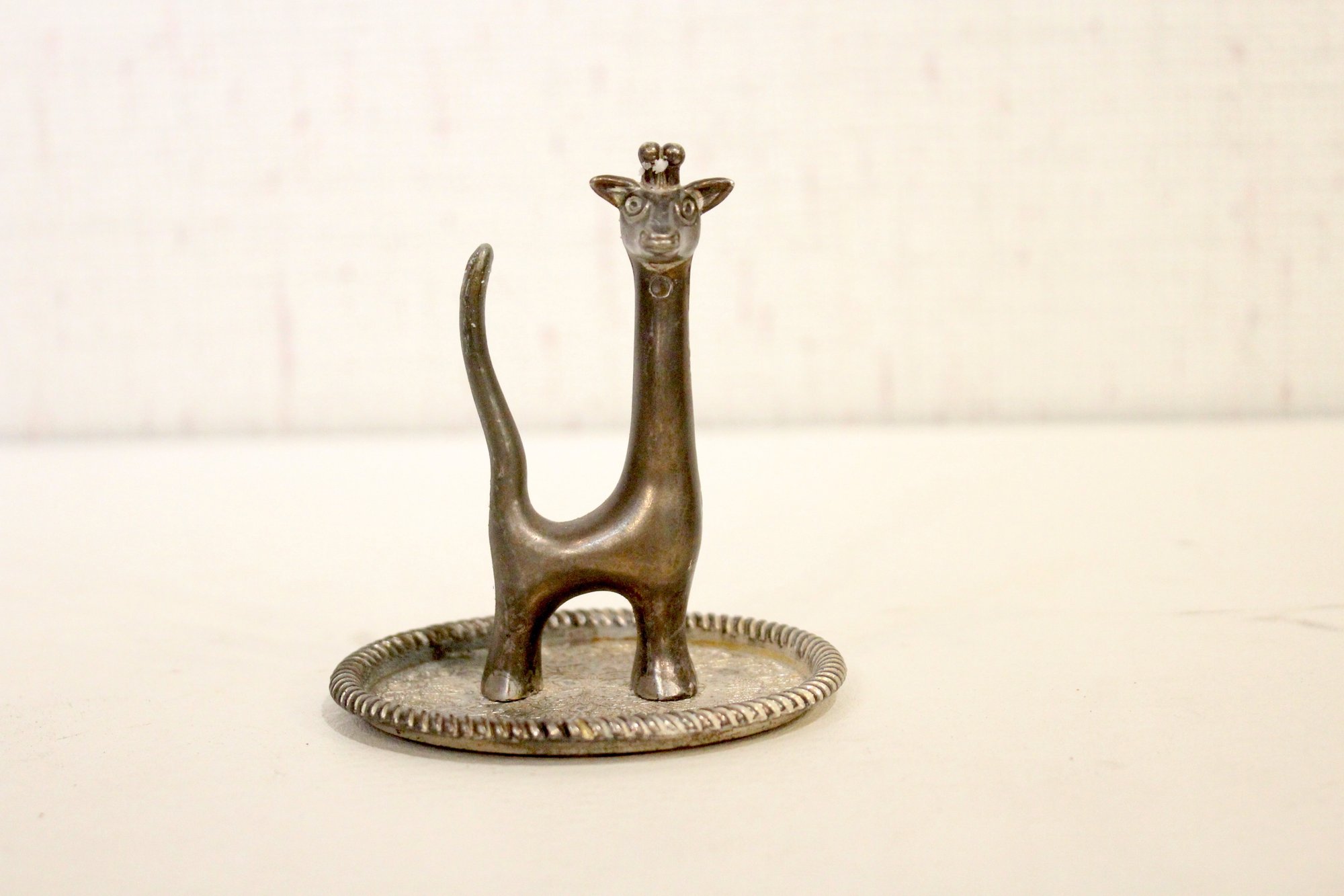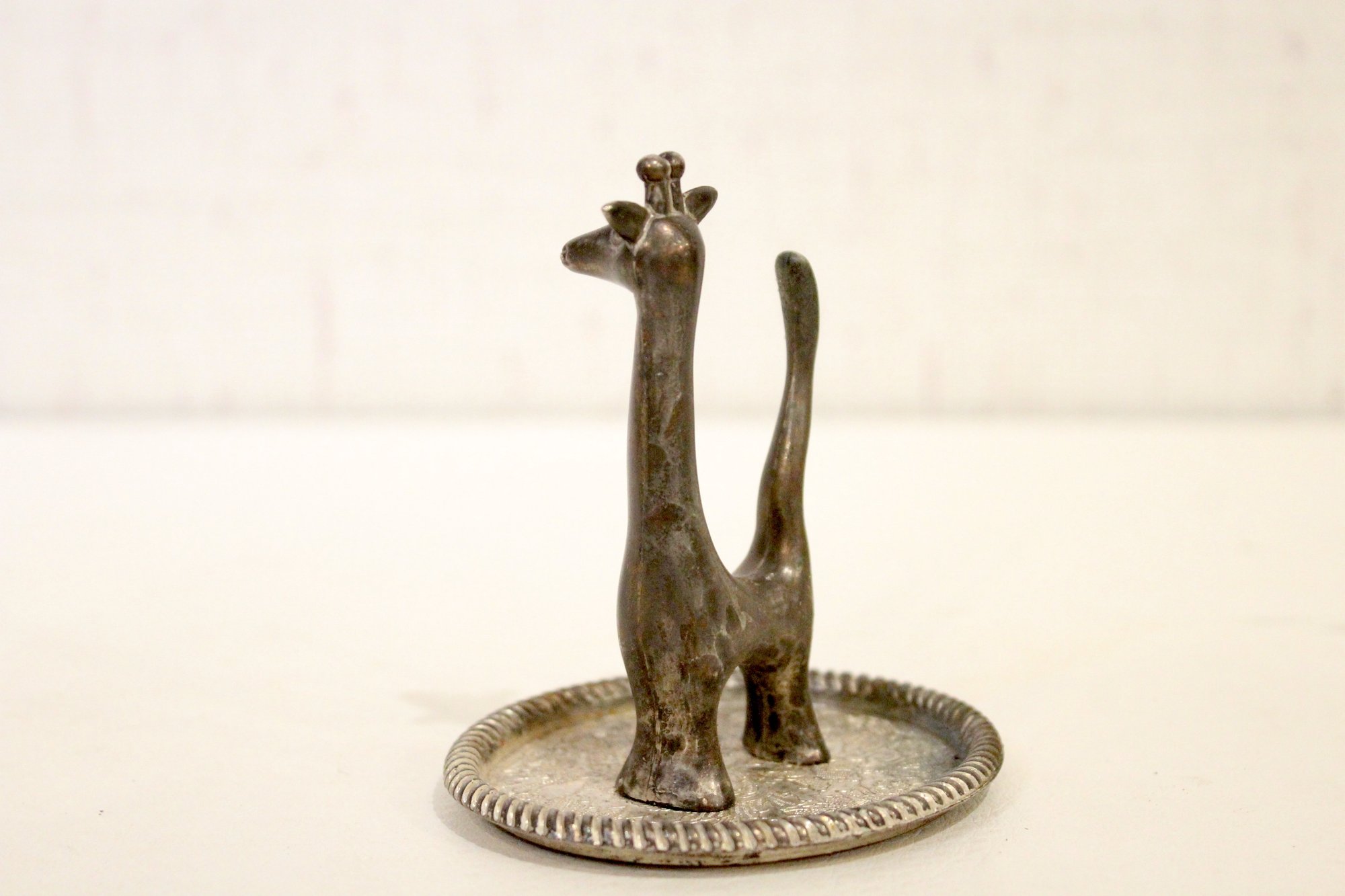 A vintage silver-toned giraffe ring holder, 4"