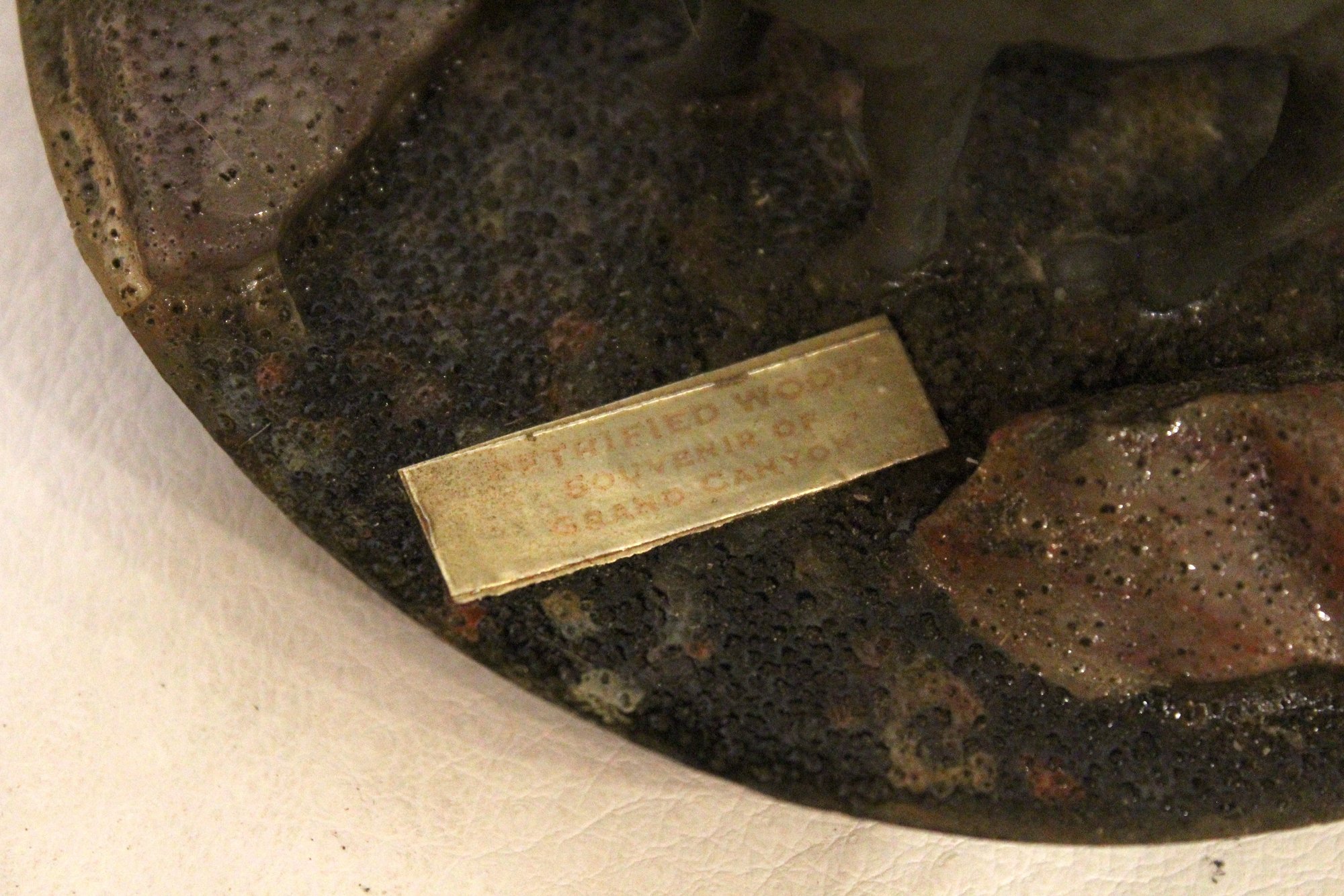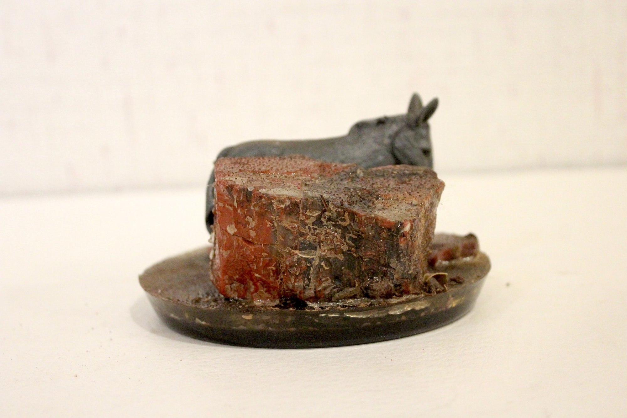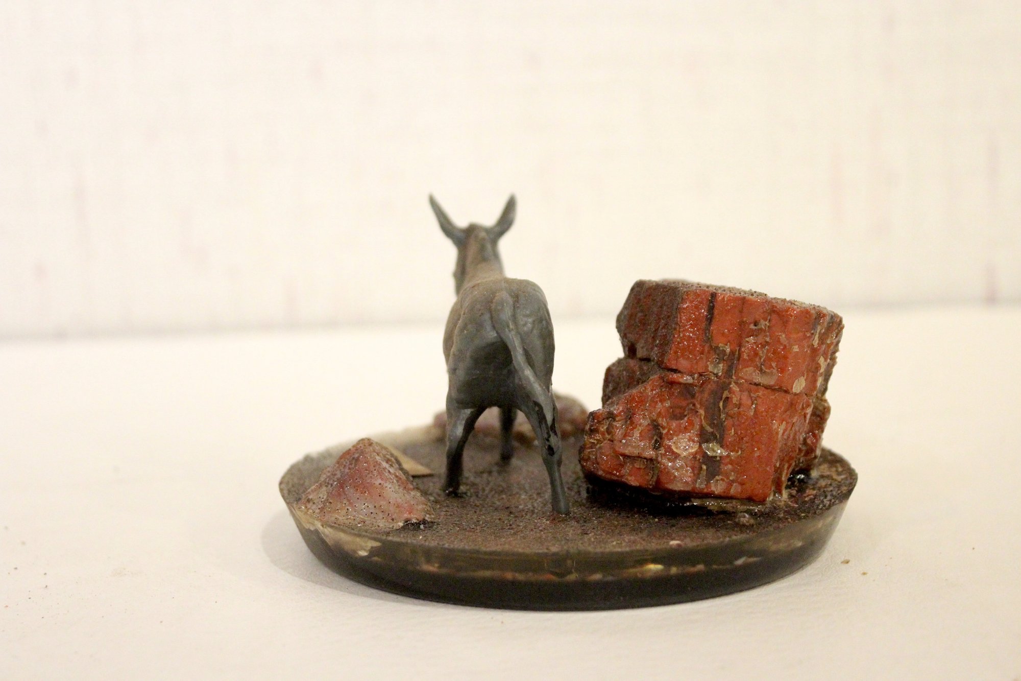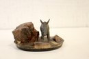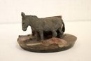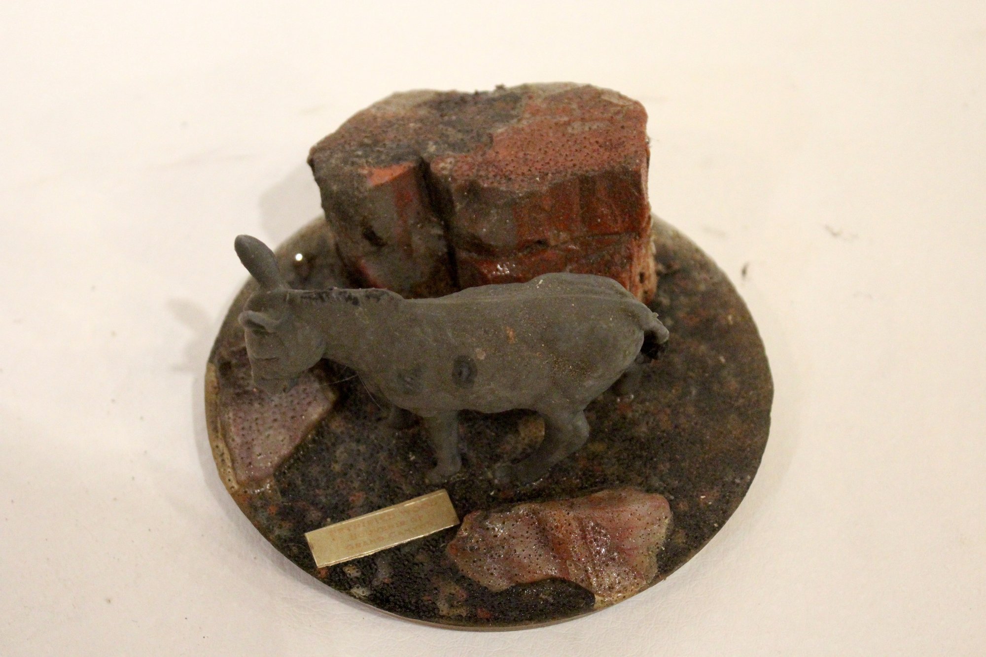 vintage souvenir paperweight featuring a donkey figure and pieces of petrified wood, possibly from the Grand Canyon or Arizona area, 5" x 3"