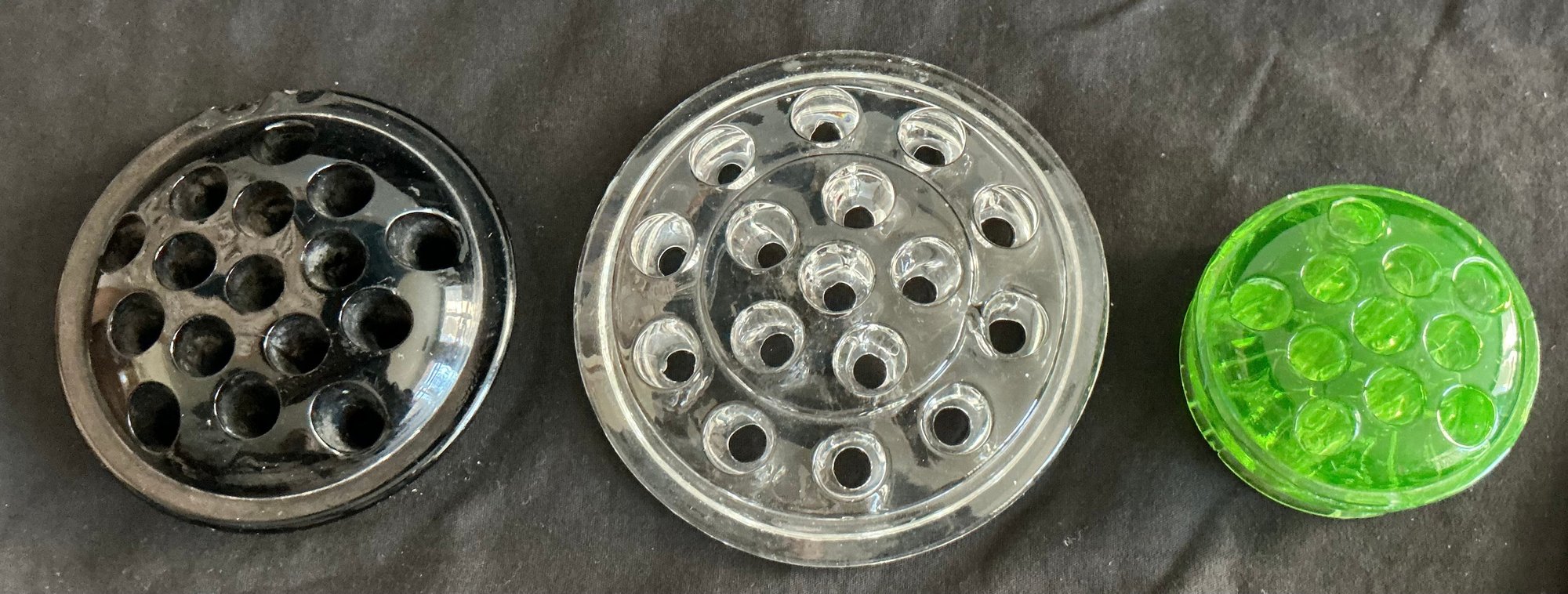 3 vintage glass flower frogs for holding floral designs in a dish or vase. The black frog is 3 1/2” in diameter and has a slight clip on one side as shown in the picture. The clear glass frog is perfect and is 4 1/2 “ diameter. The lime green glass frog is 3” diameter.