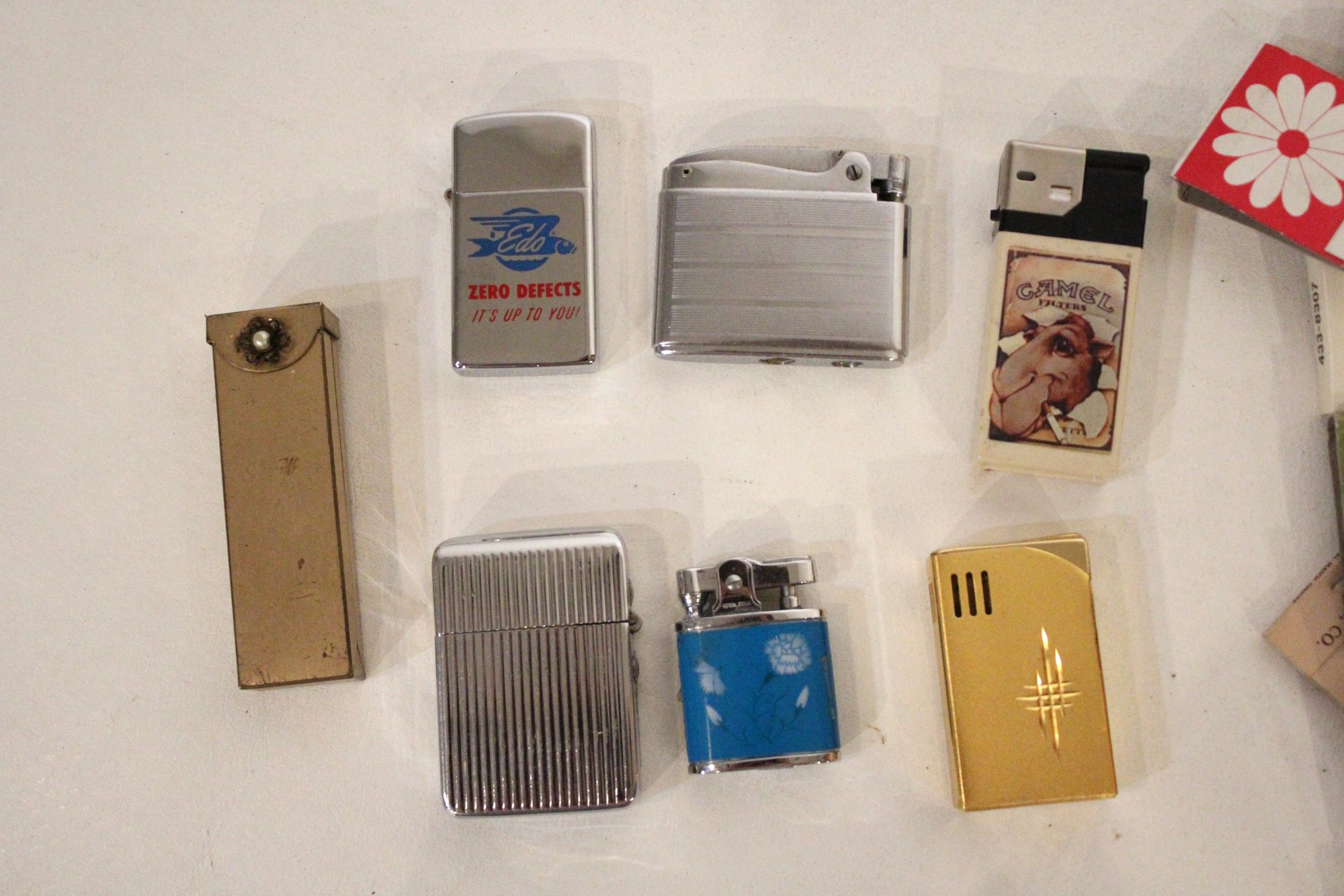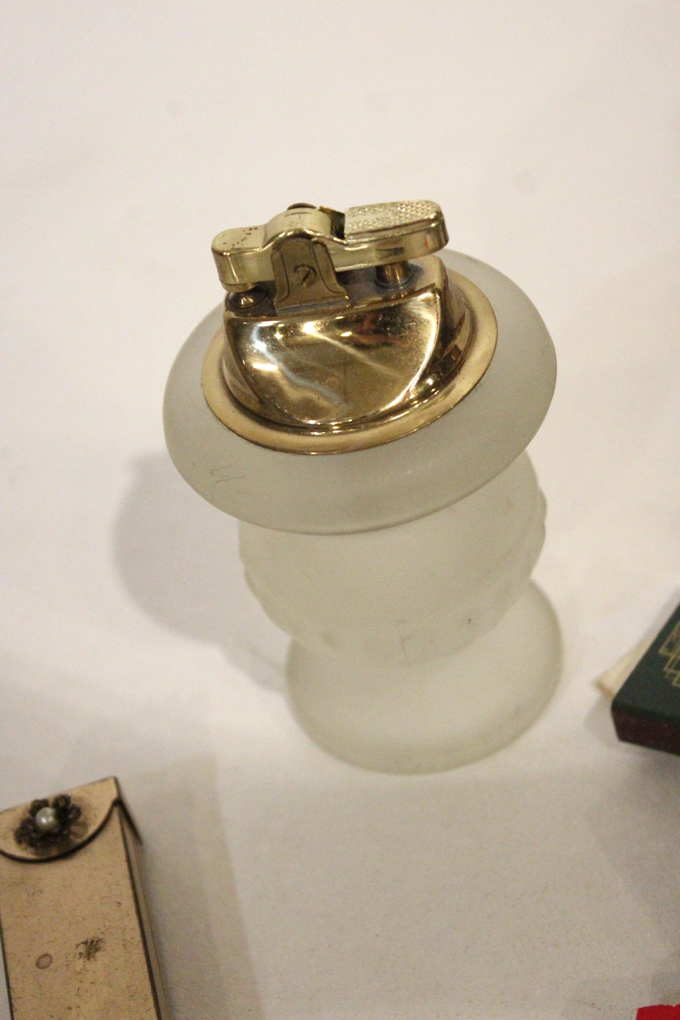 a vintage frosted glass table lighter 4.5" tall, 6 vintage lighters including; a Royal Star or similar Japanese-made automatic lighter and vintage automatic or flip-top lighter, 1 gold toned case, and a large pile of vintage matches. These items can be shipped.