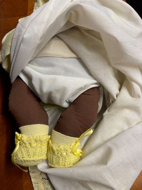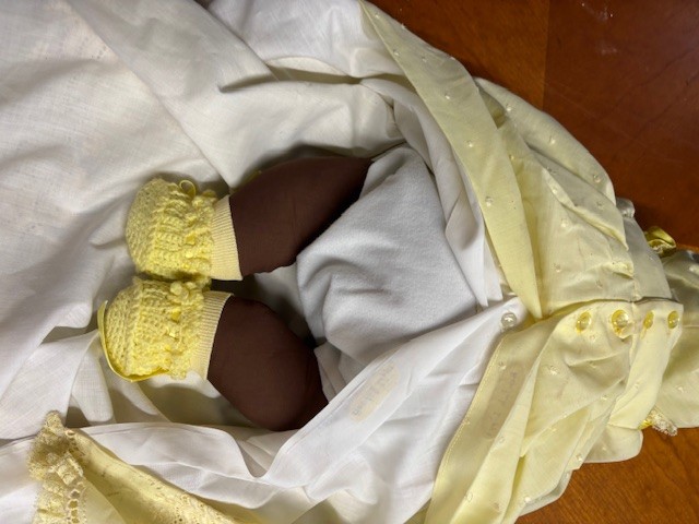 Vintage Grace S Putnam porcelain/ Bisque baby doll. Doll is dressed in a long yellow gown and bonnet with crochet booties and cloth under garments. This item will ship