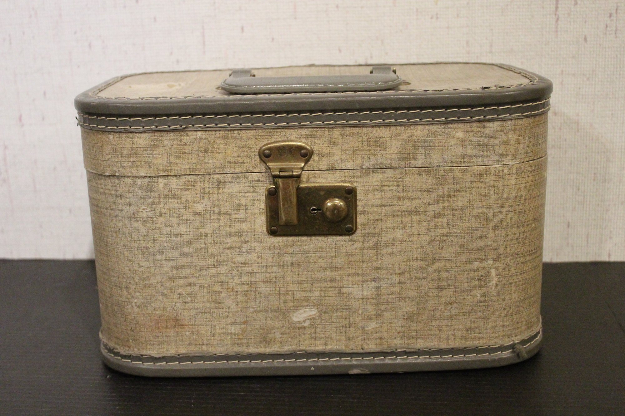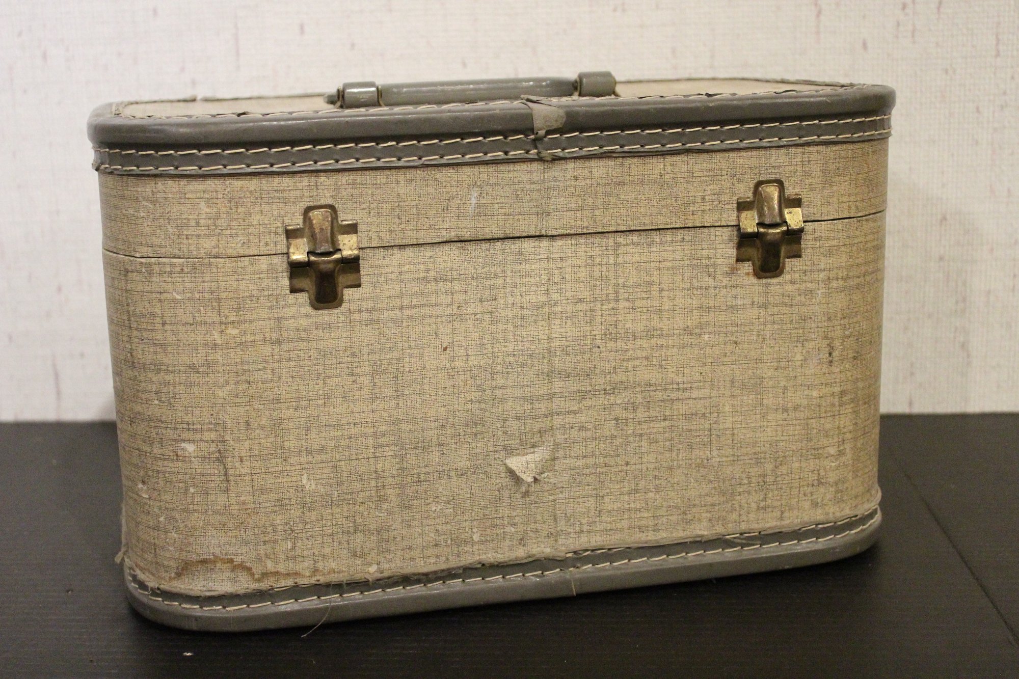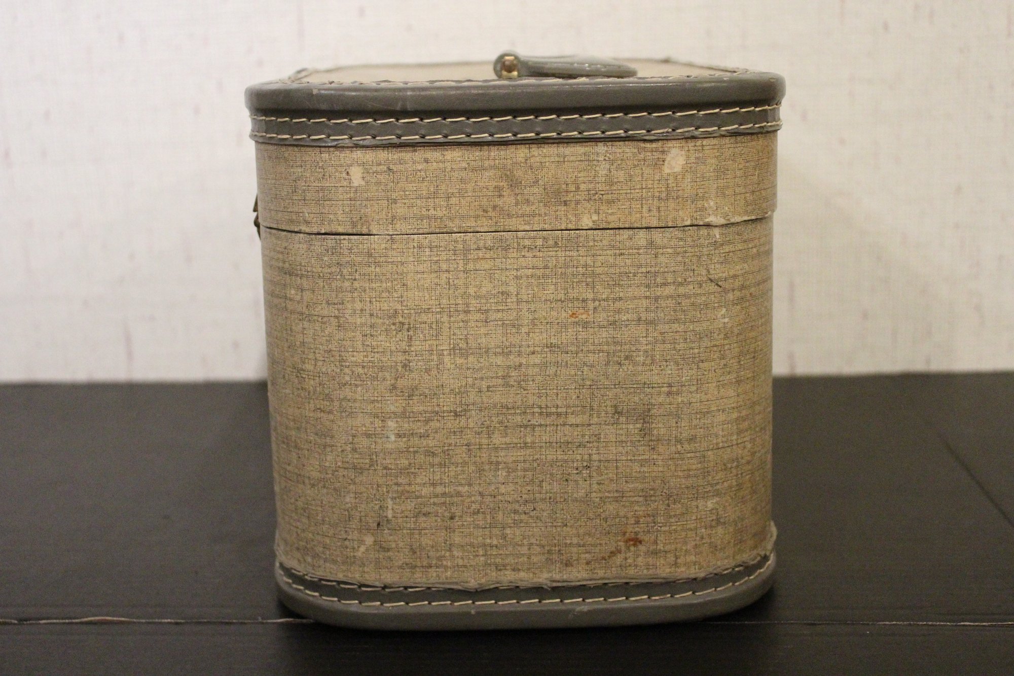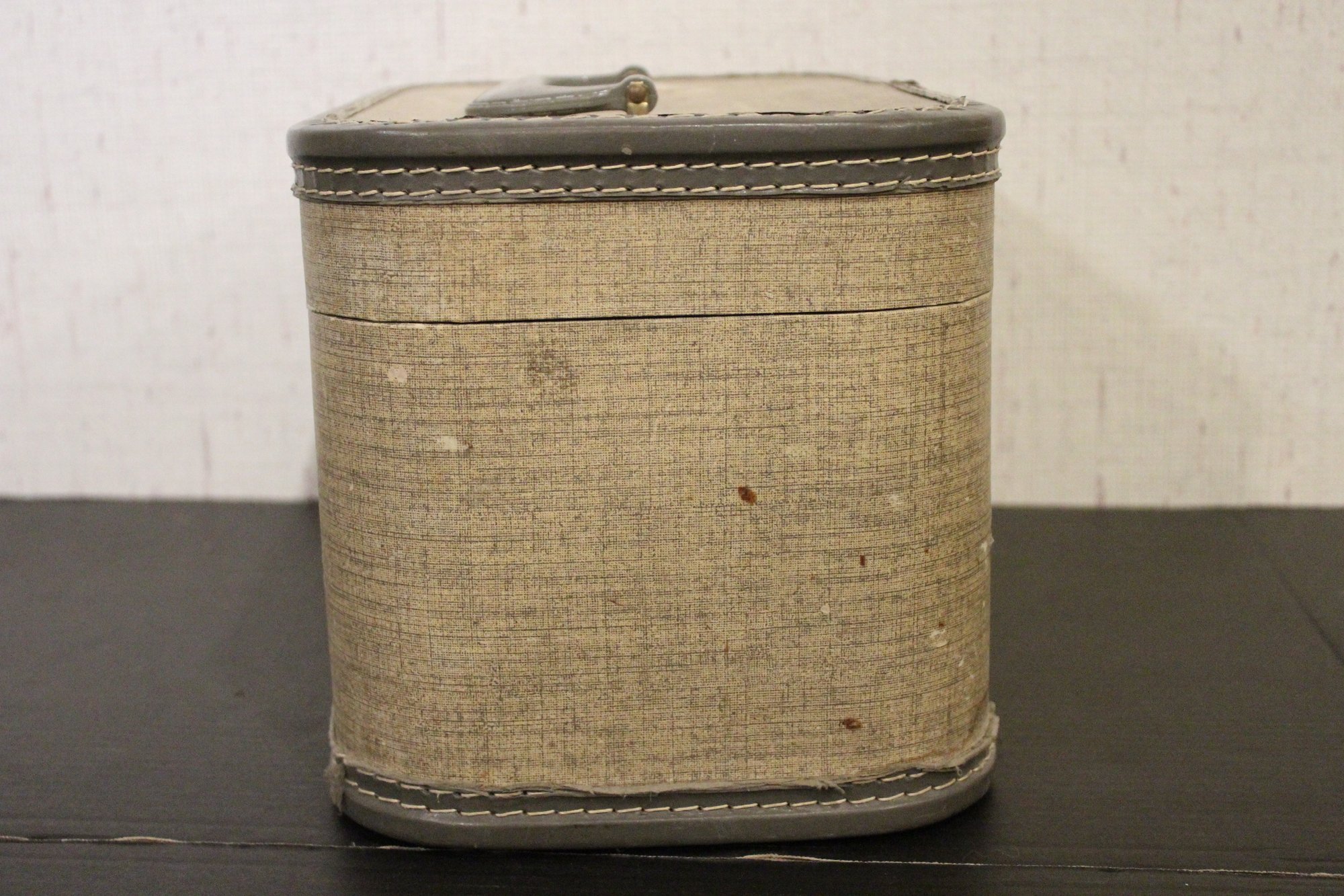 A vintage gray tweed train case, 8.5" x 8.5" x 13". These items can be shipped.