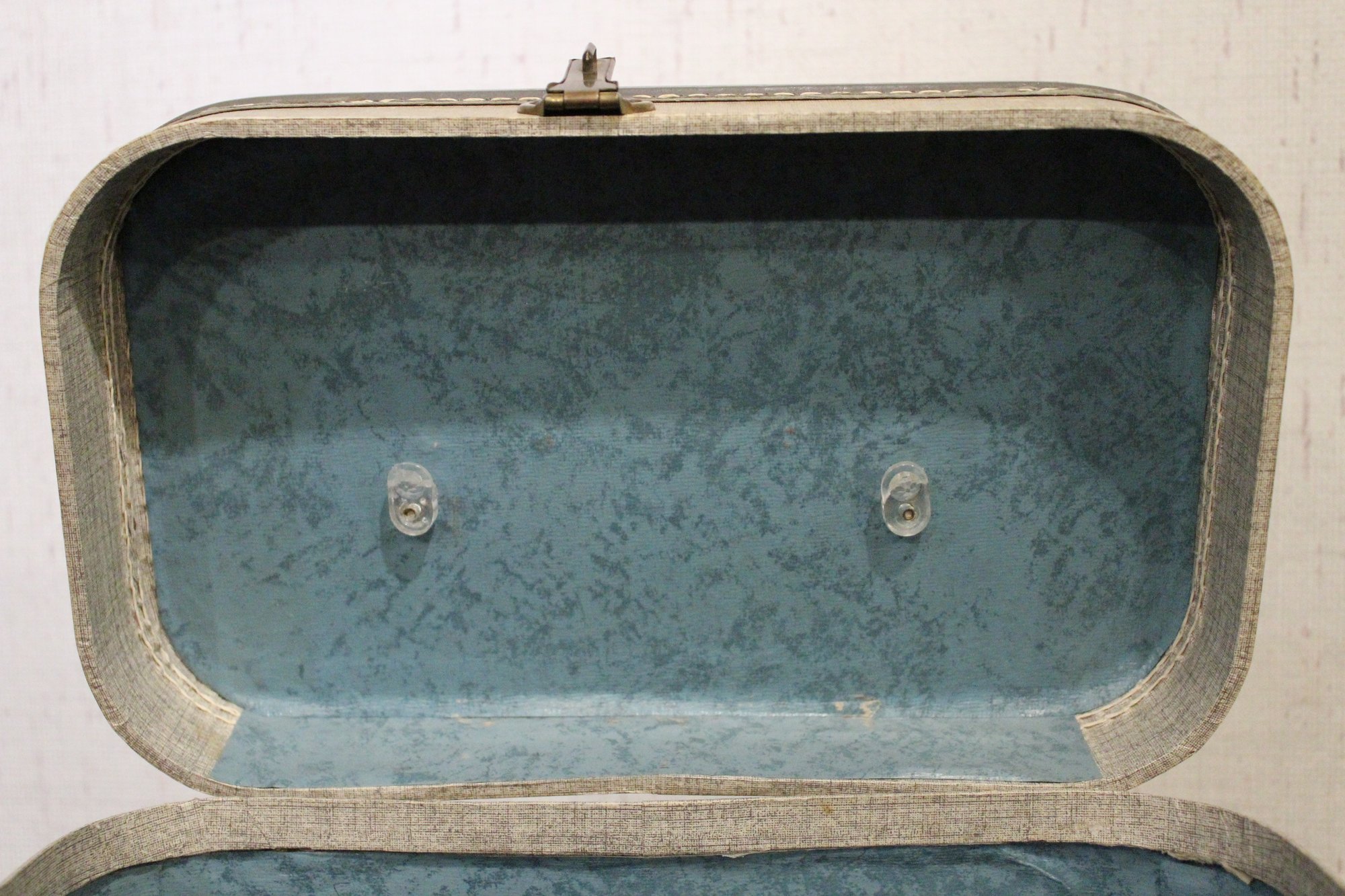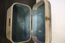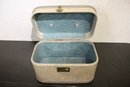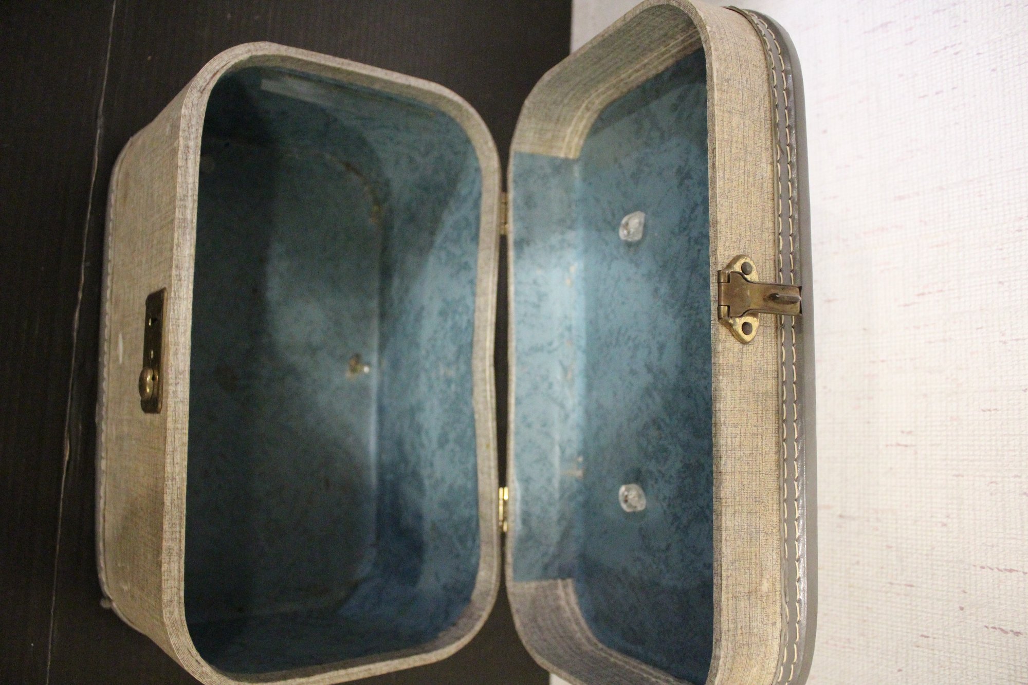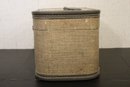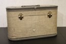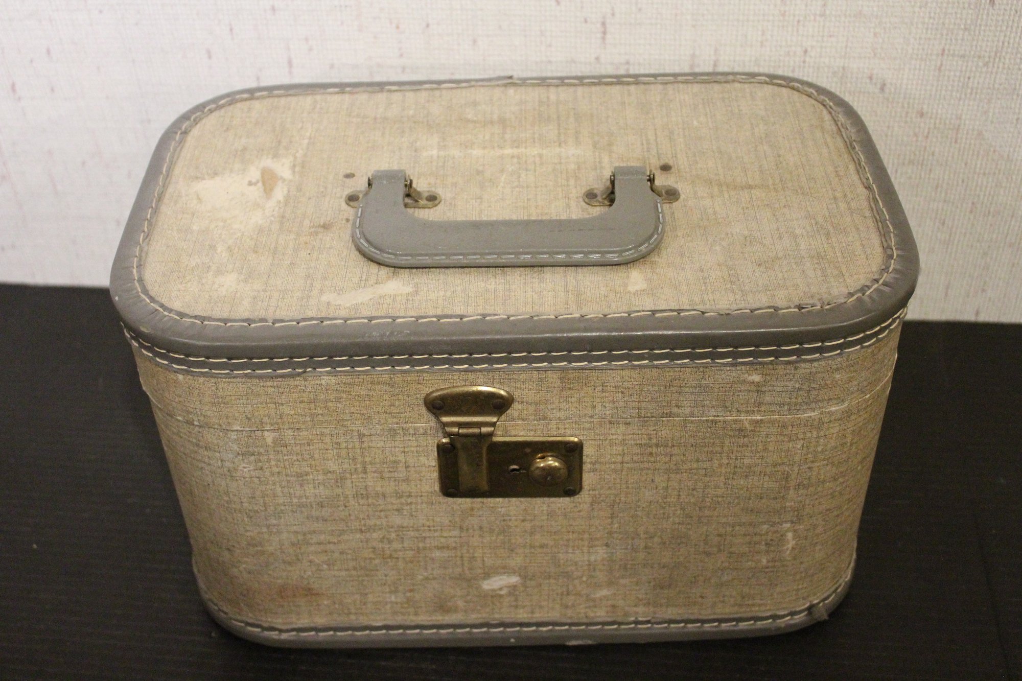A vintage gray tweed train case, 8.5" x 8.5" x 13". These items can be shipped.