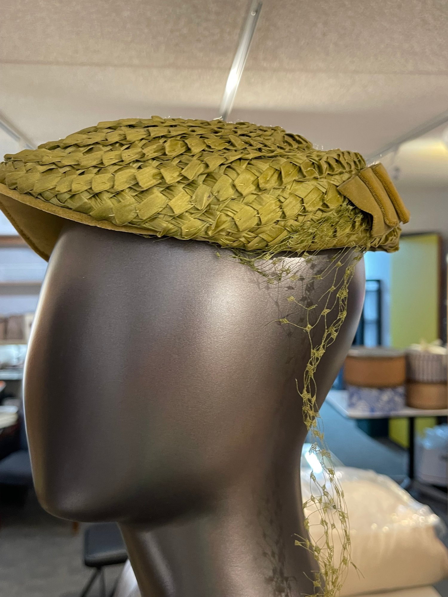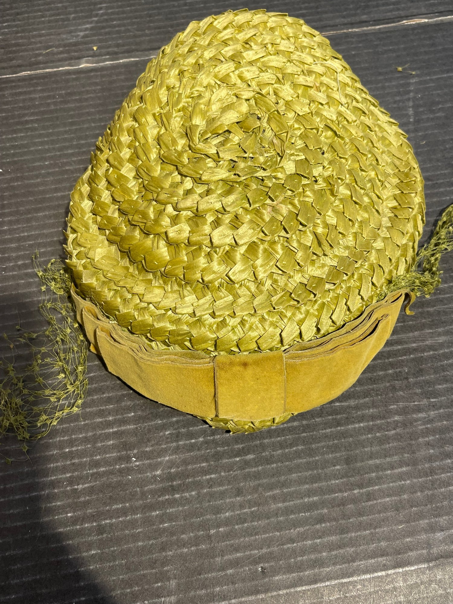 green woven straw hat with ribbon trim and netting